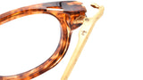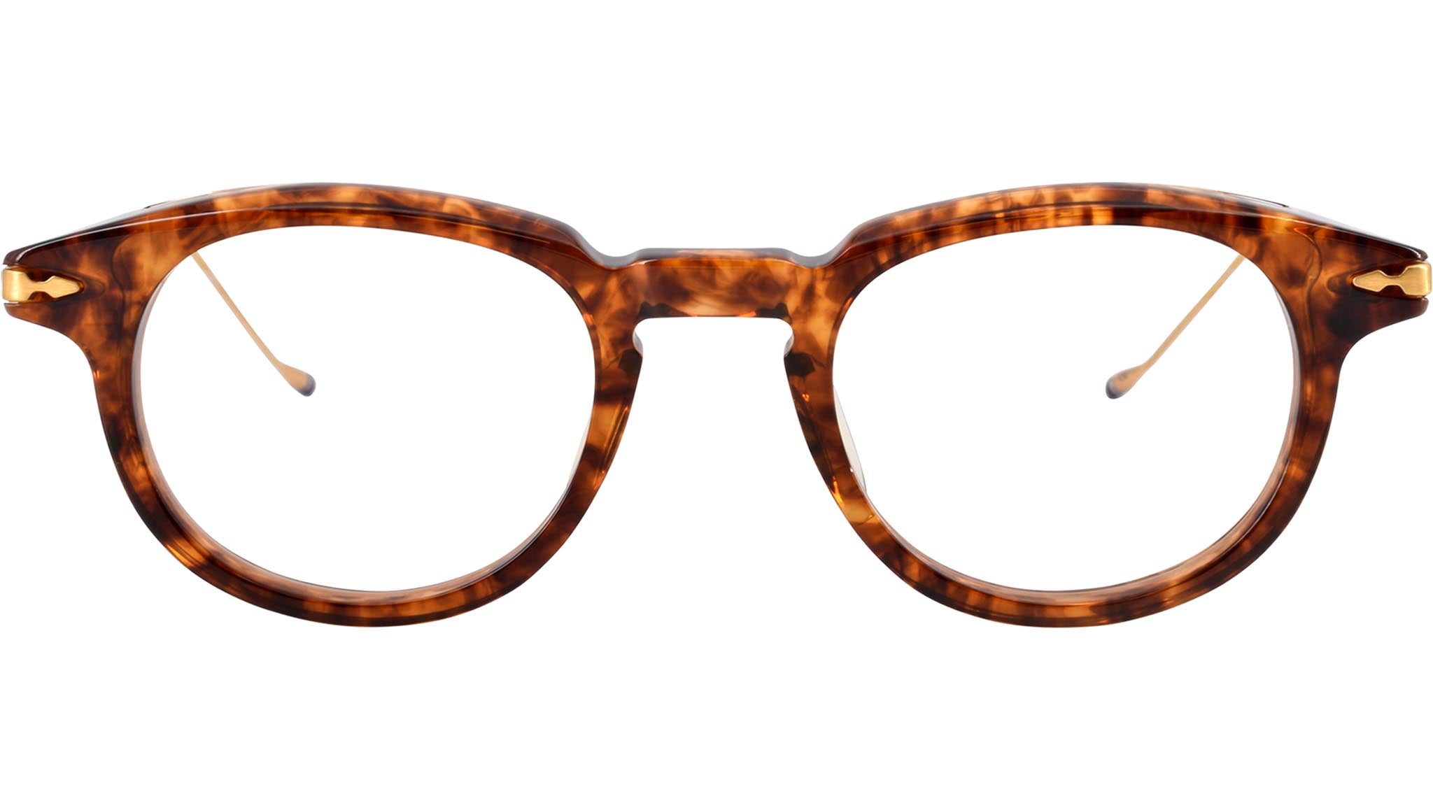 An easy-to-wear oval shape with keyhole nose bridge. Features the new JMM hinge construction, with decorative front pins that seamlessly attached to - and move with - the hinge. Titanium temples feature Native American-inspired filigree designs and an updated temple tip shape with signature burgundy epoxy detail. Gold 100% beta titanium temples and 4mm acetate front with clear lenses. Monoblock titanium hinge construction. Argyle acetate front, gold hardware. Demo lens CR-39.