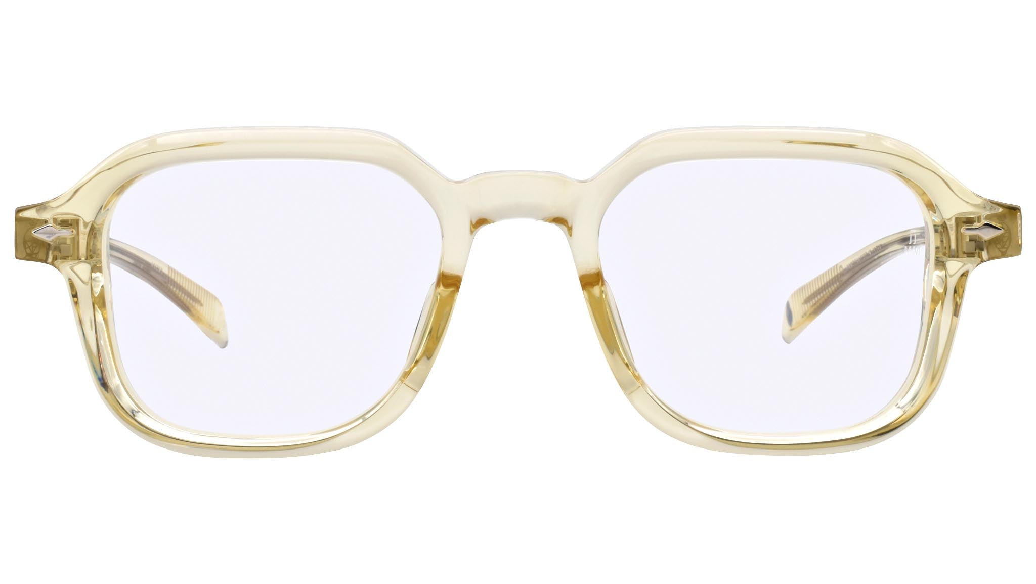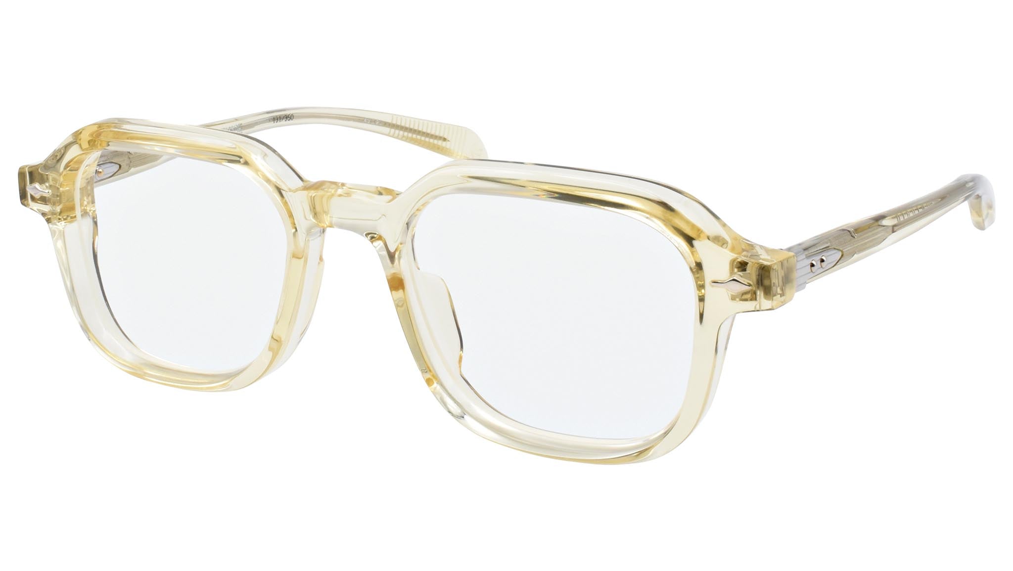 Champagne polished acetate frame. Custom double laminated acetate temples. Silver precious metal hardware. Silver signature arrowhead front pin. Silver tension-secured custom 9-barrel hinge with spur-shaped rivets. 4 base demo Lens. Handcrafted in Japan.