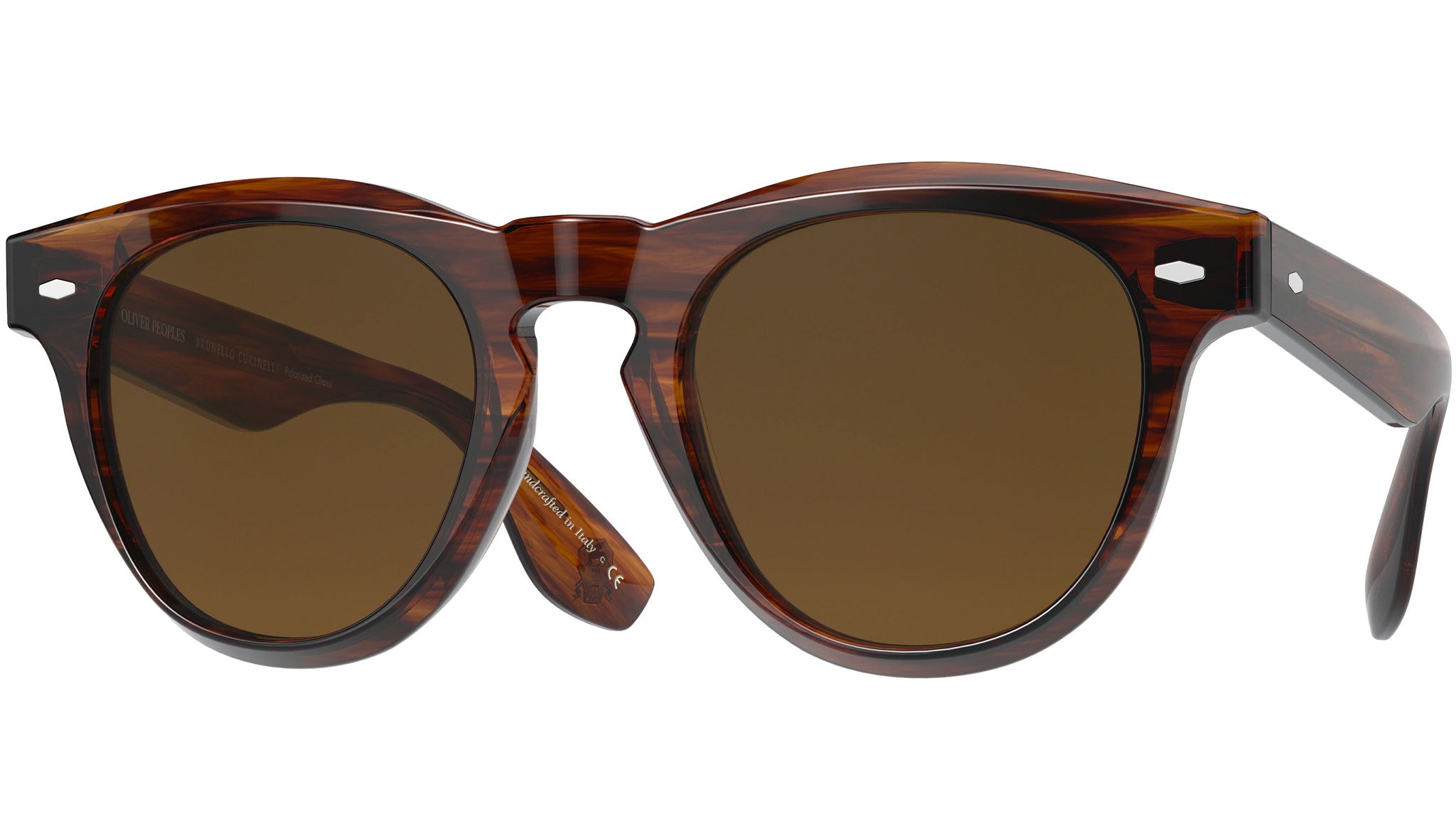 Nino è un modello unisex di ispirazione vintage. Un modello con ponte a chiave dal look estremamente audace, impreziosito da dettagli esclusivi dedicati alla collaborazione Oliver Peoples Brunello Cucinelli. Placca originale su frontale e aste, realizzata esclusivamente per la collaborazione Oliver Peoples Brunello Cucinelli. Lavorazione a filigrana personalizzata sull’anima in metallo. Le lenti in vetro minerale nelle sfumature di ispirazione vintage presentano un trattamento antiriflesso e protezione 100% contro i raggi UVA/UVB. Con logo Oliver Peoples Brunello Cucinelli visibile in trasparenza. Logo personalizzato con stemma Brunello Cucinelli intarsiato a mano sul terminale di una delle aste.