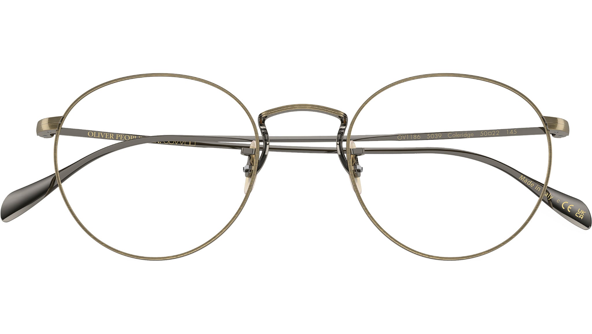 Occhiali da vista Oliver Peoples Coleridge OV1186 5039 uomo con montatura pantos in metallo oro anticato e lenti demo. Naselli regolabili. Linea: Essentials. Codice modello: 0OV1186. Codice colore: 5039. Made in Italy. Rivenditore autorizzato Oliver Peoples online. Gli occhiali vengono consegnati con custodia e accessori originali e sono coperti dalla garanzia ufficiale di 12 mesi del produttore.