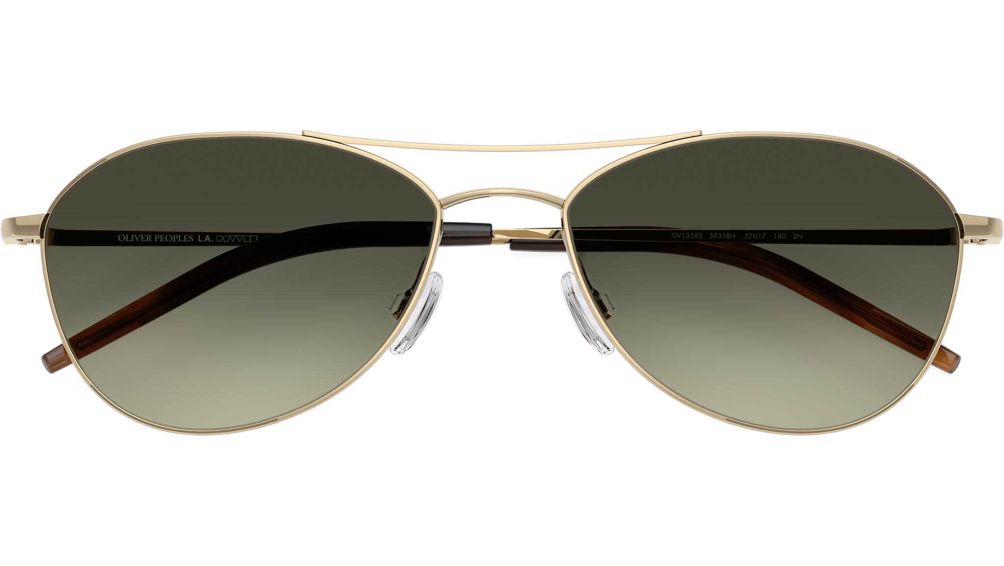 Occhiali da sole Oliver Peoples Aero II OV1358S 5035BH unisex con montatura aviatore in acciaio oro e lenti in cristallo color verde G-15 sfumato. Naselli regolabili. Linea: Archive. Codice modello: 0OV1358S. Codice colore: 5035BH. Made in Italy. Rivenditore autorizzato Oliver Peoples online. Gli occhiali vengono consegnati con custodia e accessori originali e sono coperti dalla garanzia ufficiale di 12 mesi del produttore.