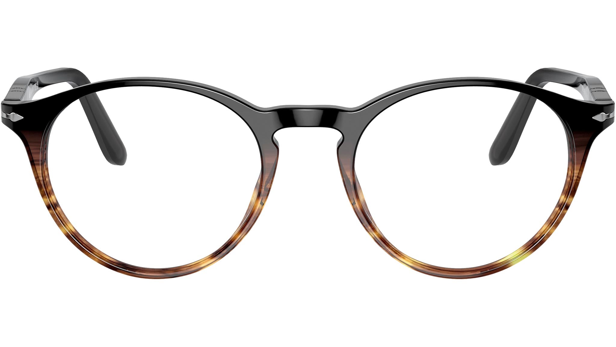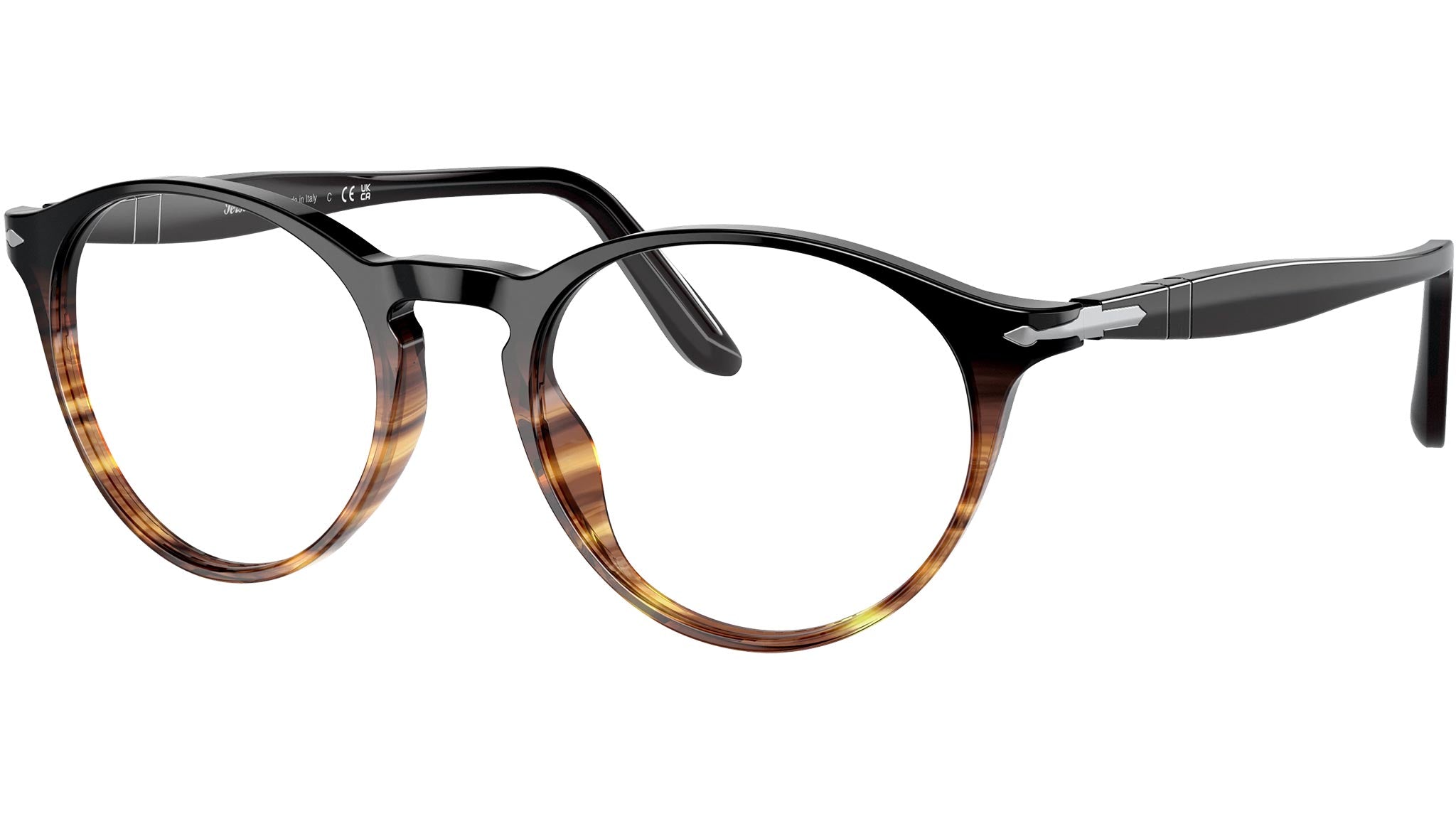Occhiali da vista Persol modello PO3092V codice colore 9052 con montatura full rim in acetato color marrone sfumato bianco striato e lenti demo.