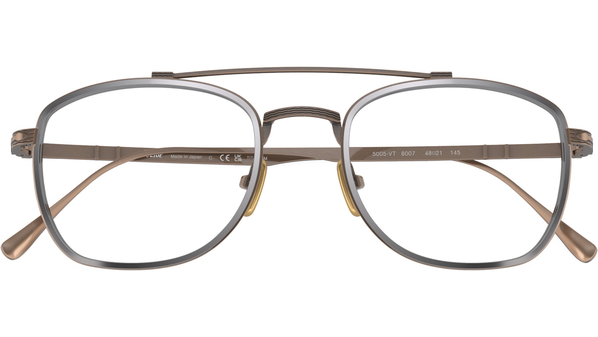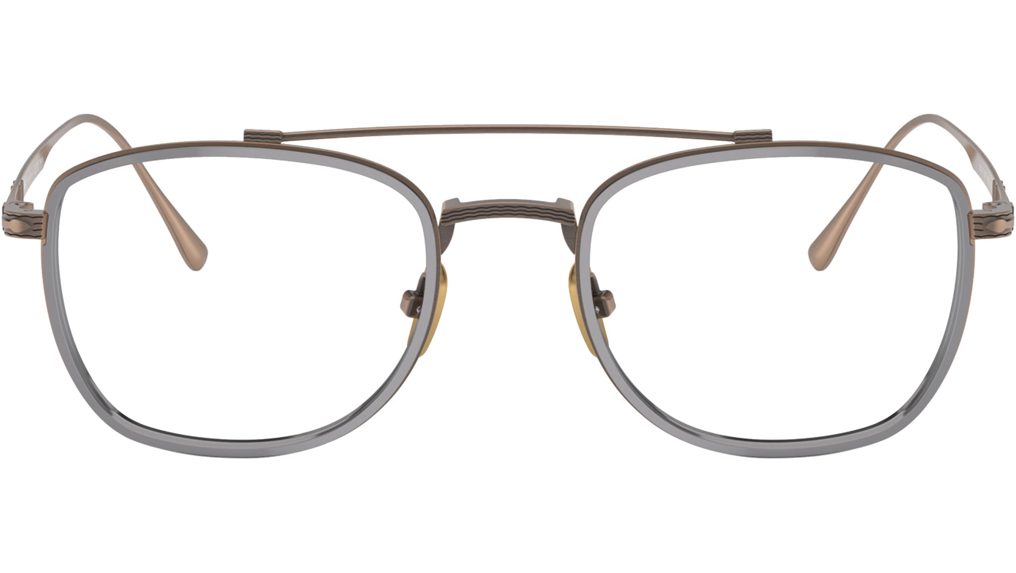 Occhiali da vista Persol modello PO5005VT codice colore 8007 con montatura full rim in titanio color marrone e canna di fucile e lenti demo.