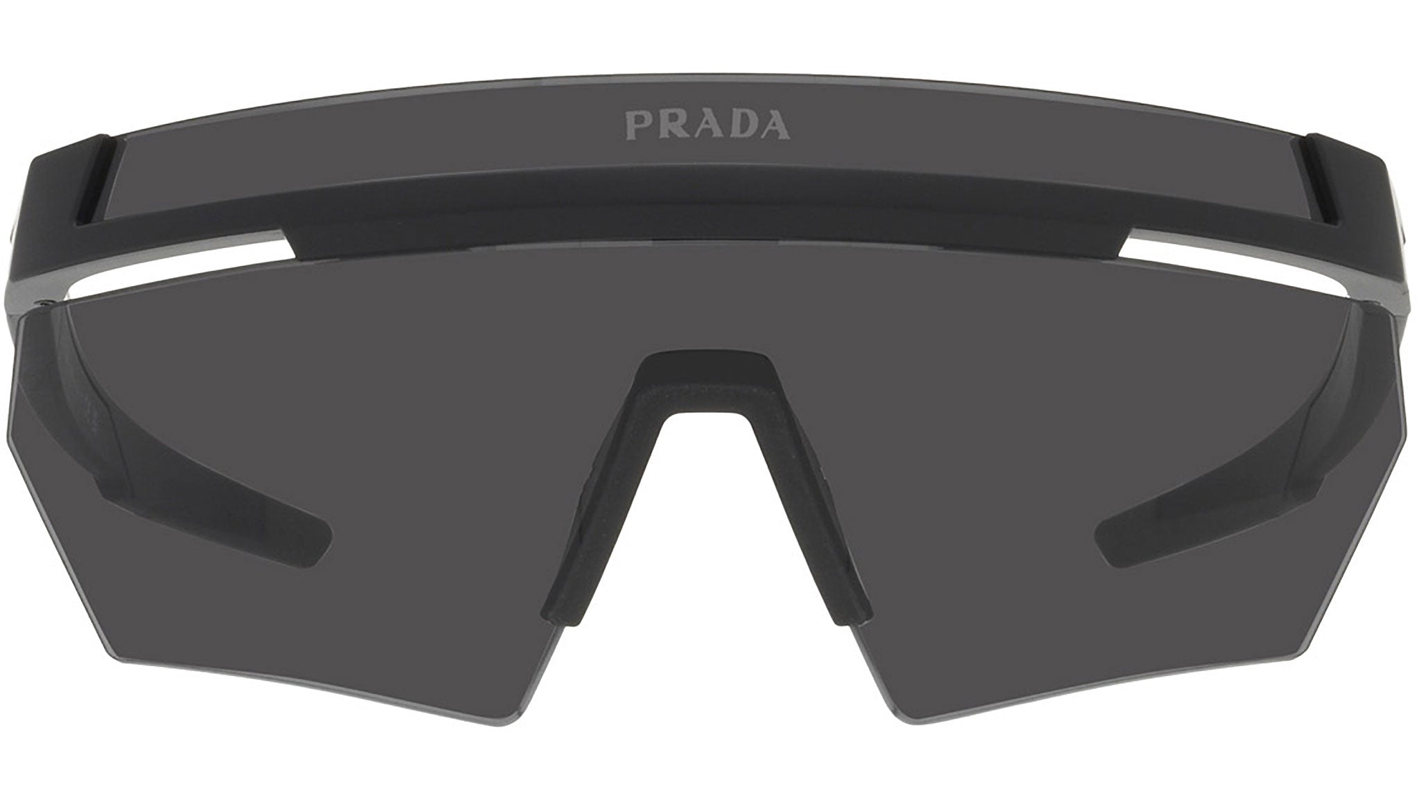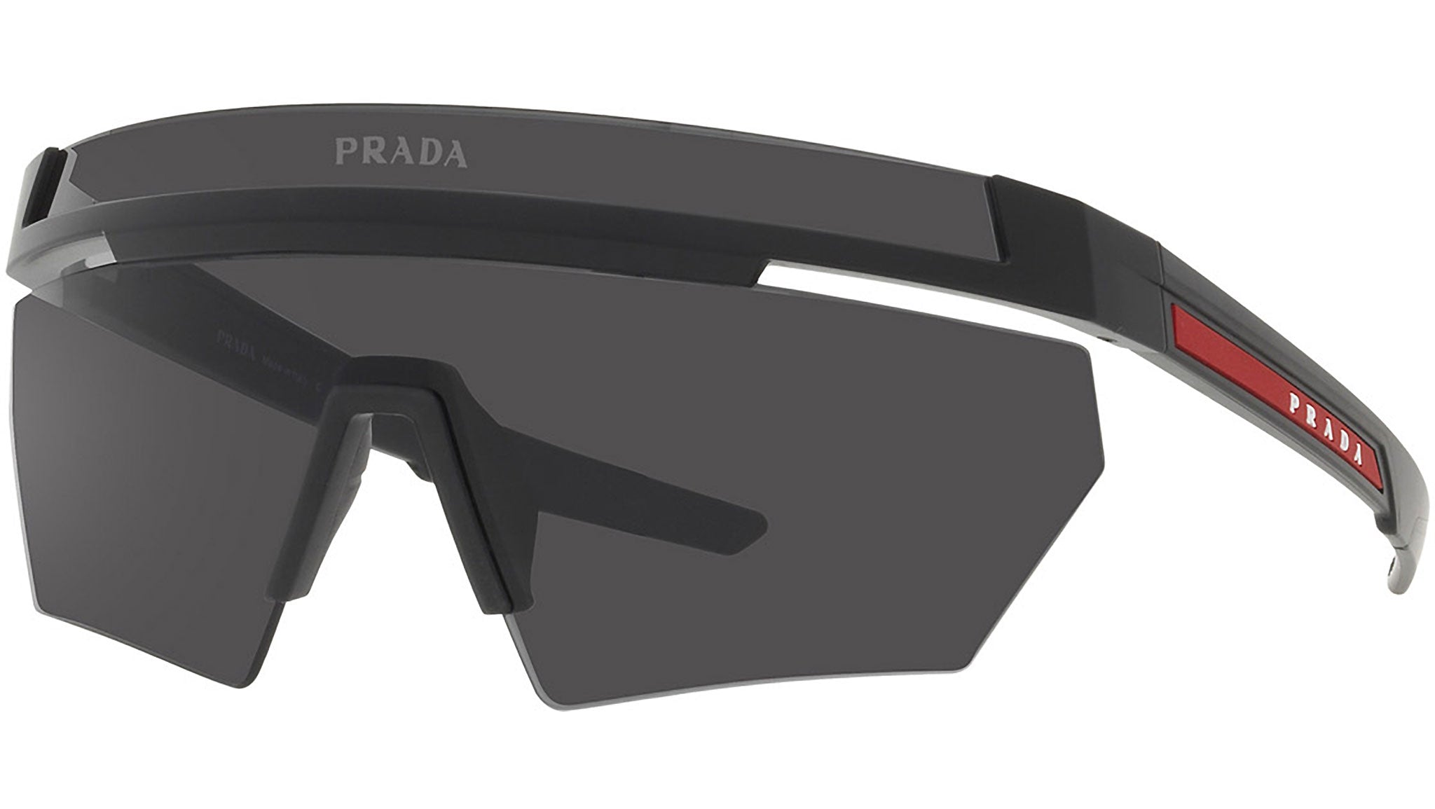 Occhiali da sole Prada Linea Rossa modello PS01YS nella variante colore 1BO06F nero opaco con lenti color grigio scuro. Una perfetta fusione dei concetti di sportswear ed eleganza contemporanea: la linea di occhiali da sole Prada Linea Rossa declina in un moderno stile casual tutta la qualità e la raffinatezza artigianale della maison Prada.
