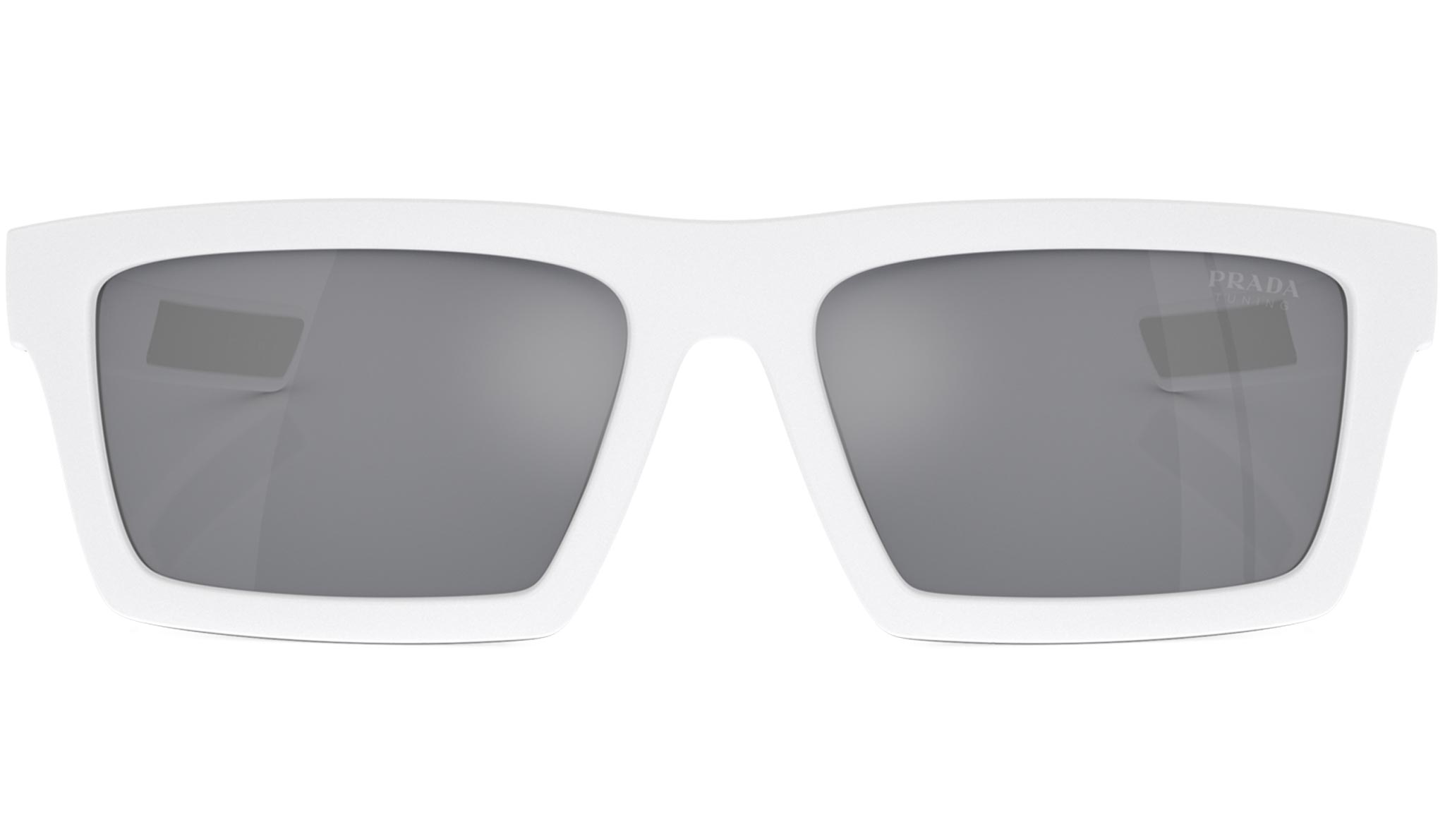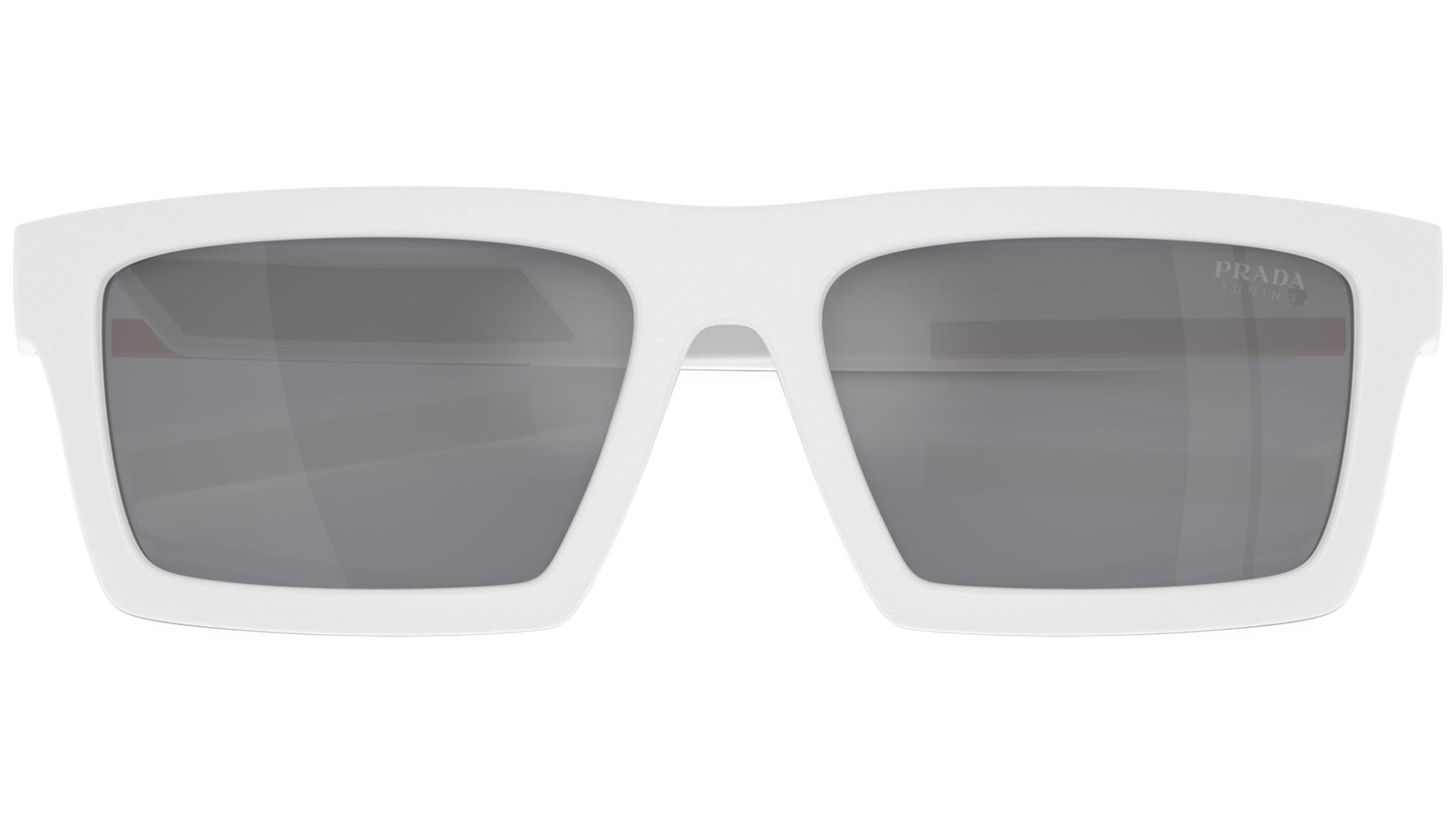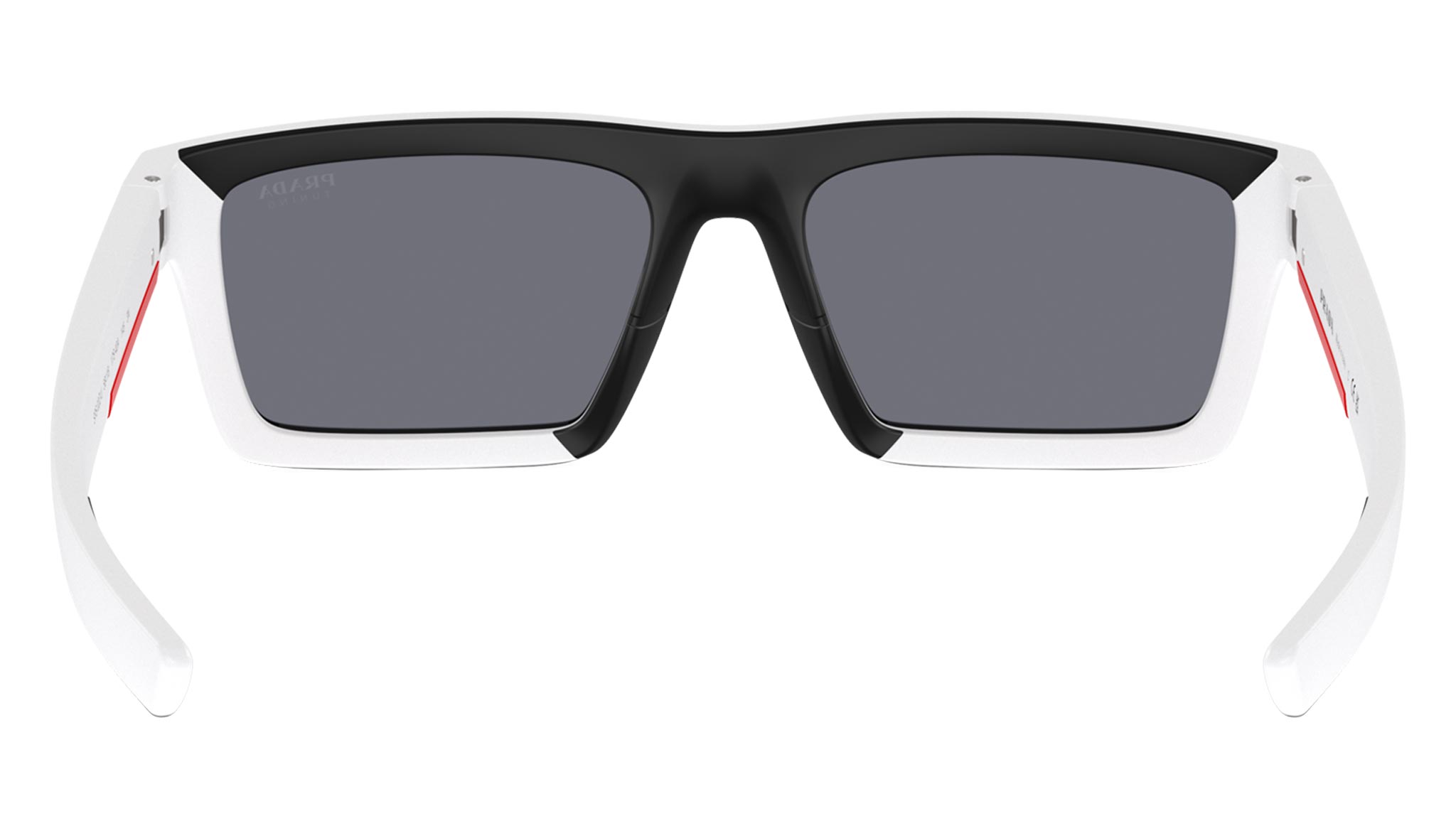 Occhiali da sole Prada Linea Rossa modello PS 02ZSU codice colore 17S40A con montatura d-frame full rim in nylon color bianco opaco / nero gommato e lenti in policarbonato color azzurro chiaro a specchio argento. Rivenditore autorizzato Prada. Ogni prodotto Prada Linea Rossa viene consegnato con astuccio originale e accessori.