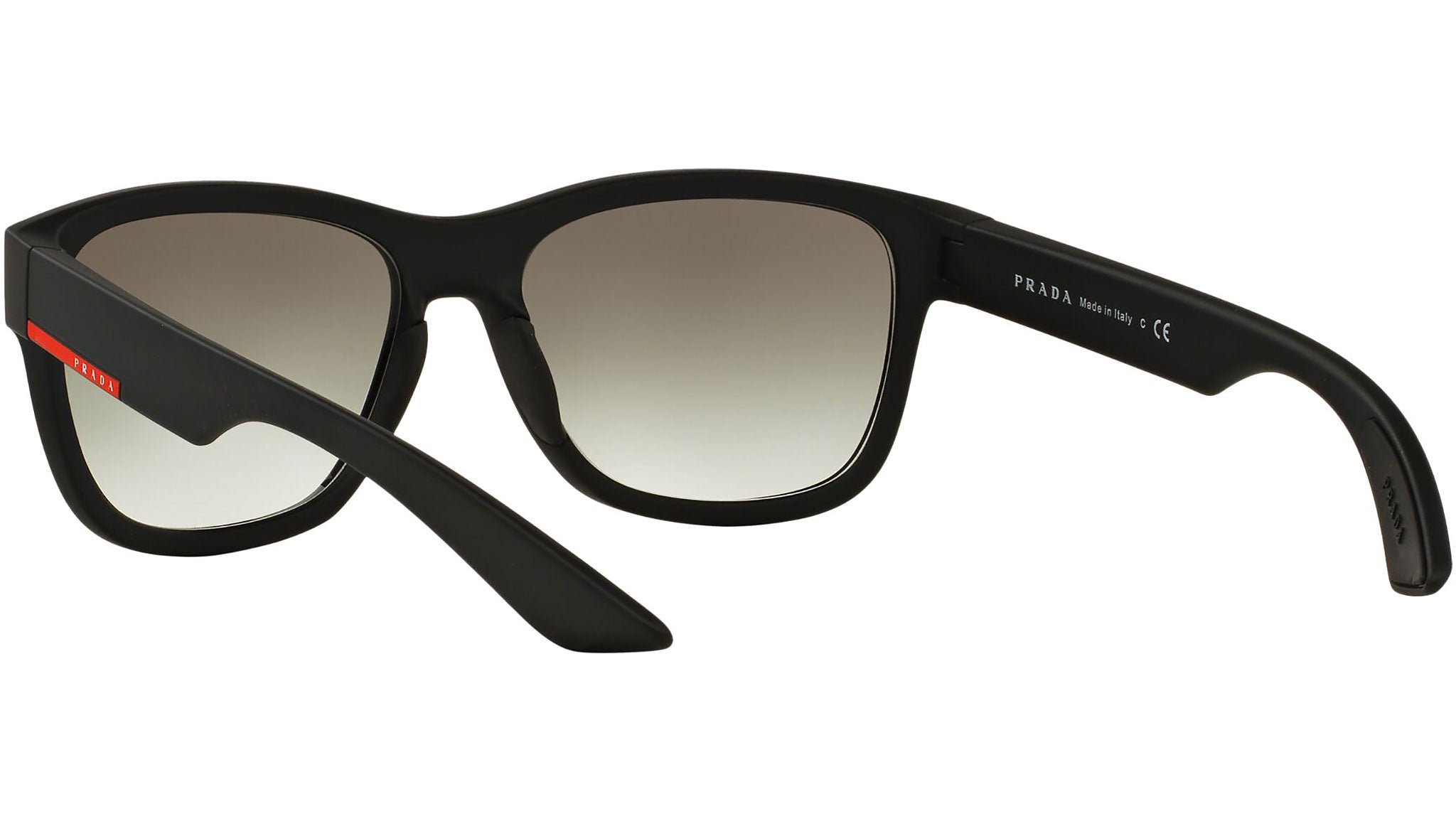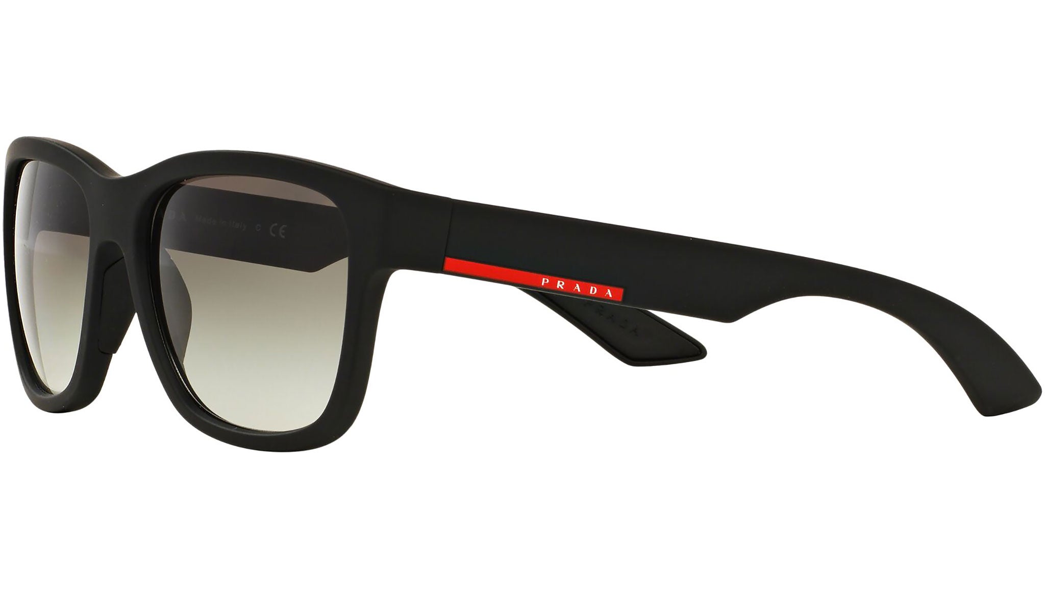 Prada Linea Rossa sunglasses model PS 03QS, black rubber frame variant, color code DG00A7 with grey gradient lens. Prada Linea Rossa Sun Collection conveys an everyday casual style with all the quality and craftsmanship of the Prada brand.
