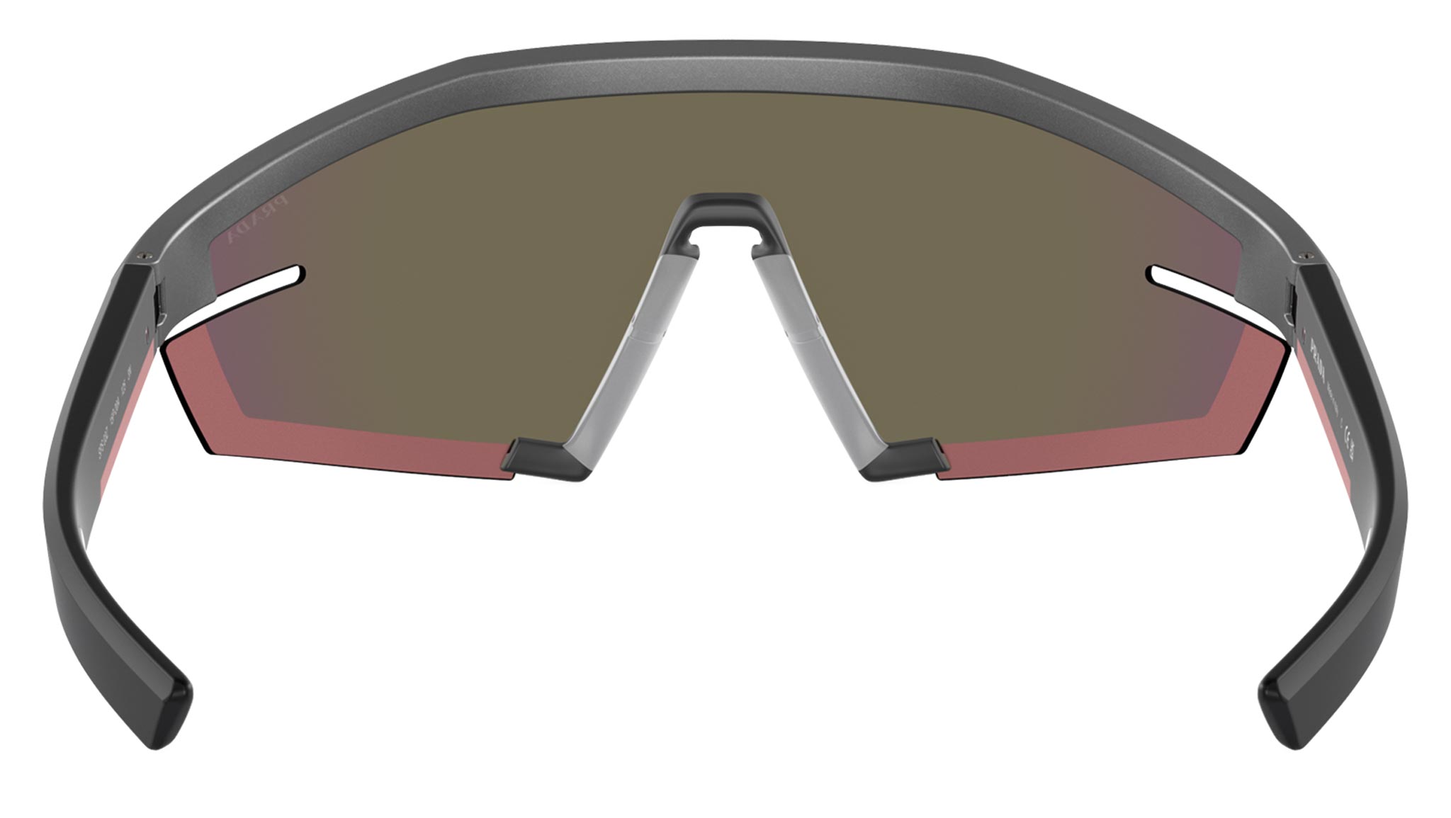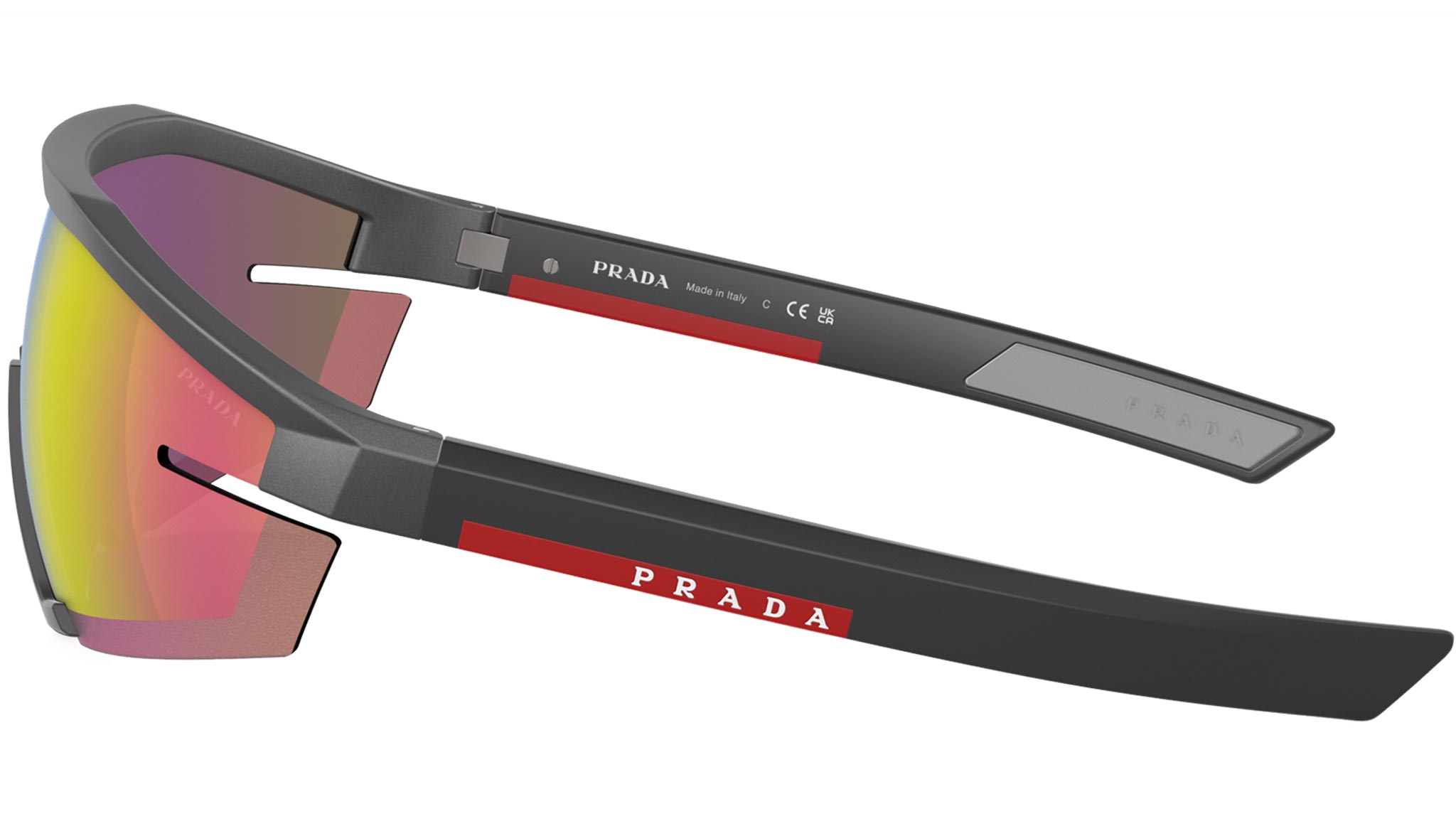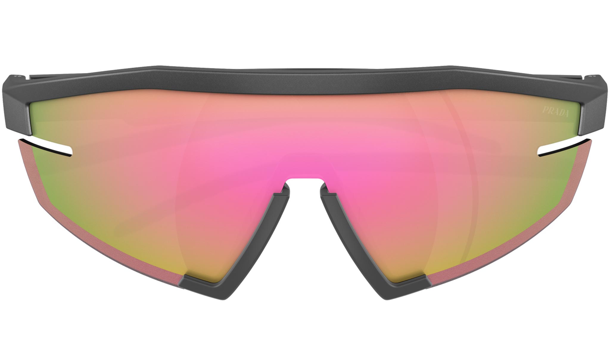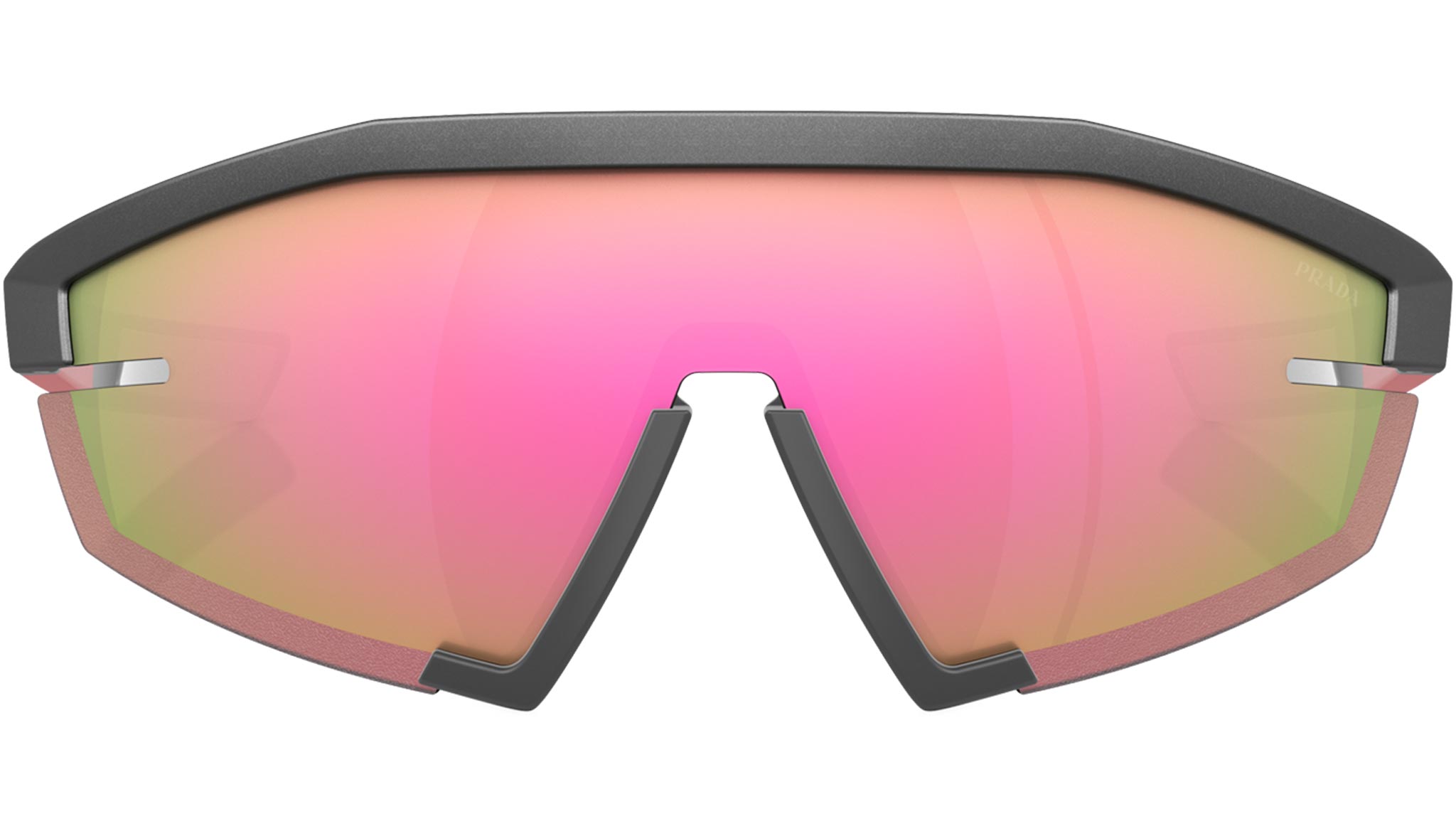 Occhiali da sole Prada Linea Rossa modello PS 03ZS codice colore 15P20A con montatura rettangolare rimless in iniettato color grigio metallico e lenti in poliammide color multistrato rosa. Rivenditore autorizzato Prada. Ogni prodotto Prada Linea Rossa viene consegnato con astuccio originale e accessori.