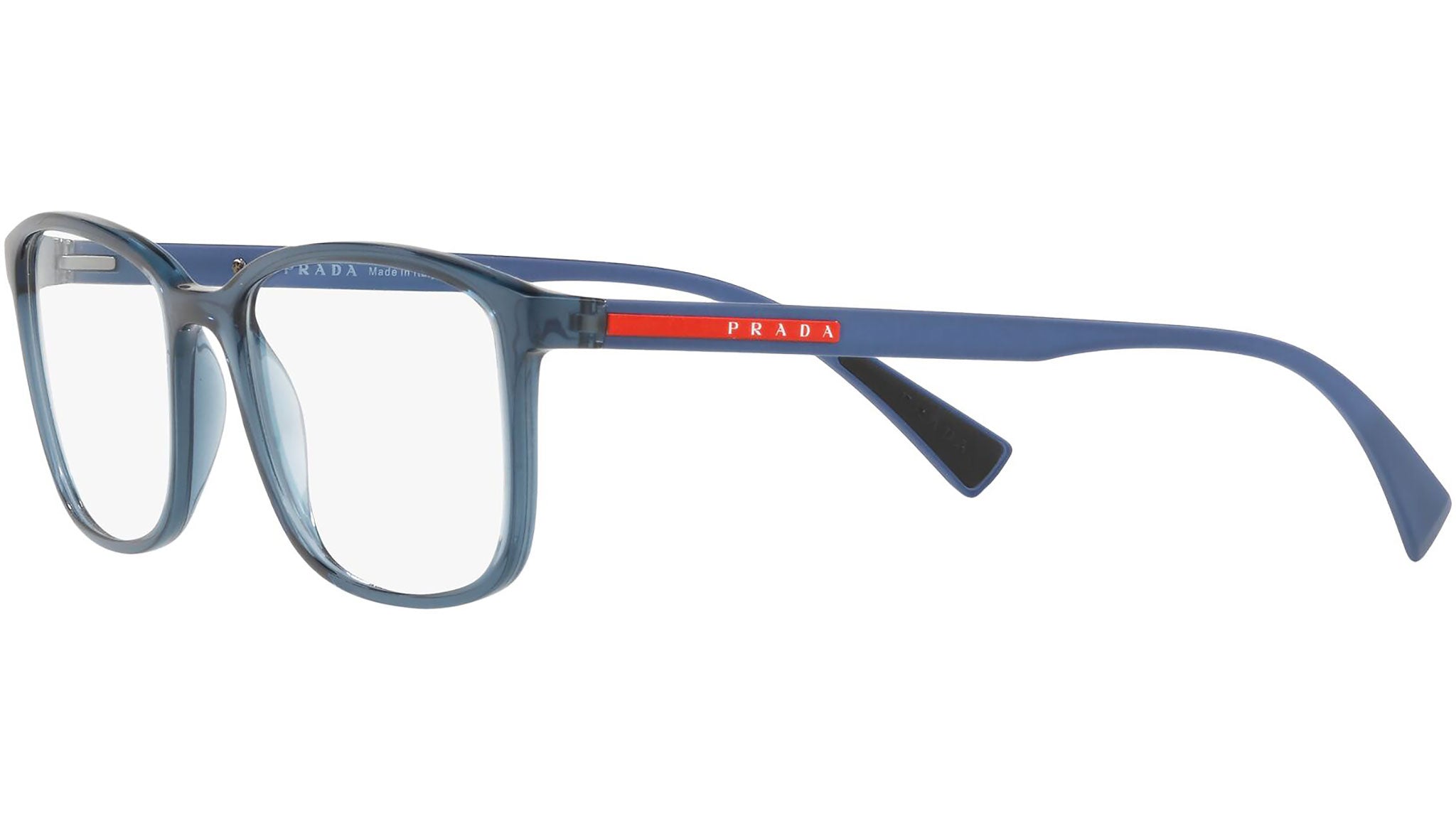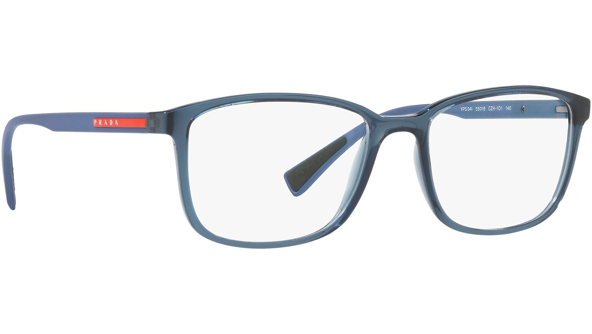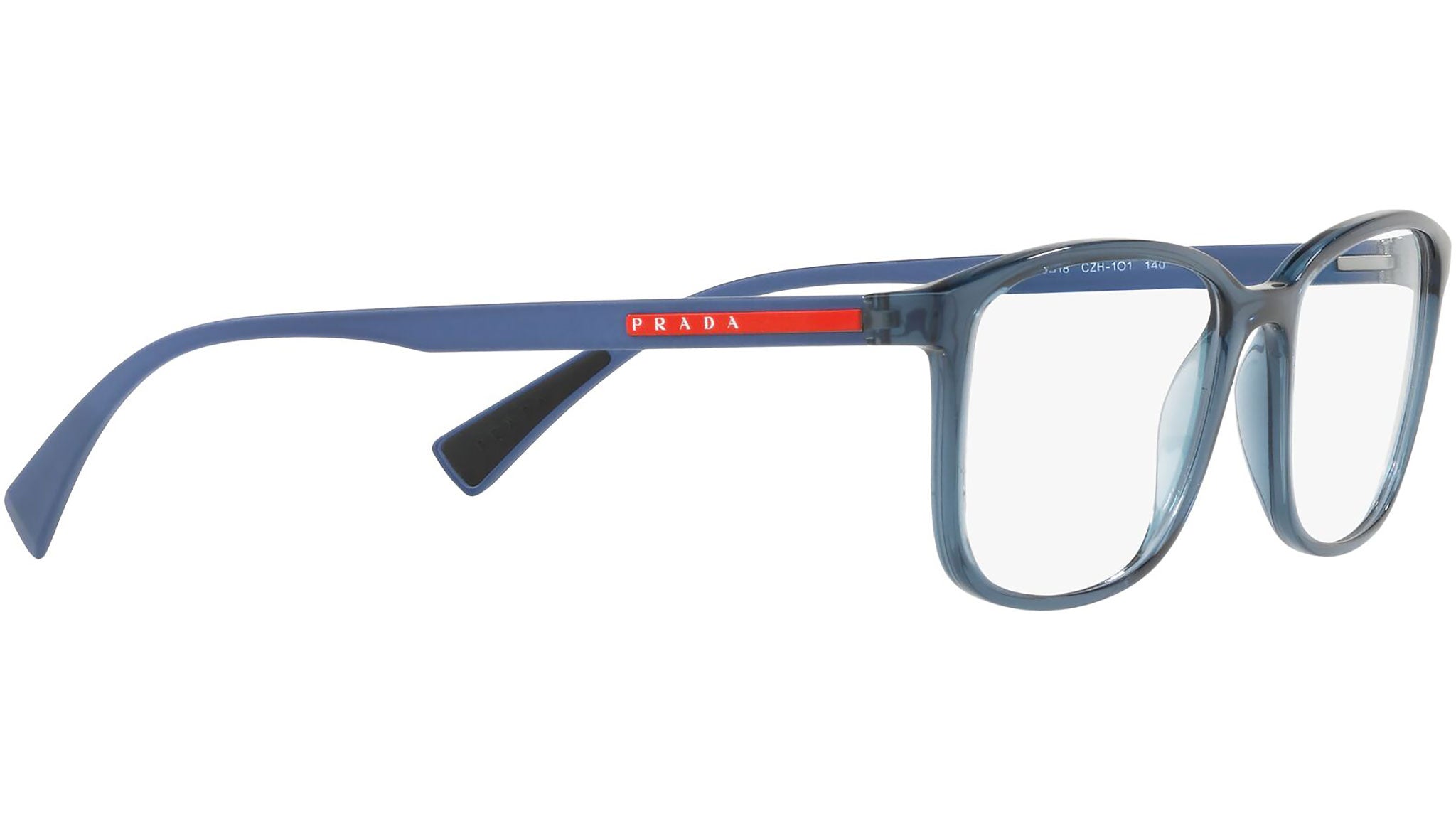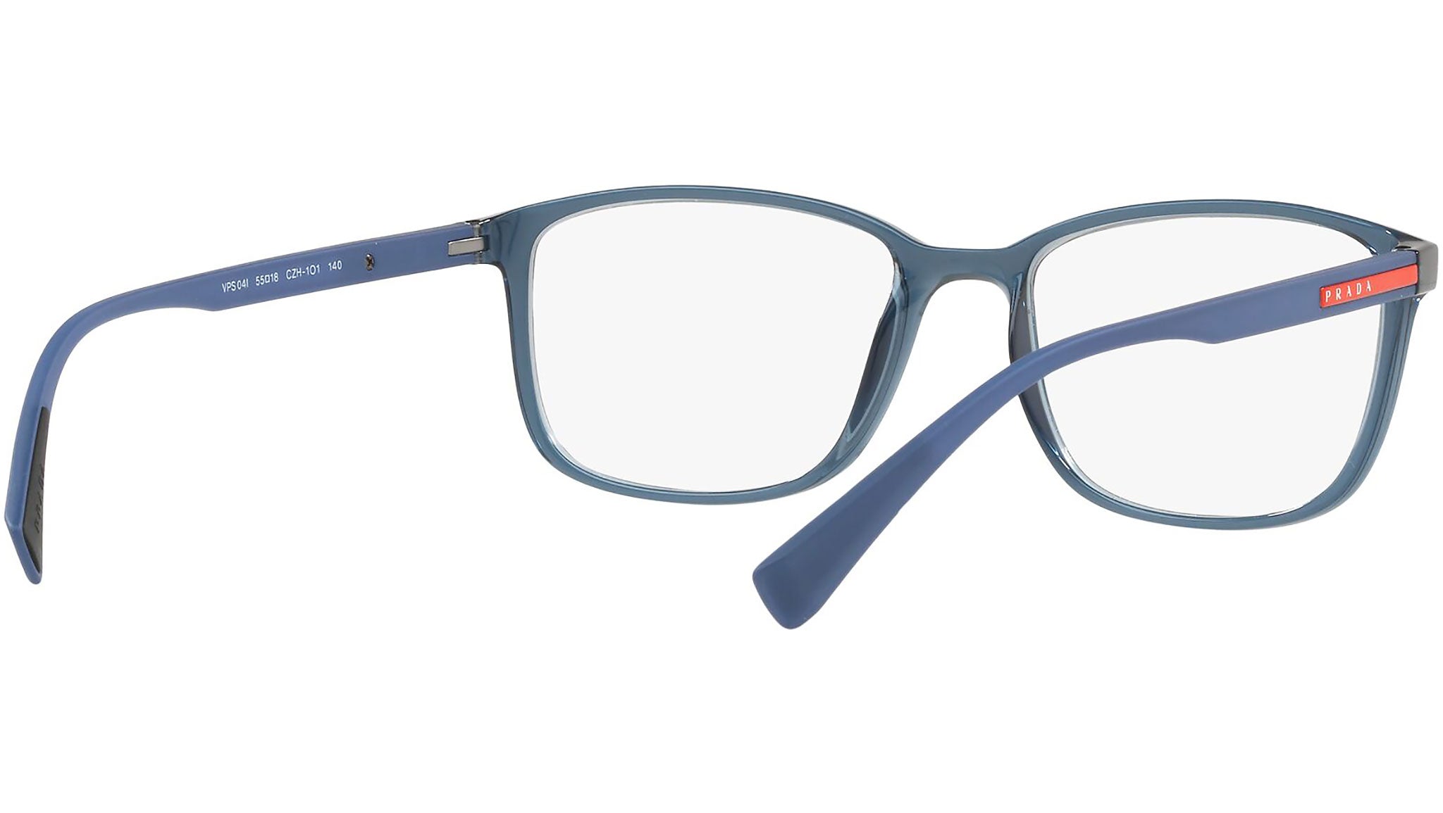 Prada Linea Rossa Eyewear Collection model PS 04IV, transparent azure frame variant, color code CZH1O1. A new perspective, a fusion of sportswear and contemporary elegance: the Prada Linea Rossa Eyewear Collection conveys an everyday casual style with all the quality and craftsmanship of the Prada brand.