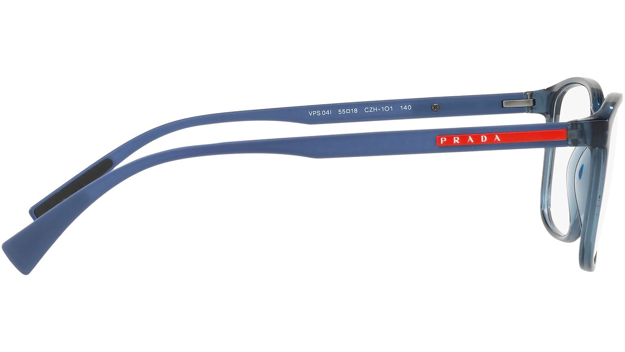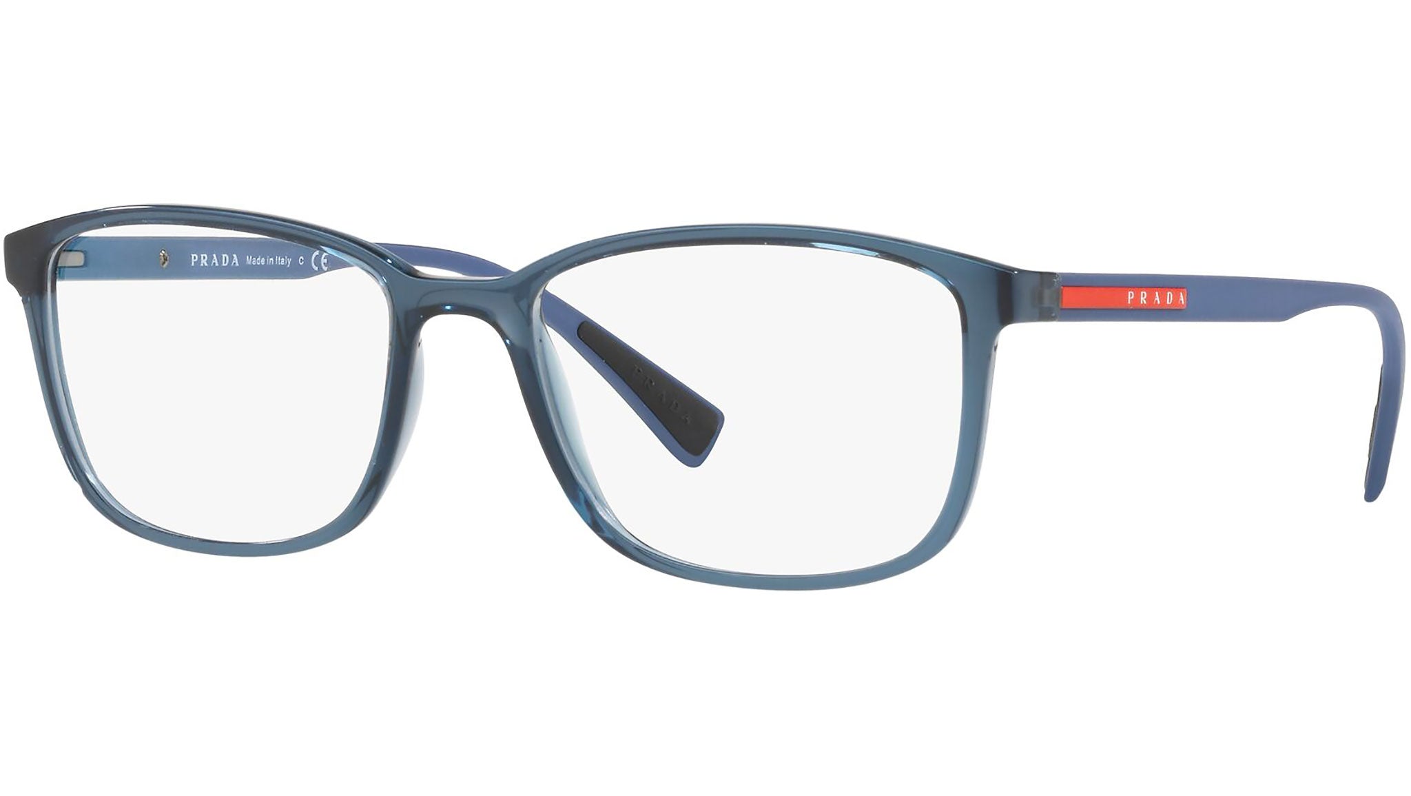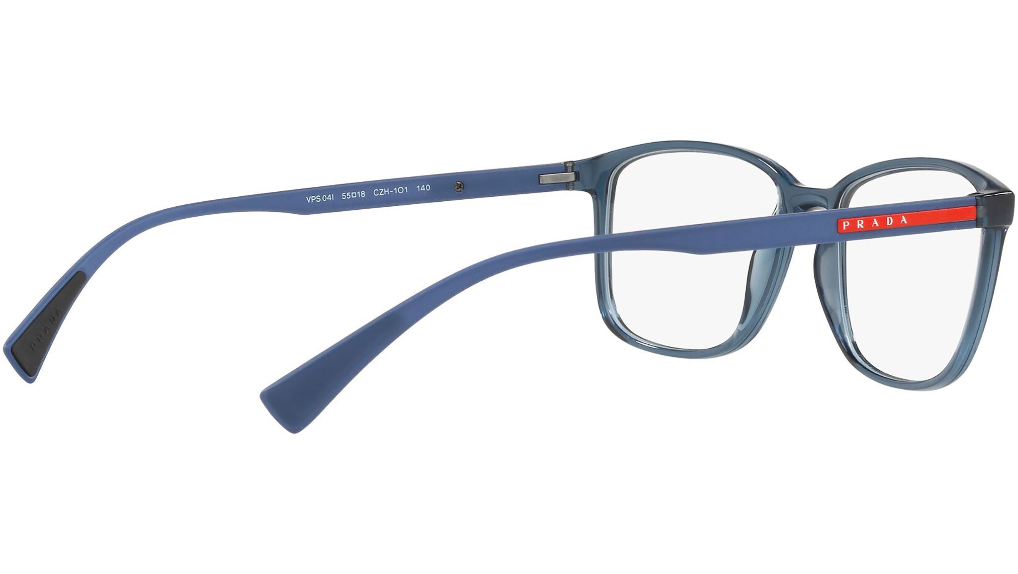 Prada Linea Rossa Eyewear Collection model PS 04IV, transparent azure frame variant, color code CZH1O1. A new perspective, a fusion of sportswear and contemporary elegance: the Prada Linea Rossa Eyewear Collection conveys an everyday casual style with all the quality and craftsmanship of the Prada brand.
