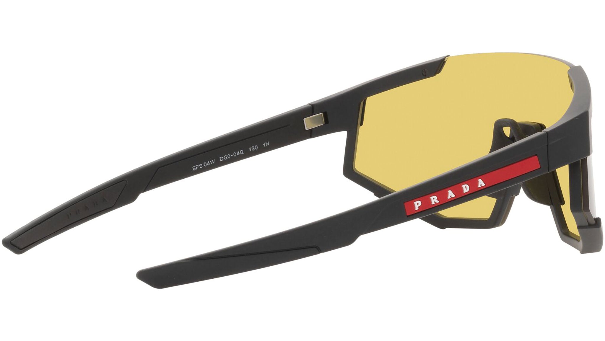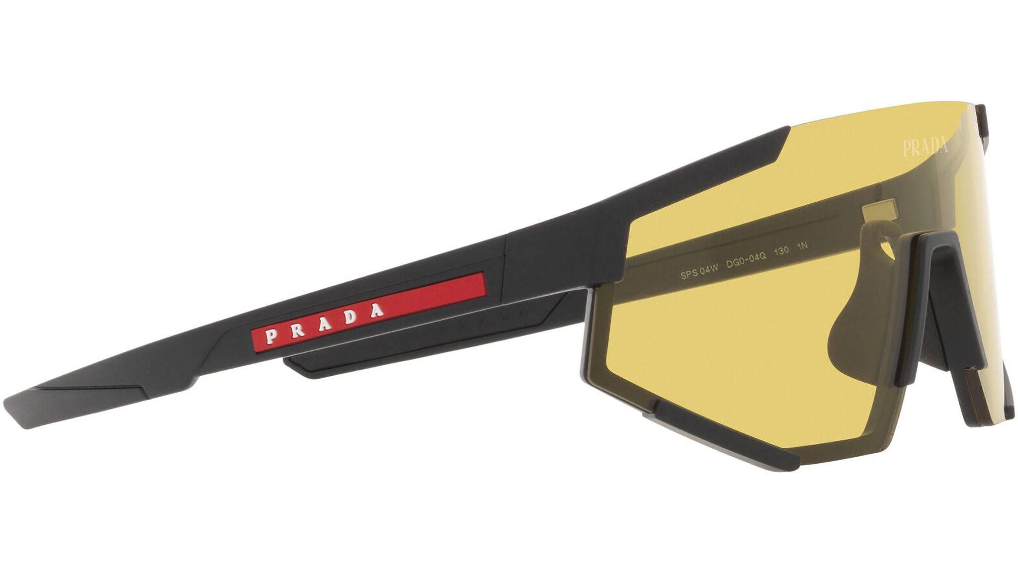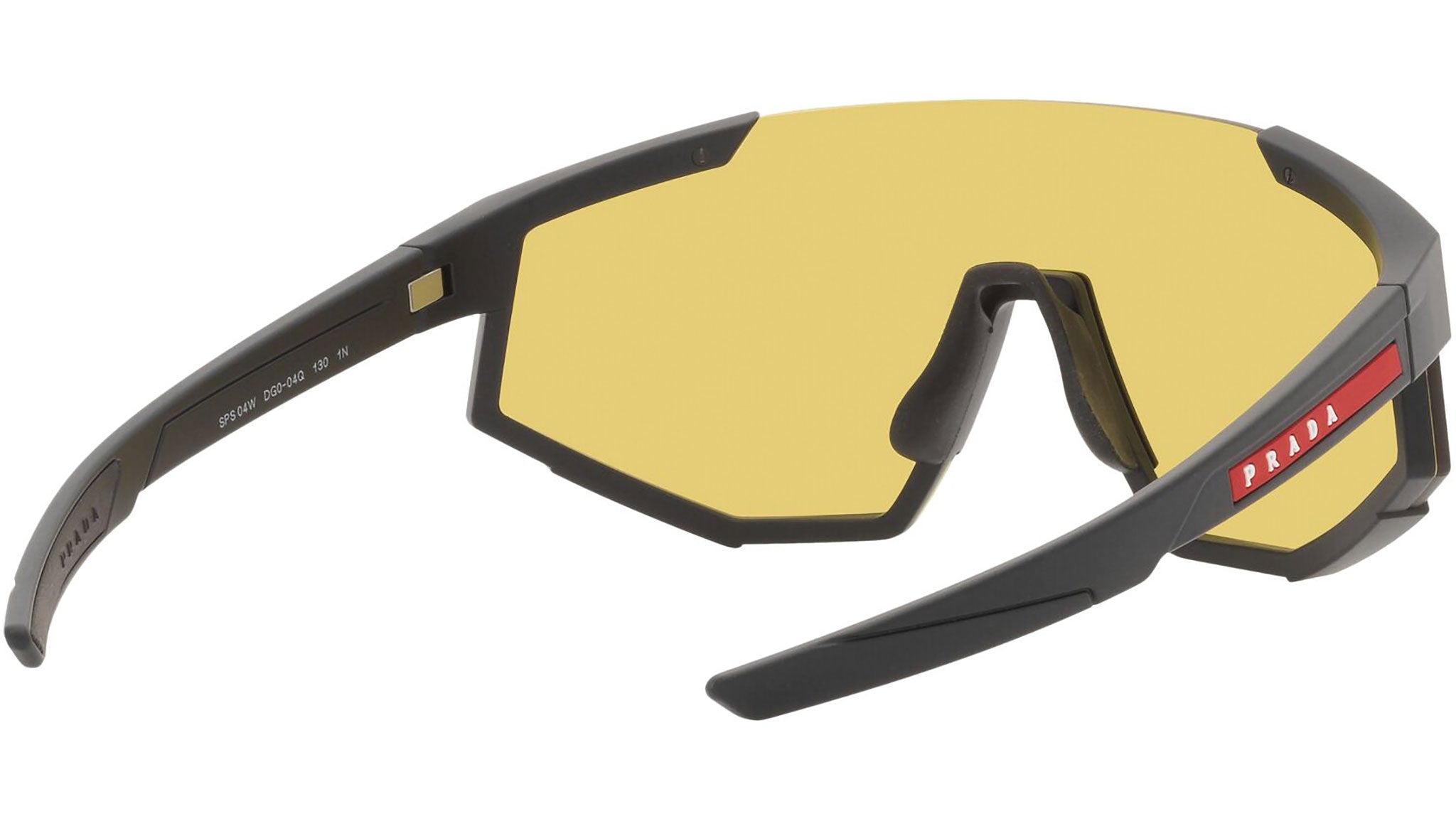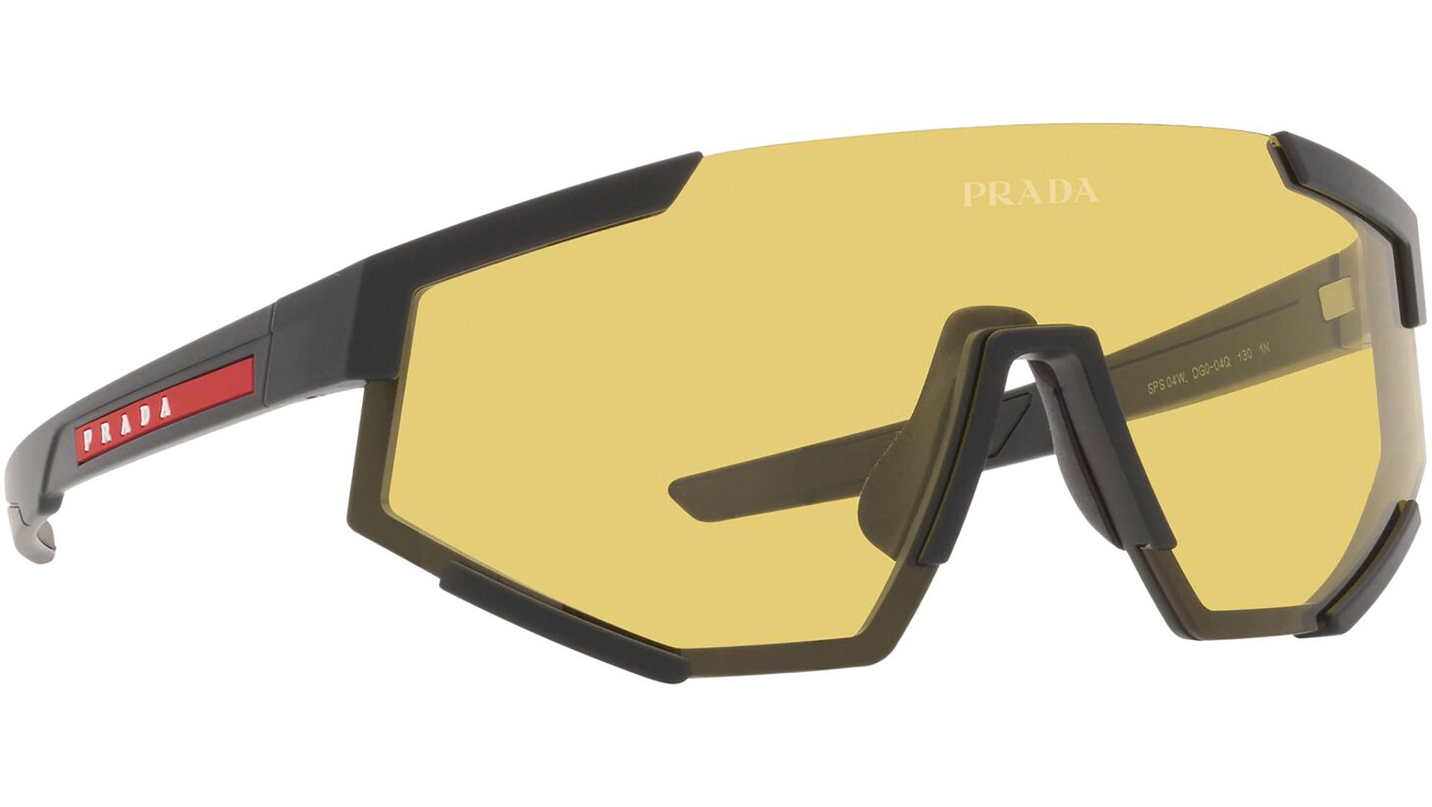 Occhiali da sole Prada Linea Rossa modello PS 04WS nella variante colore DG004Q nero gomma con lenti color giallo. Una perfetta fusione dei concetti di sportswear ed eleganza contemporanea: la linea di occhiali da sole Prada Linea Rossa declina in un moderno stile casual tutta la qualità e la raffinatezza artigianale della maison Prada.