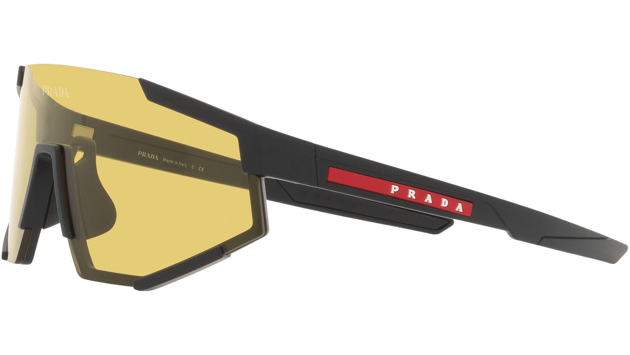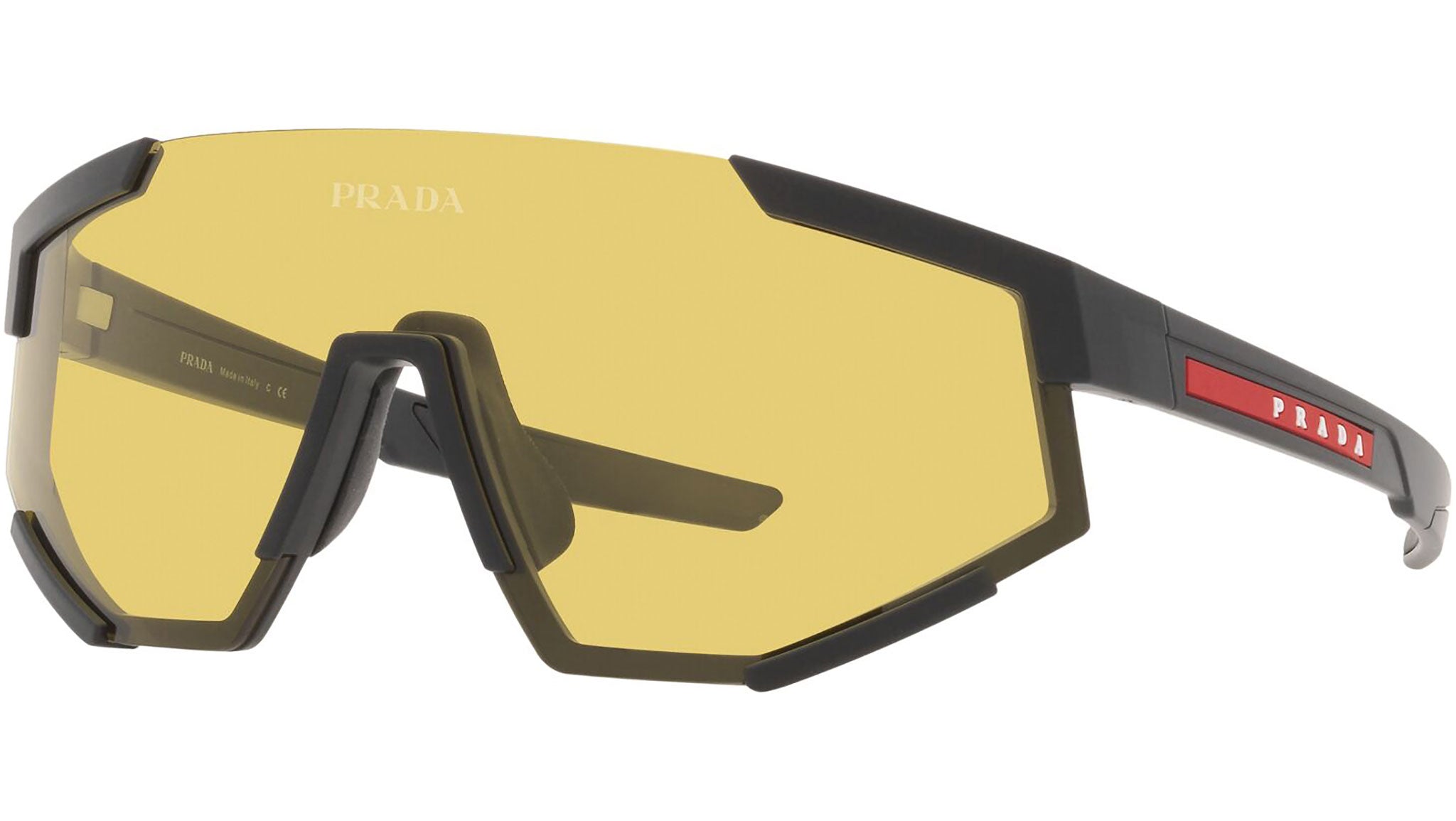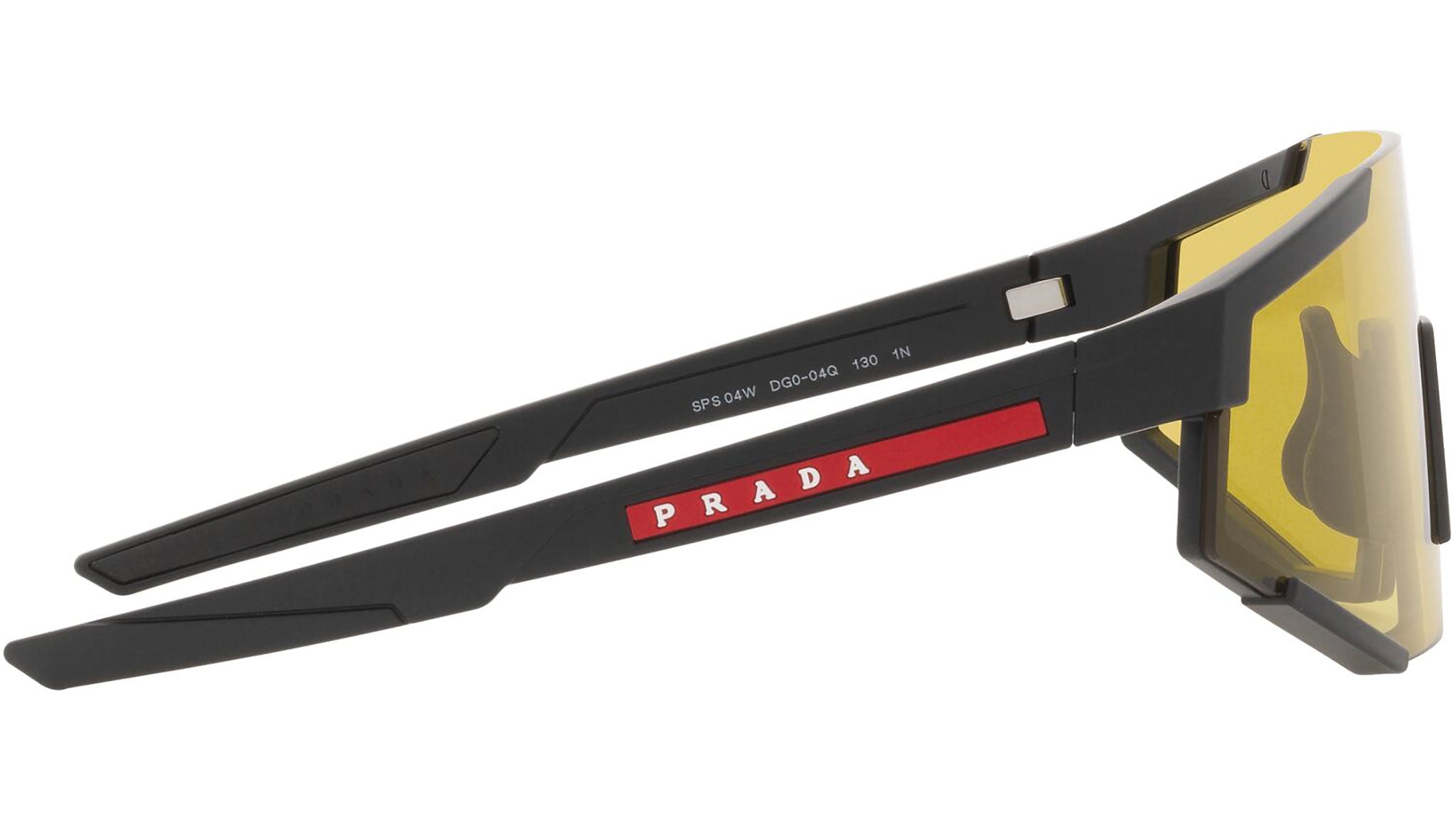 Occhiali da sole Prada Linea Rossa modello PS 04WS nella variante colore DG004Q nero gomma con lenti color giallo. Una perfetta fusione dei concetti di sportswear ed eleganza contemporanea: la linea di occhiali da sole Prada Linea Rossa declina in un moderno stile casual tutta la qualità e la raffinatezza artigianale della maison Prada.