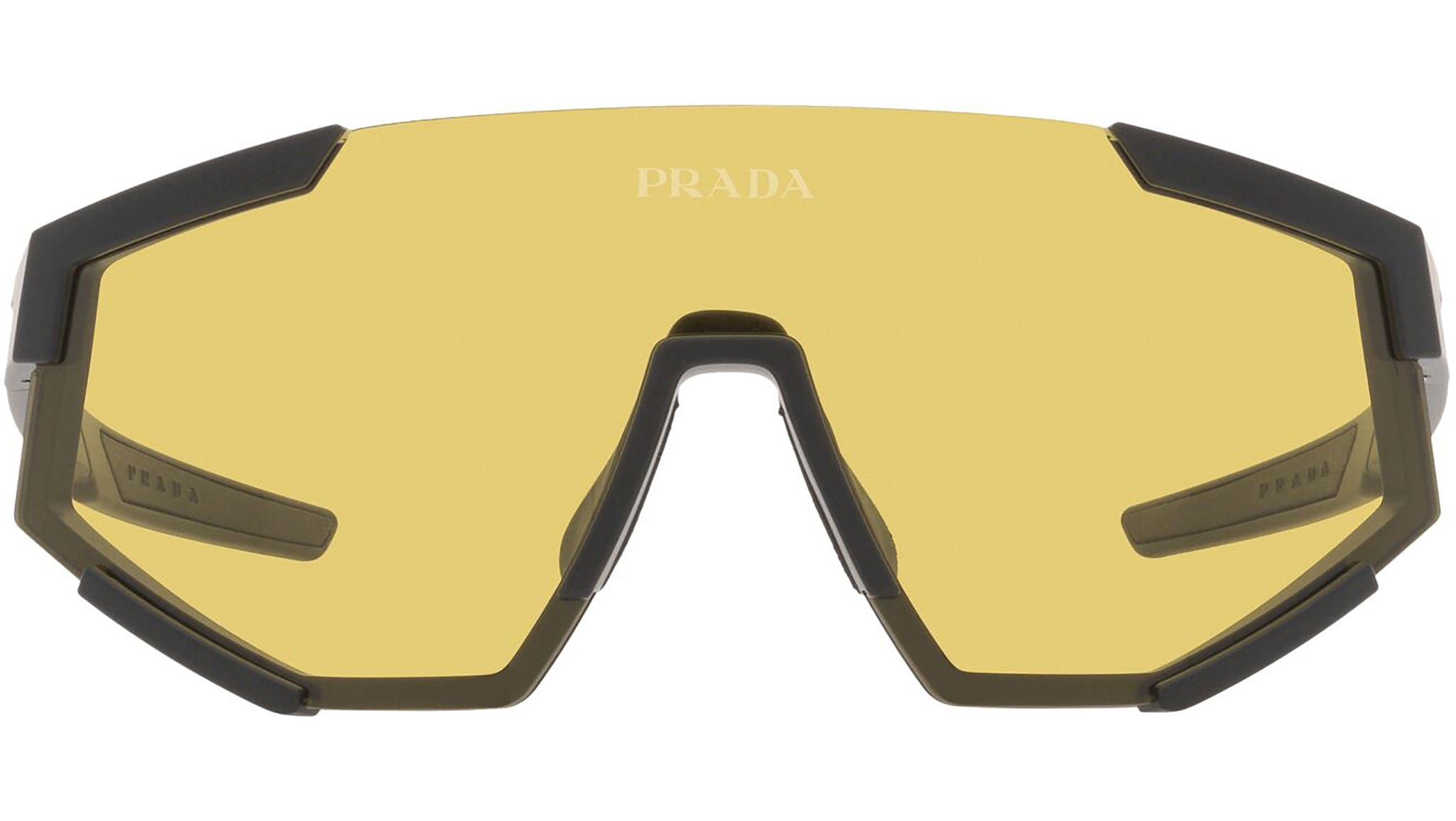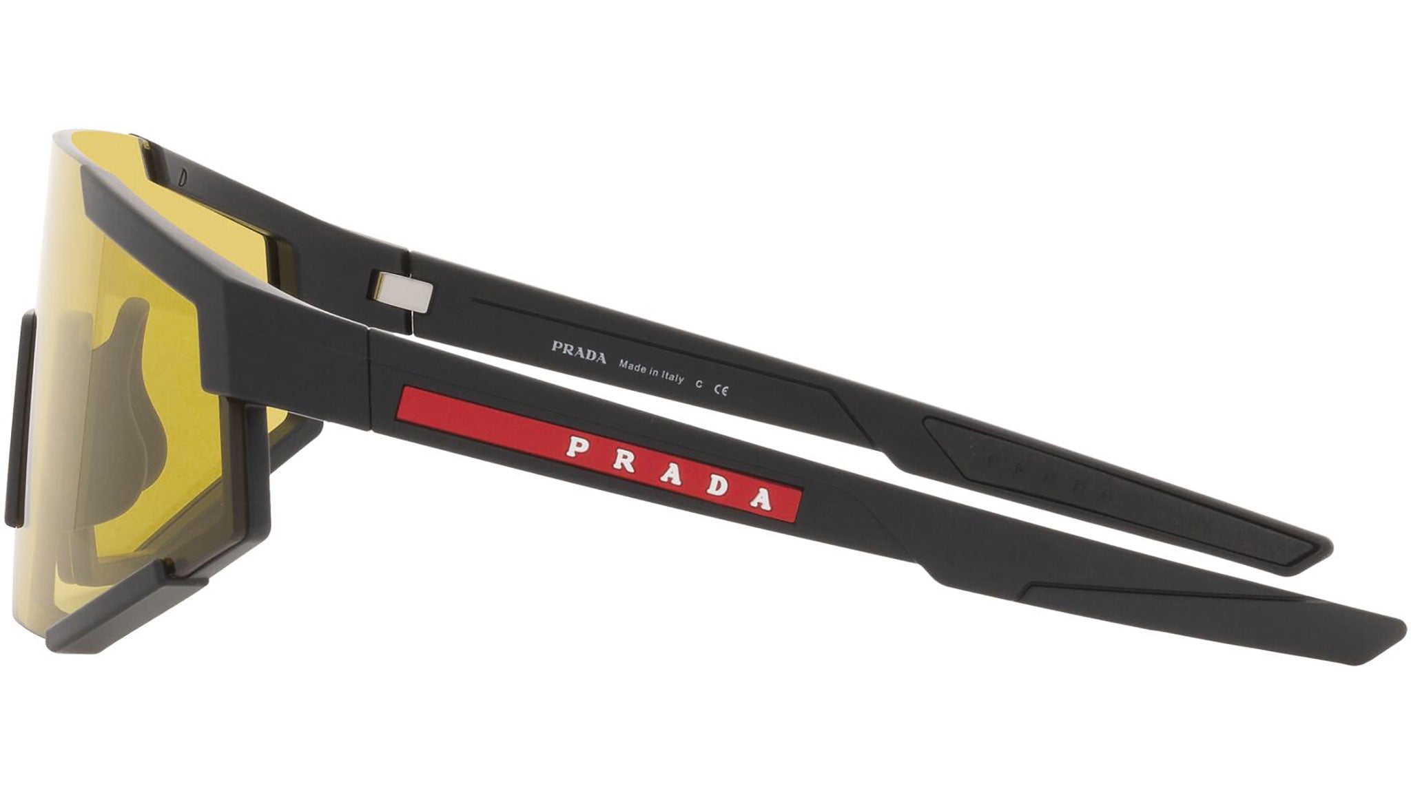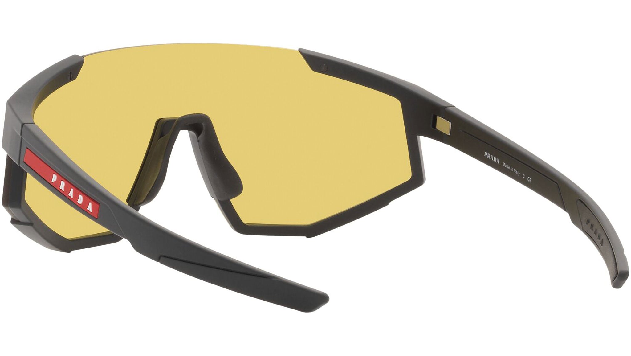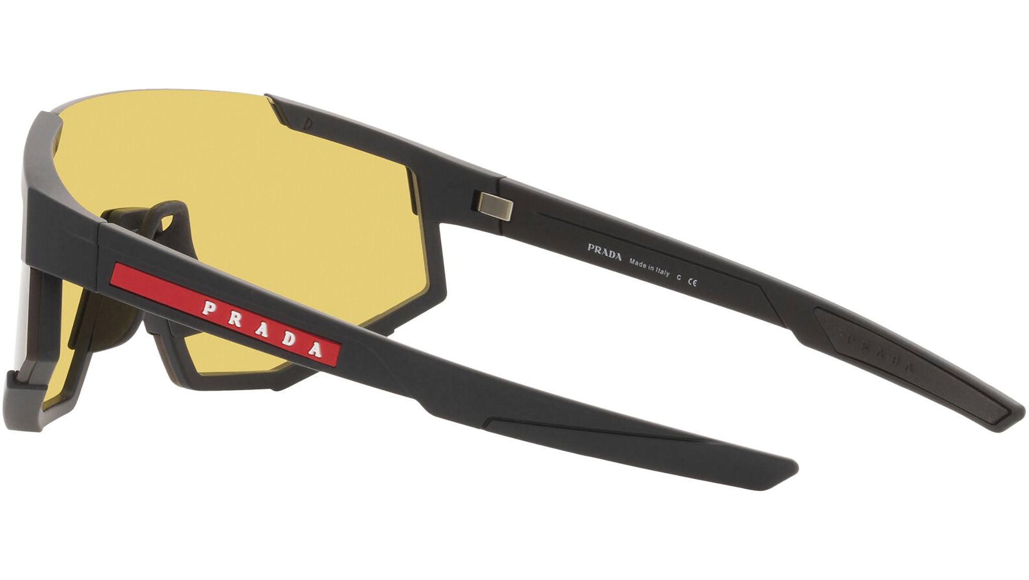 Occhiali da sole Prada Linea Rossa modello PS 04WS nella variante colore DG004Q nero gomma con lenti color giallo. Una perfetta fusione dei concetti di sportswear ed eleganza contemporanea: la linea di occhiali da sole Prada Linea Rossa declina in un moderno stile casual tutta la qualità e la raffinatezza artigianale della maison Prada.