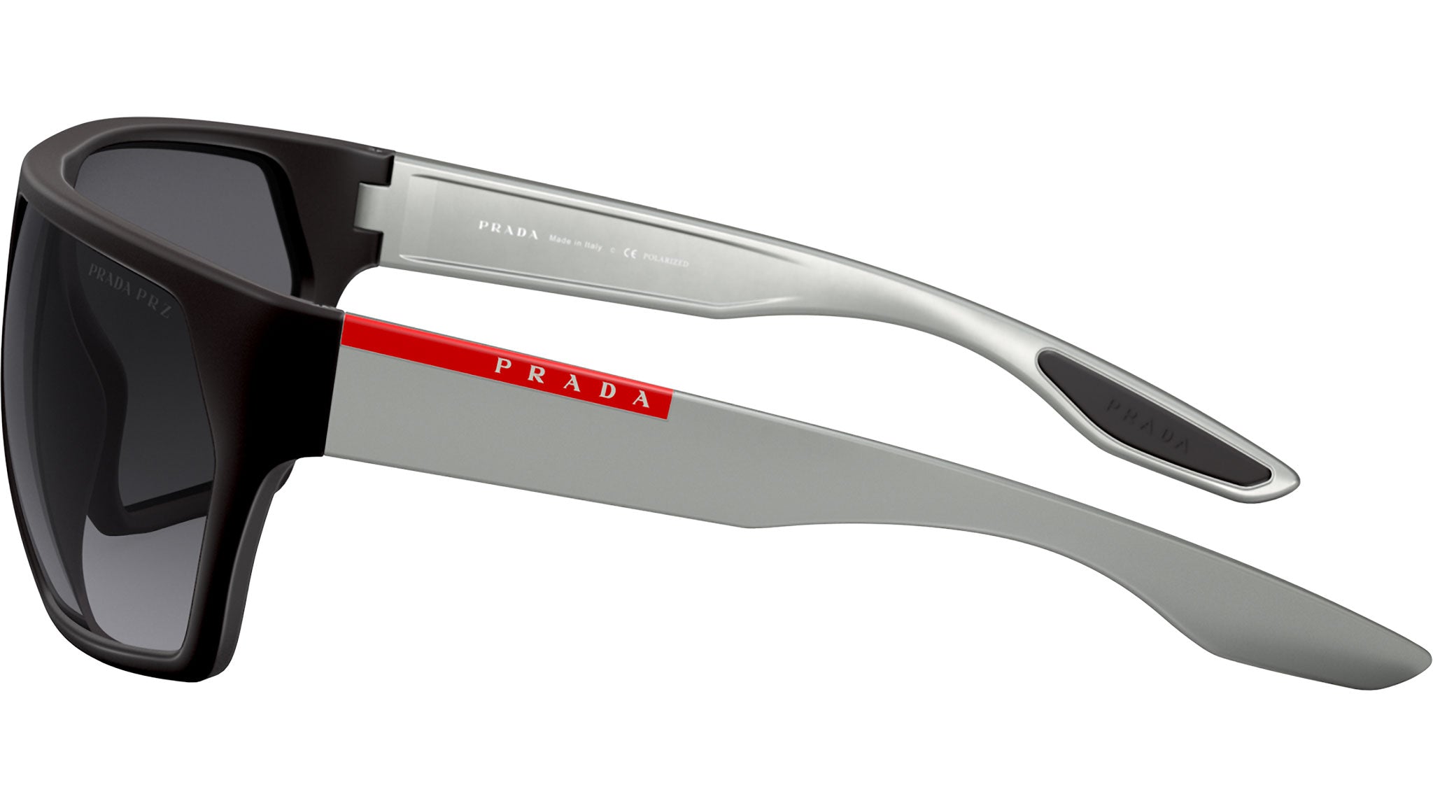 Prada Linea Rossa sunglasses model PS 08US, black rubber frame variant, color code 4535W1 with polar grey gradient lens. Prada Linea Rossa Sun Collection conveys an everyday casual style with all the quality and craftsmanship of the Prada brand.