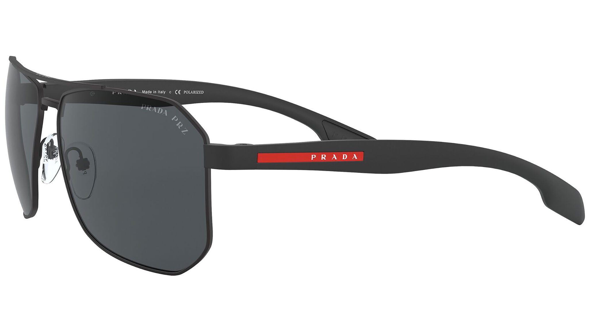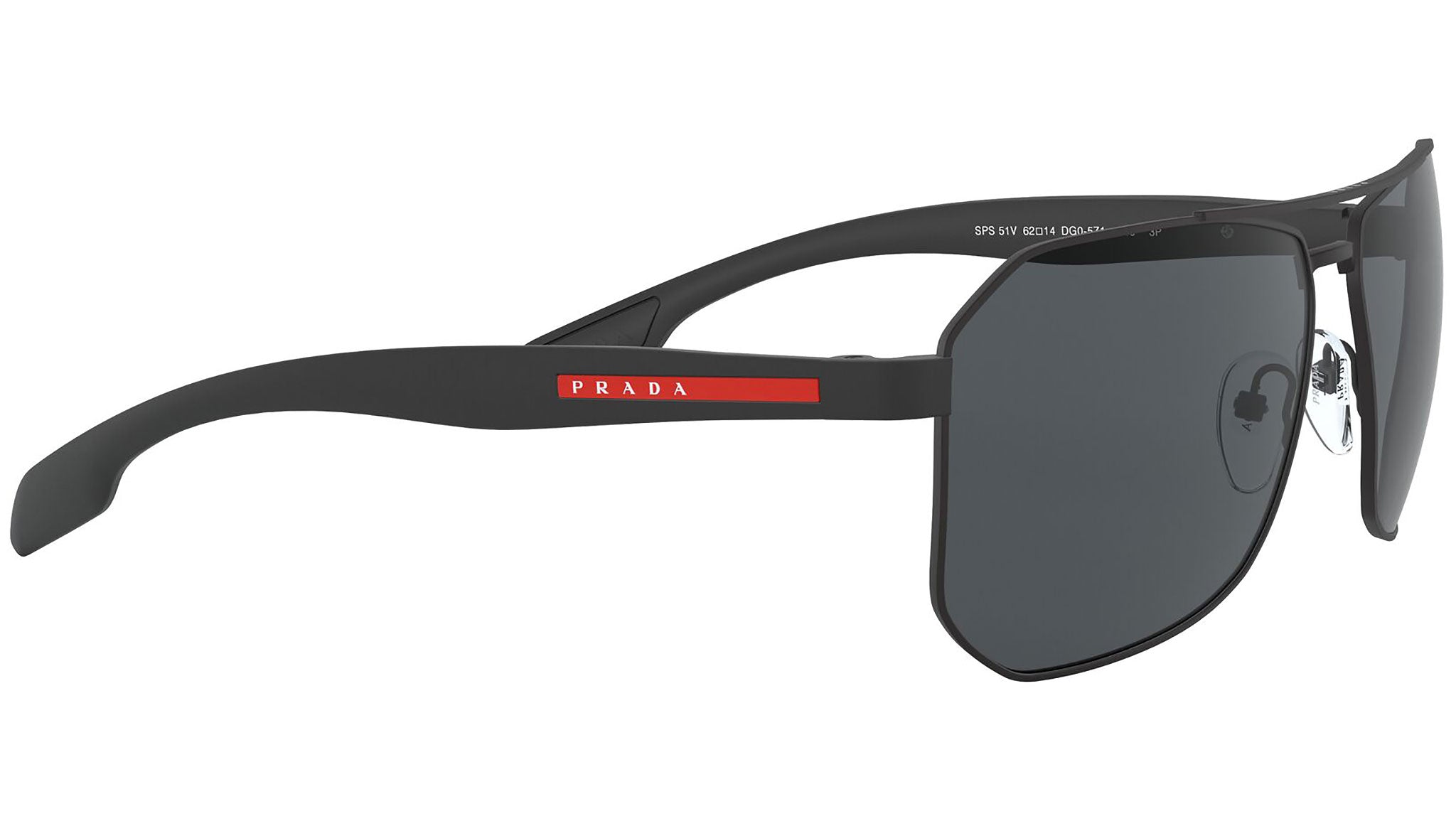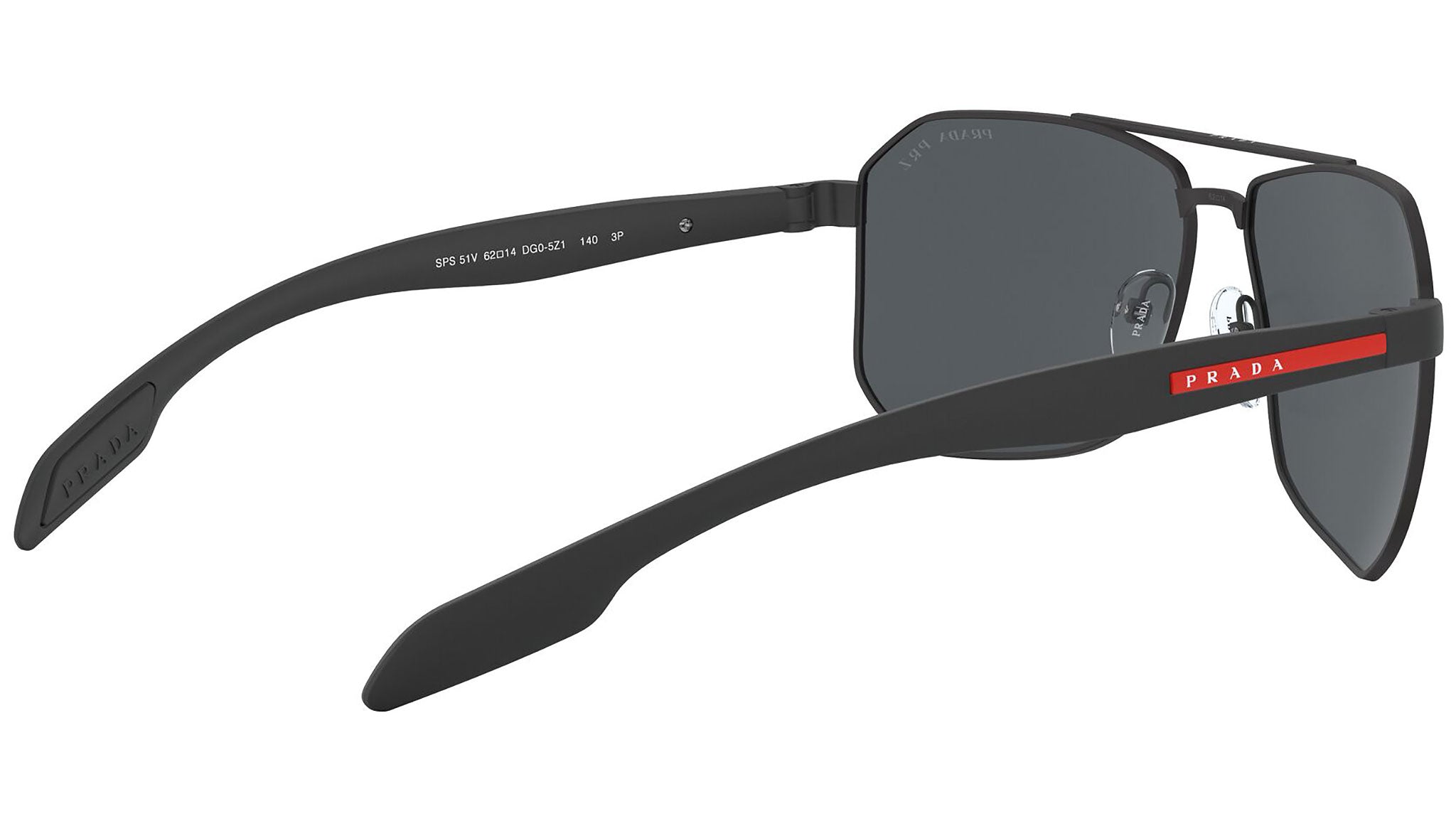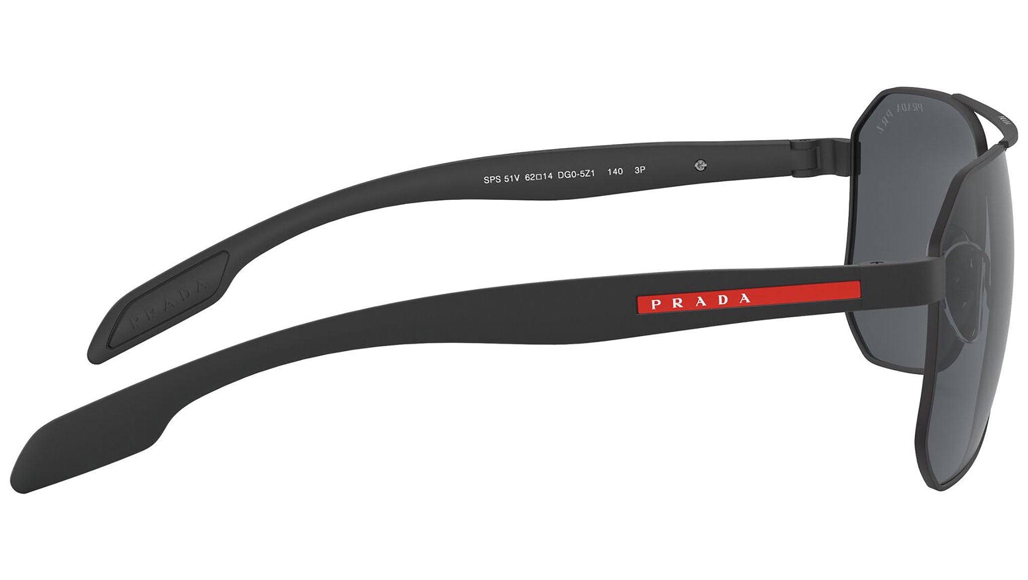 Prada Linea Rossa sunglasses model PS 51VS, black rubber frame variant, color code DG05Z1 with polar grey lens. Prada Linea Rossa Sun Collection conveys an everyday casual style with all the quality and craftsmanship of the Prada brand.