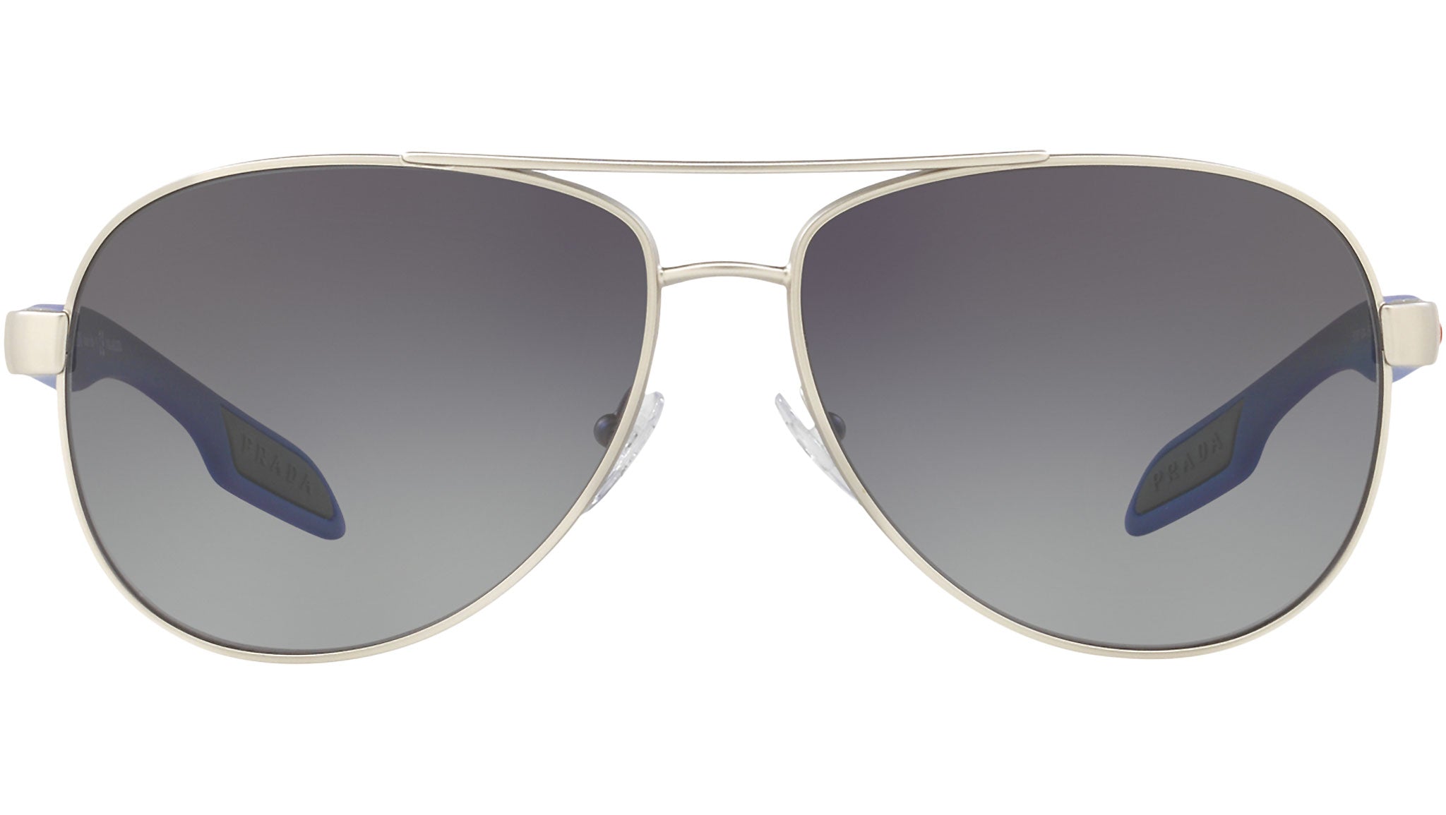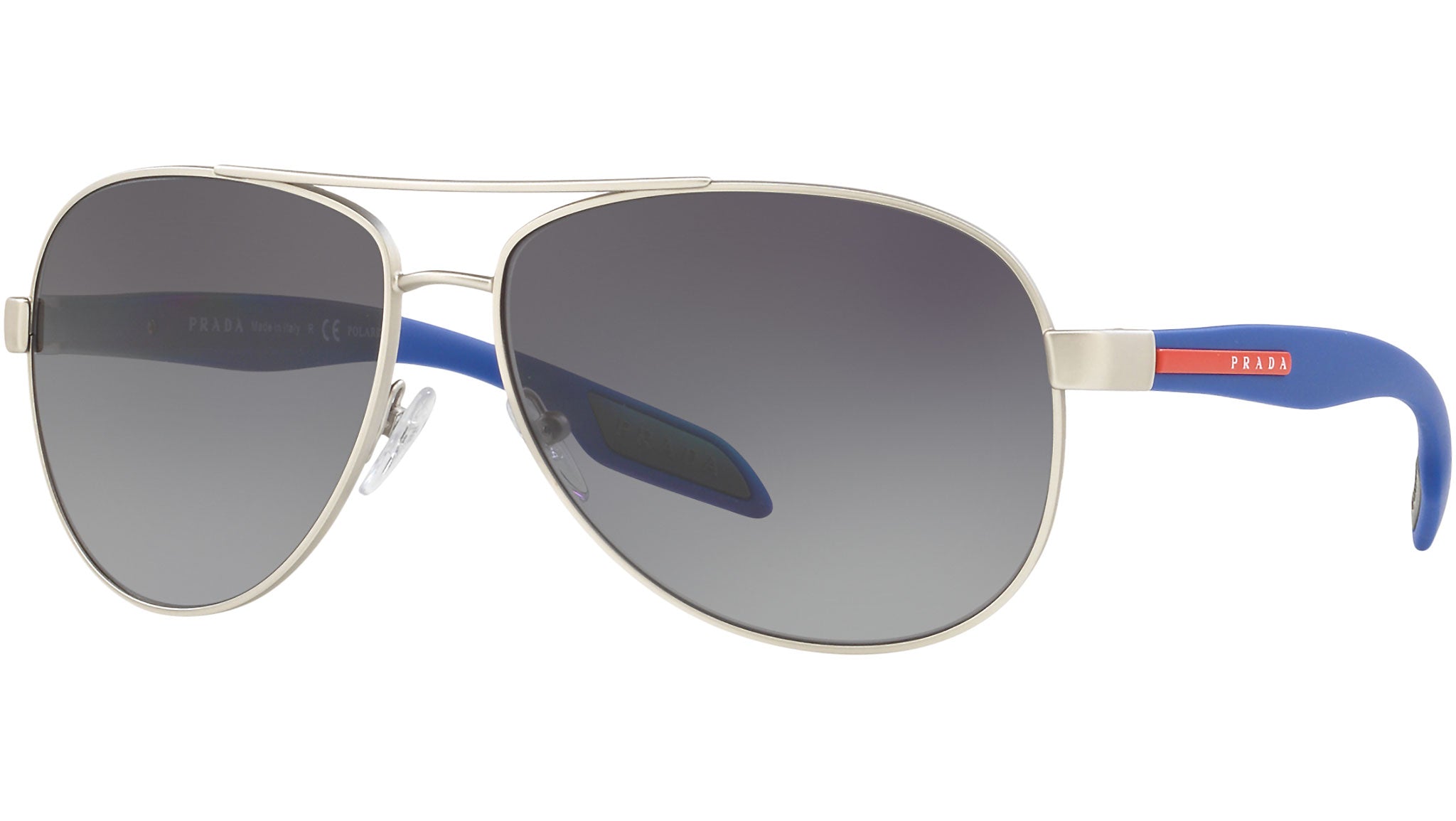 Prada Linea Rossa sunglasses model PS 53PS, silver rubber frame variant, color code QFP5W1 with polar grey gradient lens. Prada Linea Rossa Sun Collection conveys an everyday casual style with all the quality and craftsmanship of the Prada brand.