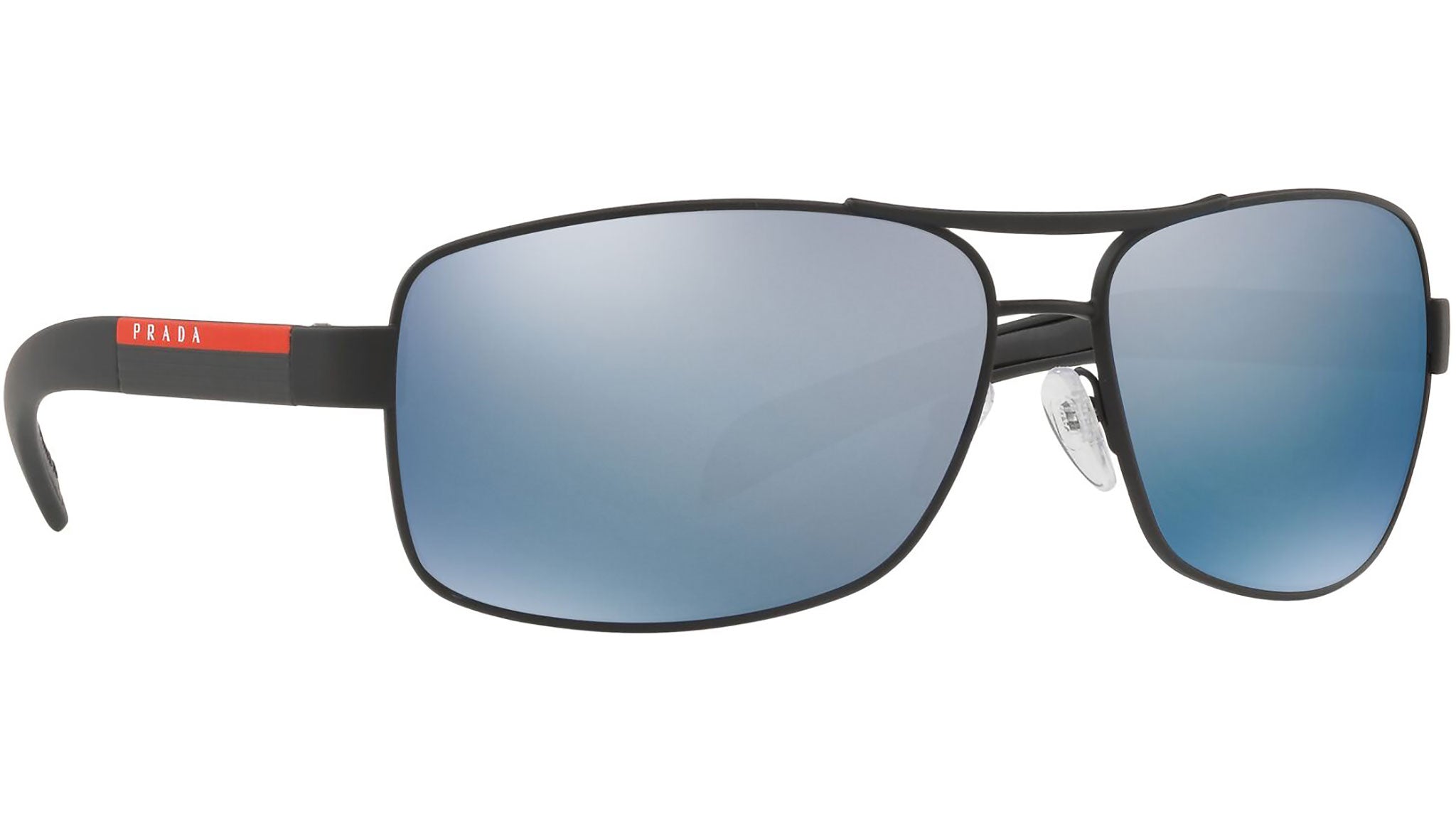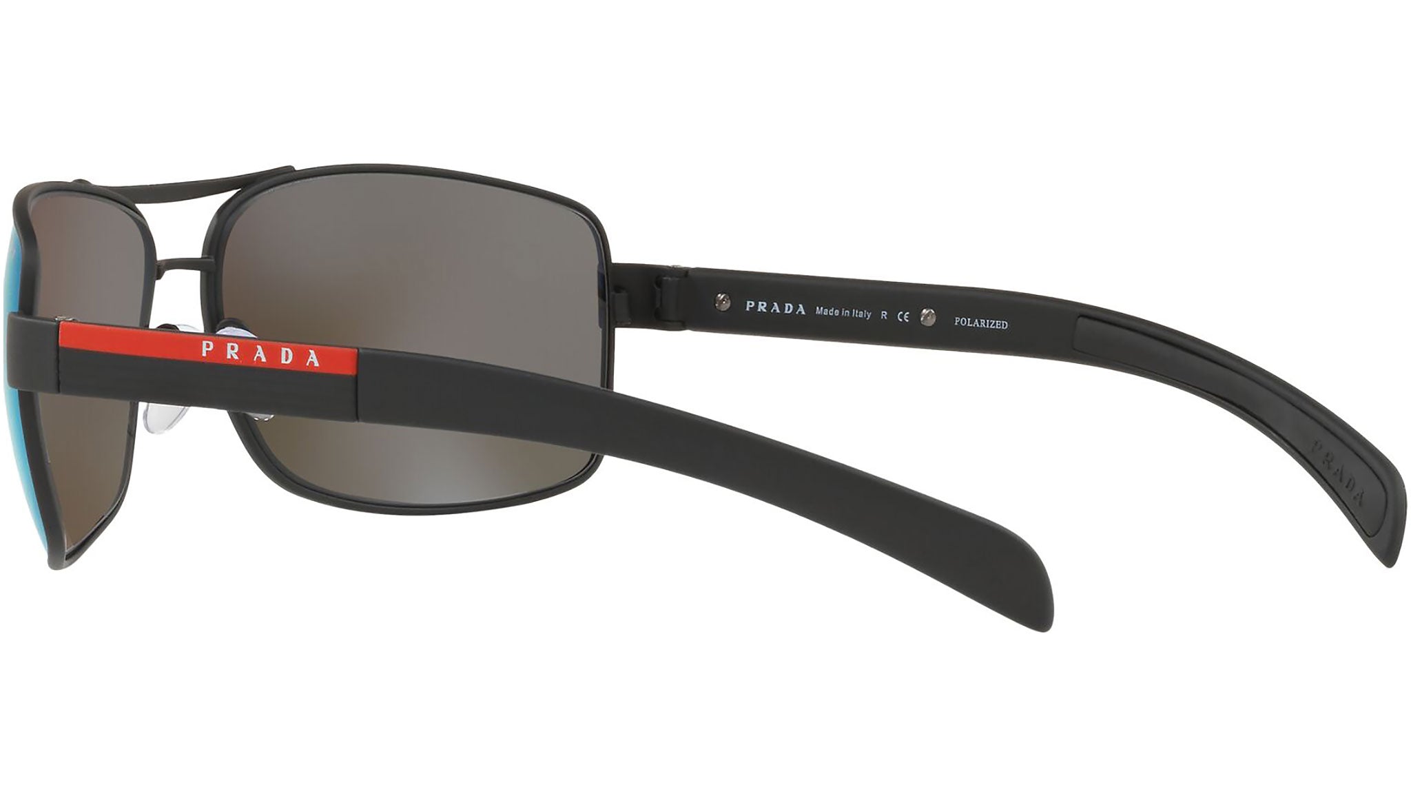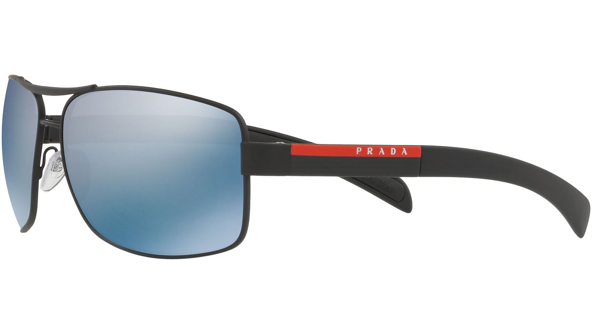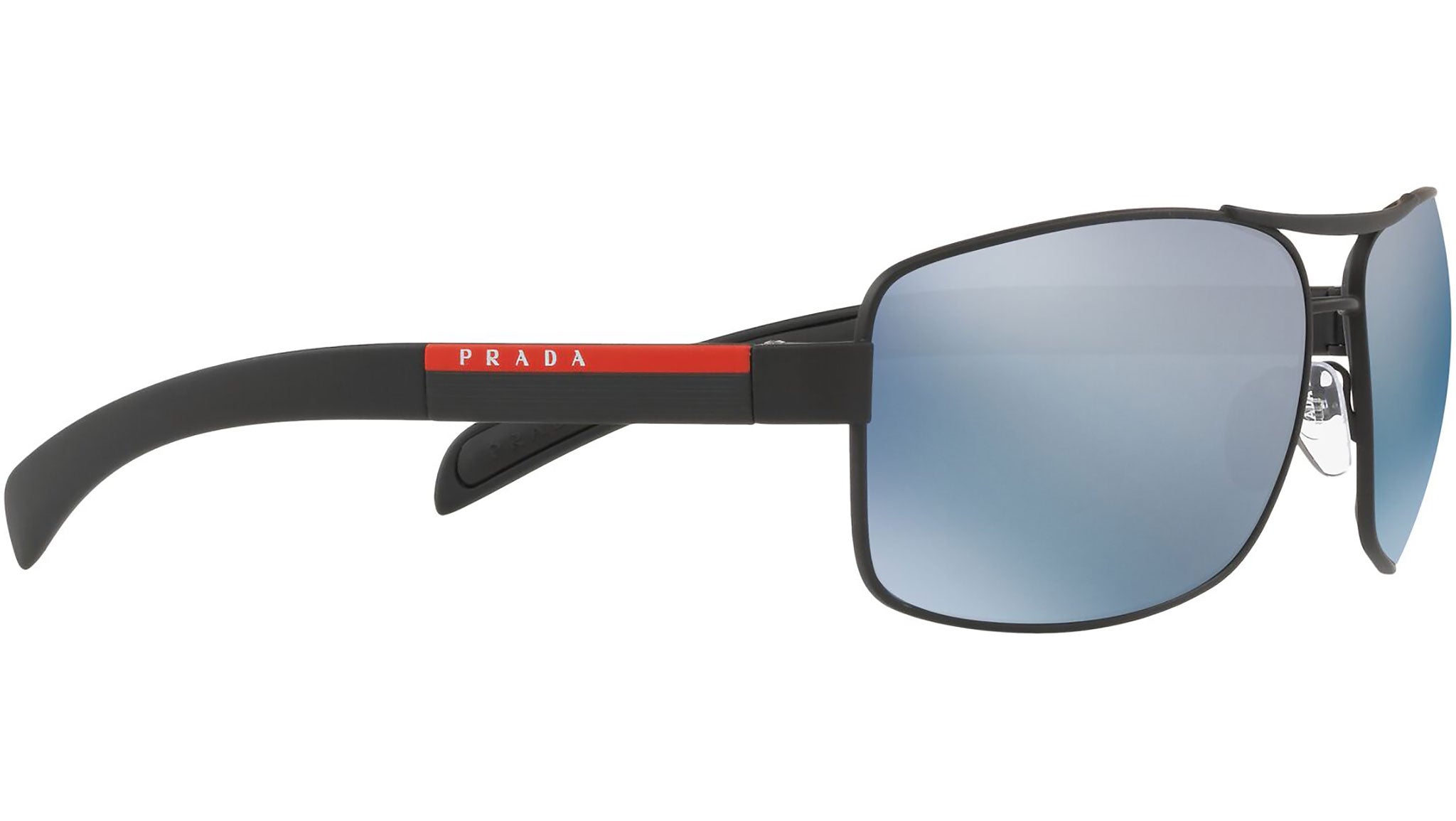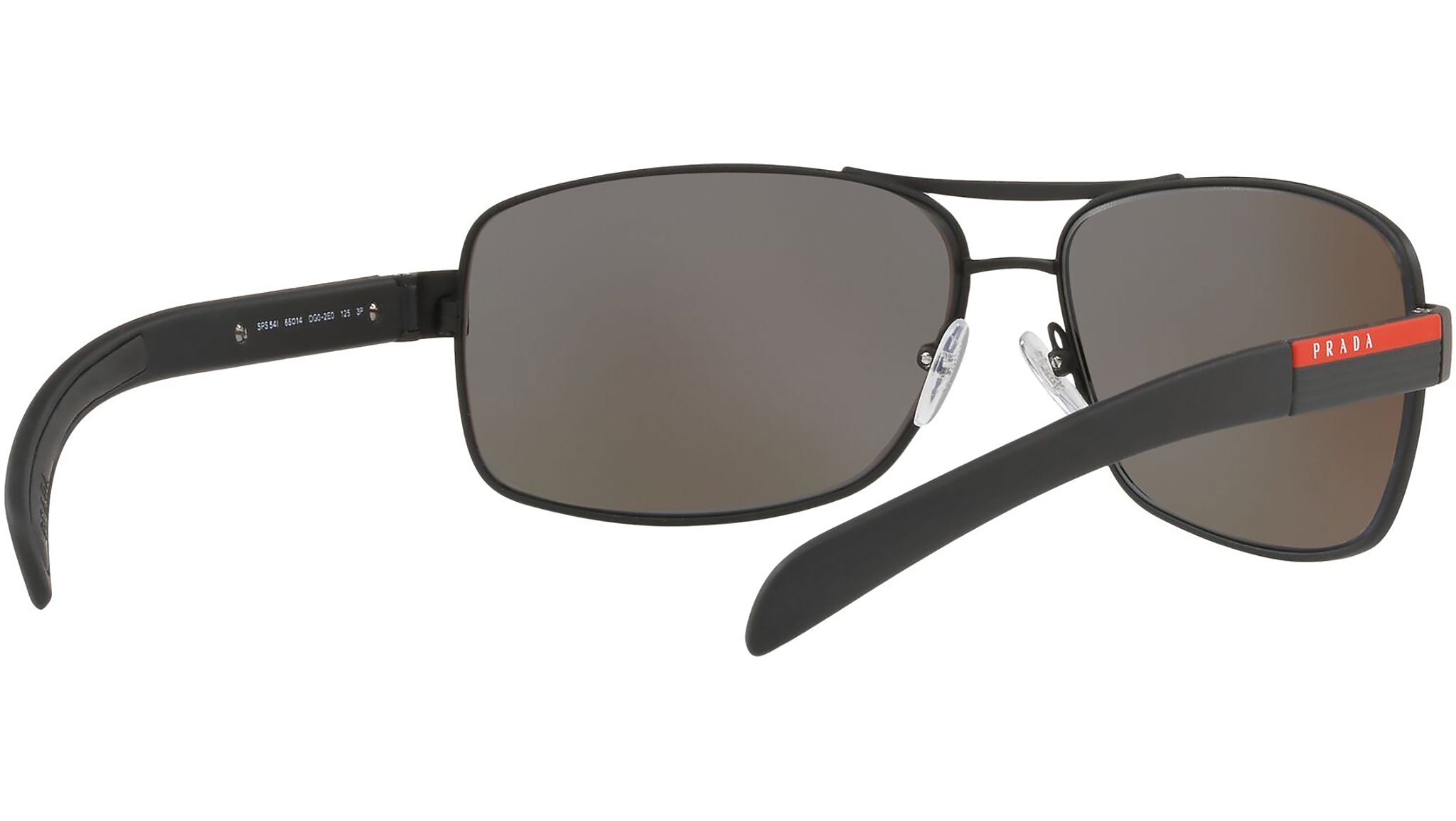 Prada Linea Rossa sunglasses model PS 54IS, black rubber frame variant, color code DG02E0 with polar dark grey mirror water lens. Prada Linea Rossa Sun Collection conveys an everyday casual style with all the quality and craftsmanship of the Prada brand.