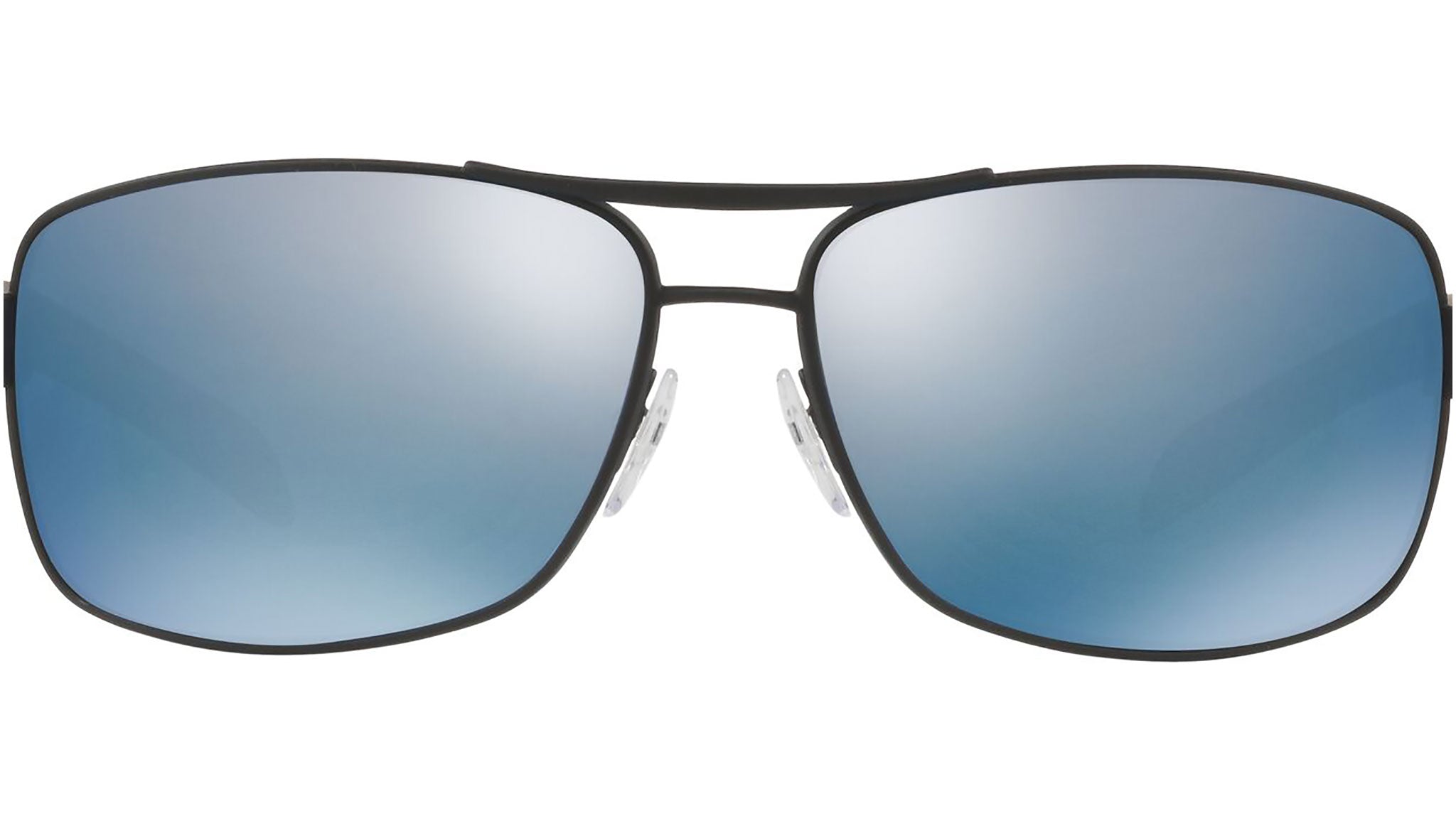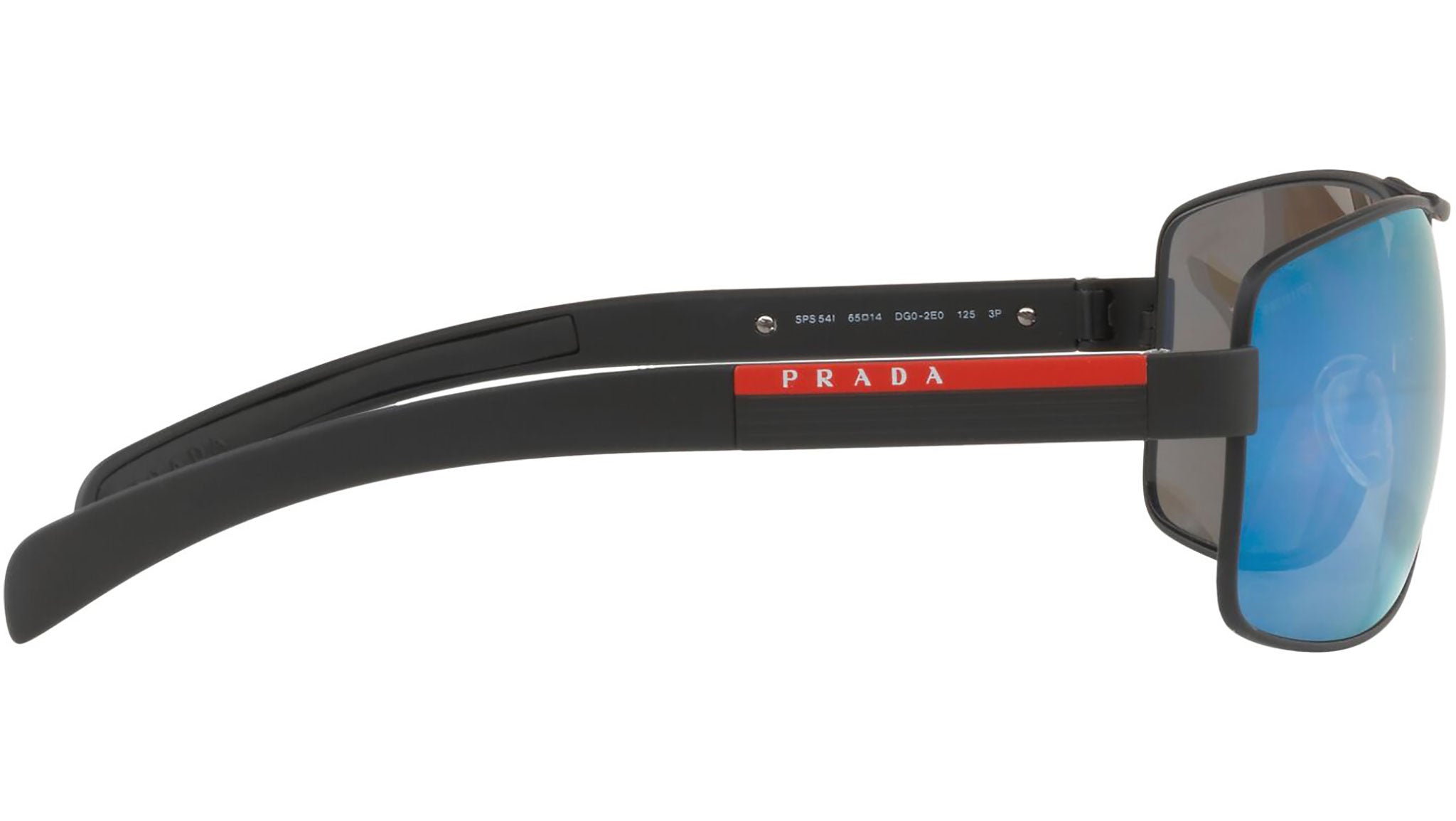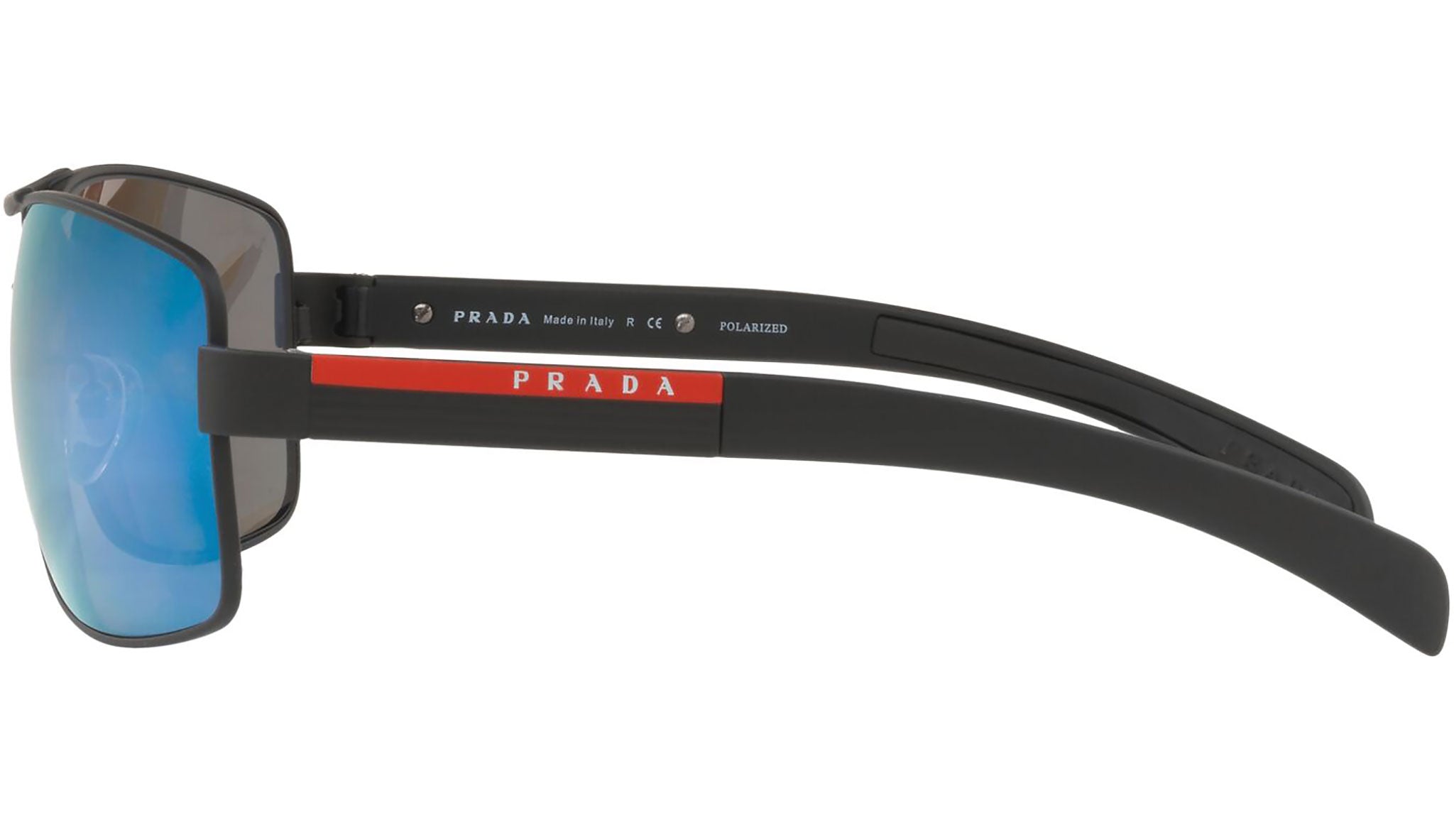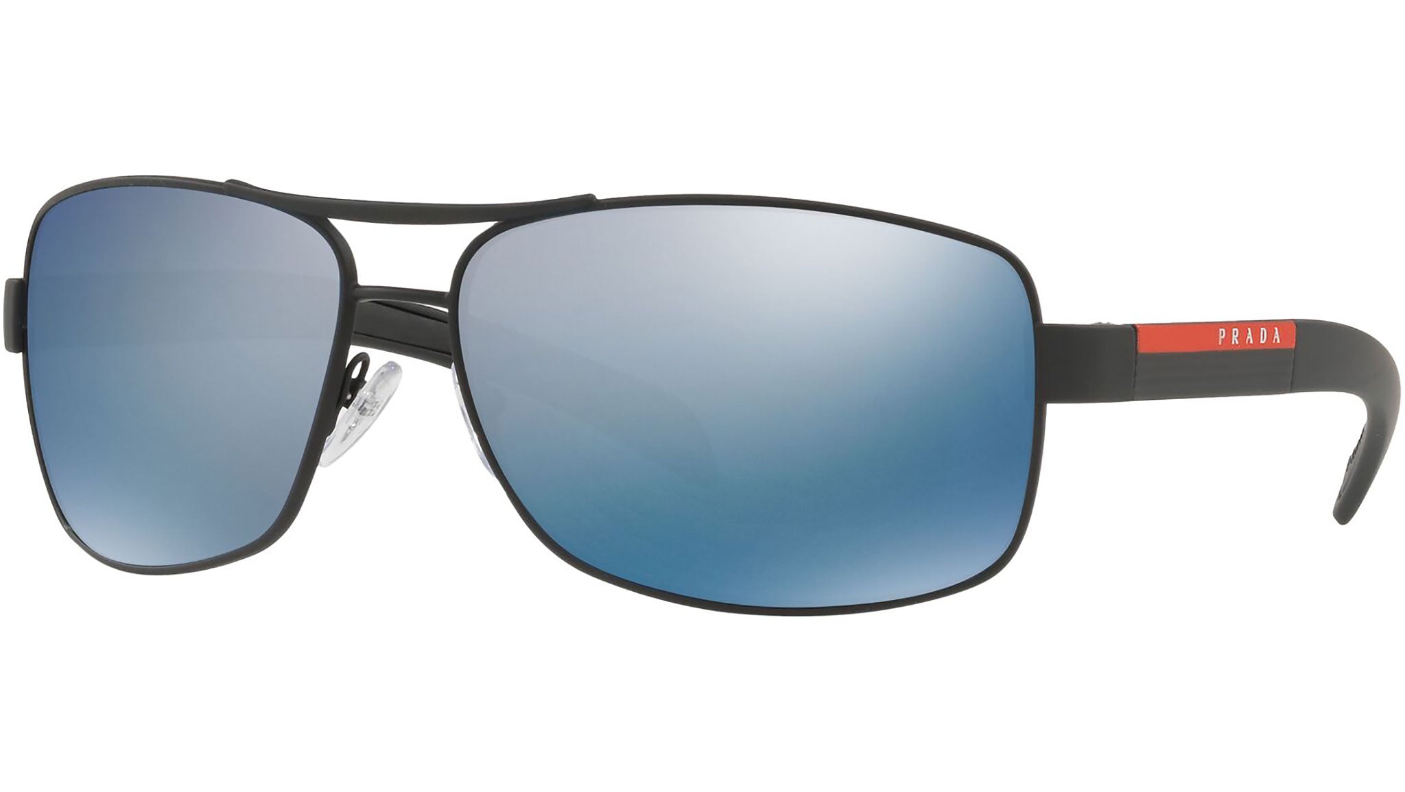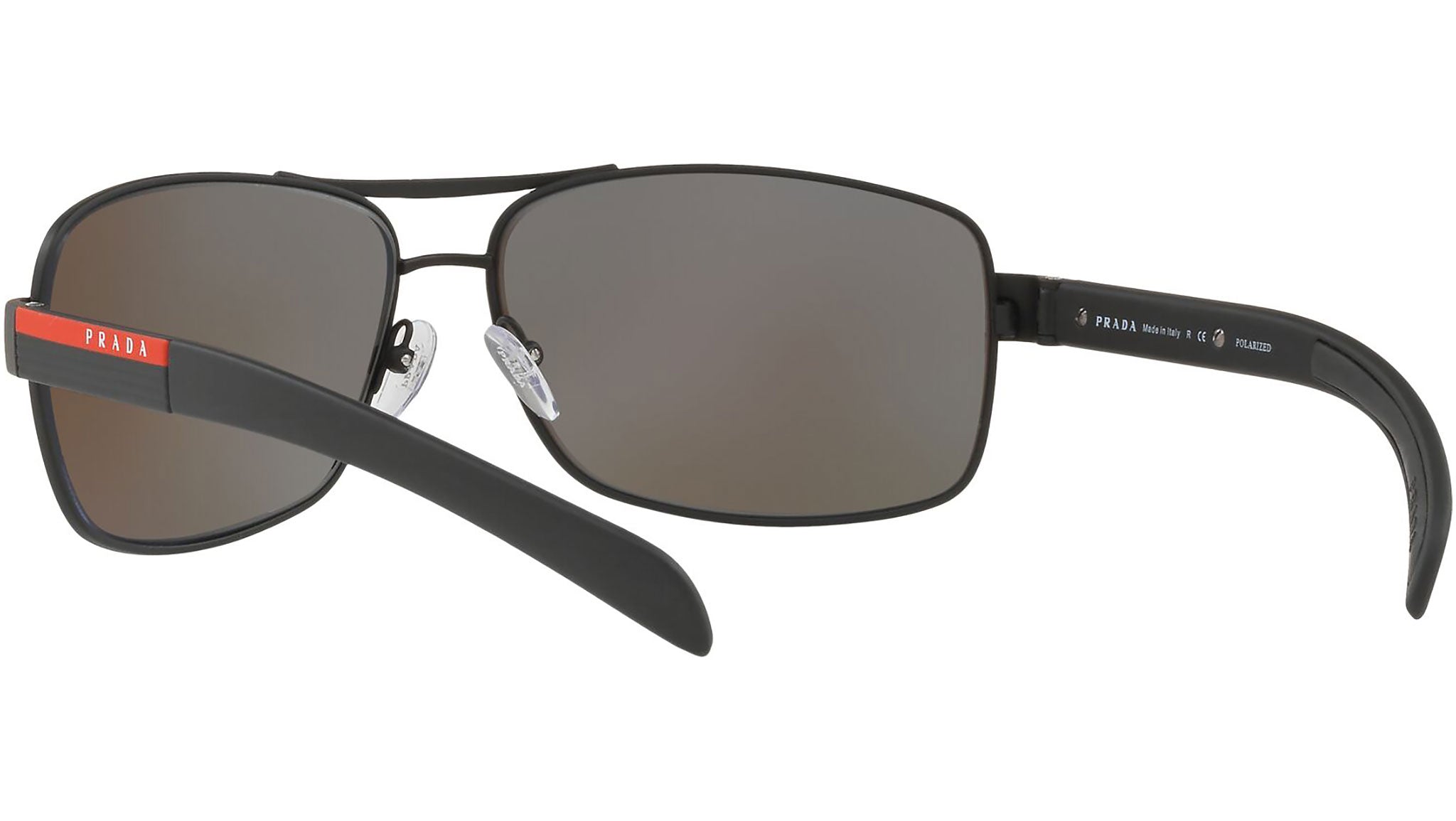 Prada Linea Rossa sunglasses model PS 54IS, black rubber frame variant, color code DG02E0 with polar dark grey mirror water lens. Prada Linea Rossa Sun Collection conveys an everyday casual style with all the quality and craftsmanship of the Prada brand.