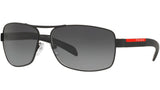 Prada Linea Rossa sunglasses model PS 54IS, black rubber frame variant, color code DG05W1 with polar grey lens. Prada Linea Rossa Sun Collection conveys an everyday casual style with all the quality and craftsmanship of the Prada brand.