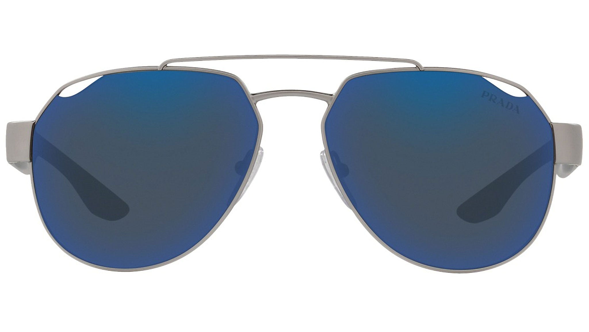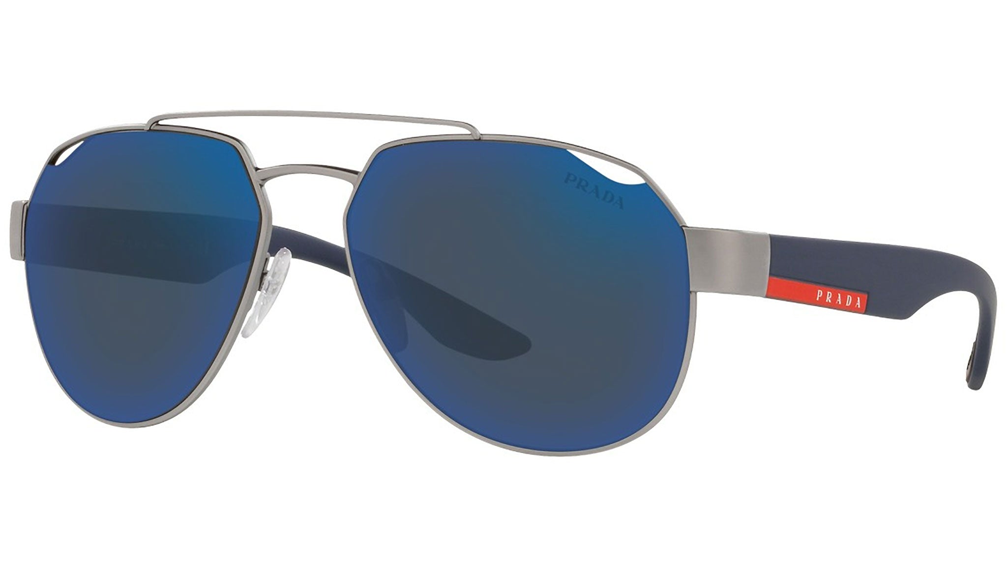 Prada Linea Rossa sunglasses model PS 57US, gunmetal rubber frame variant, color code DG1387 with dark grey ar blue external lens. Prada Linea Rossa Sun Collection conveys an everyday casual style with all the quality and craftsmanship of the Prada brand.