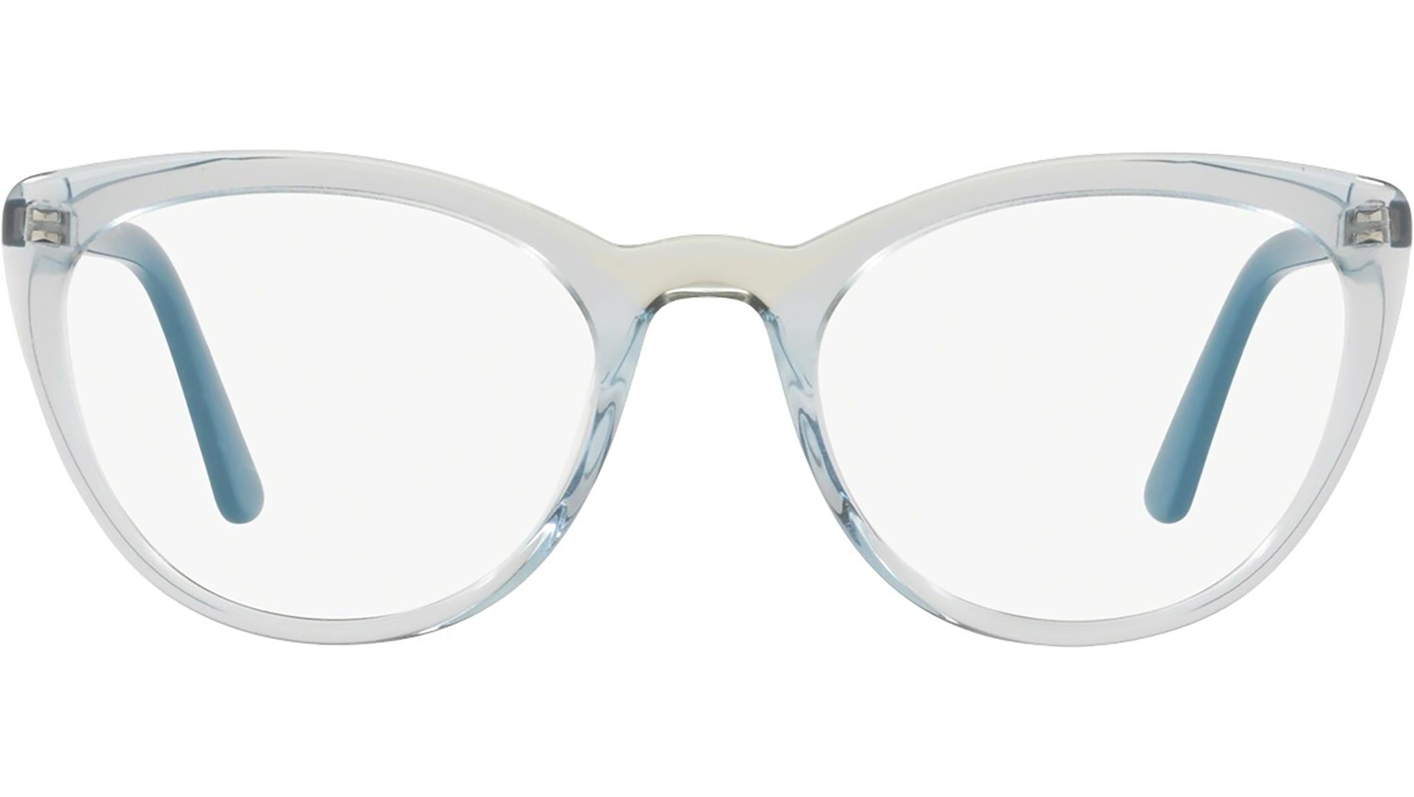 Prada Eyewear Collection model PR 07VV, transparent azure and green frame variant, color code 3251O1. Prada represents the best of Italian culture and tradition. It is one of the most innovative, prestigious and widely recognized brands in the fashion and luxury goods industries, with a keen attention to details and new trends.