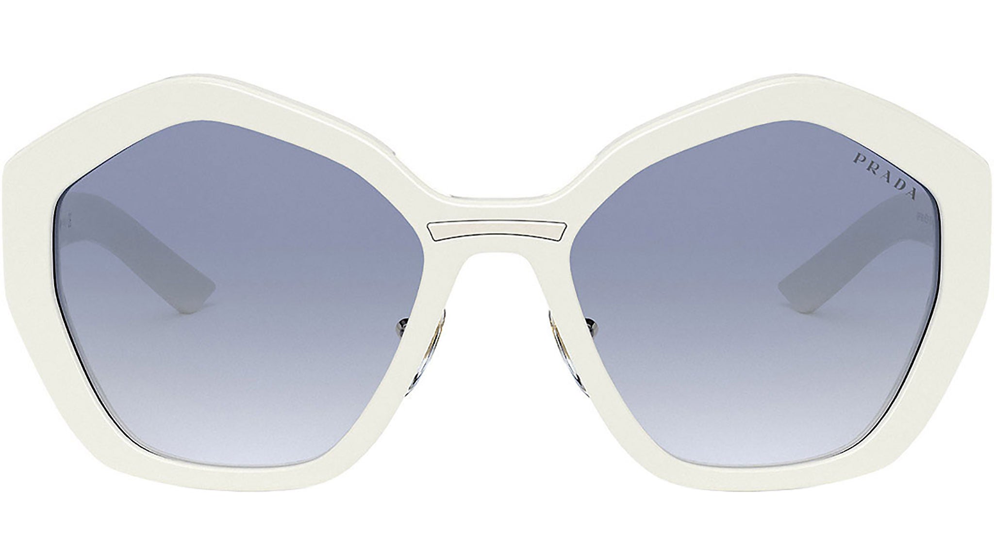 Prada sunglasses model PR 08XS, ivory frame variant, color code 7S3714 with light grey gradient blue lens. Prada represents the best of Italian culture and tradition. It is one of the most innovative, prestigious and widely recognized brands in the fashion and luxury goods industries, with a keen attention to details and new trends.