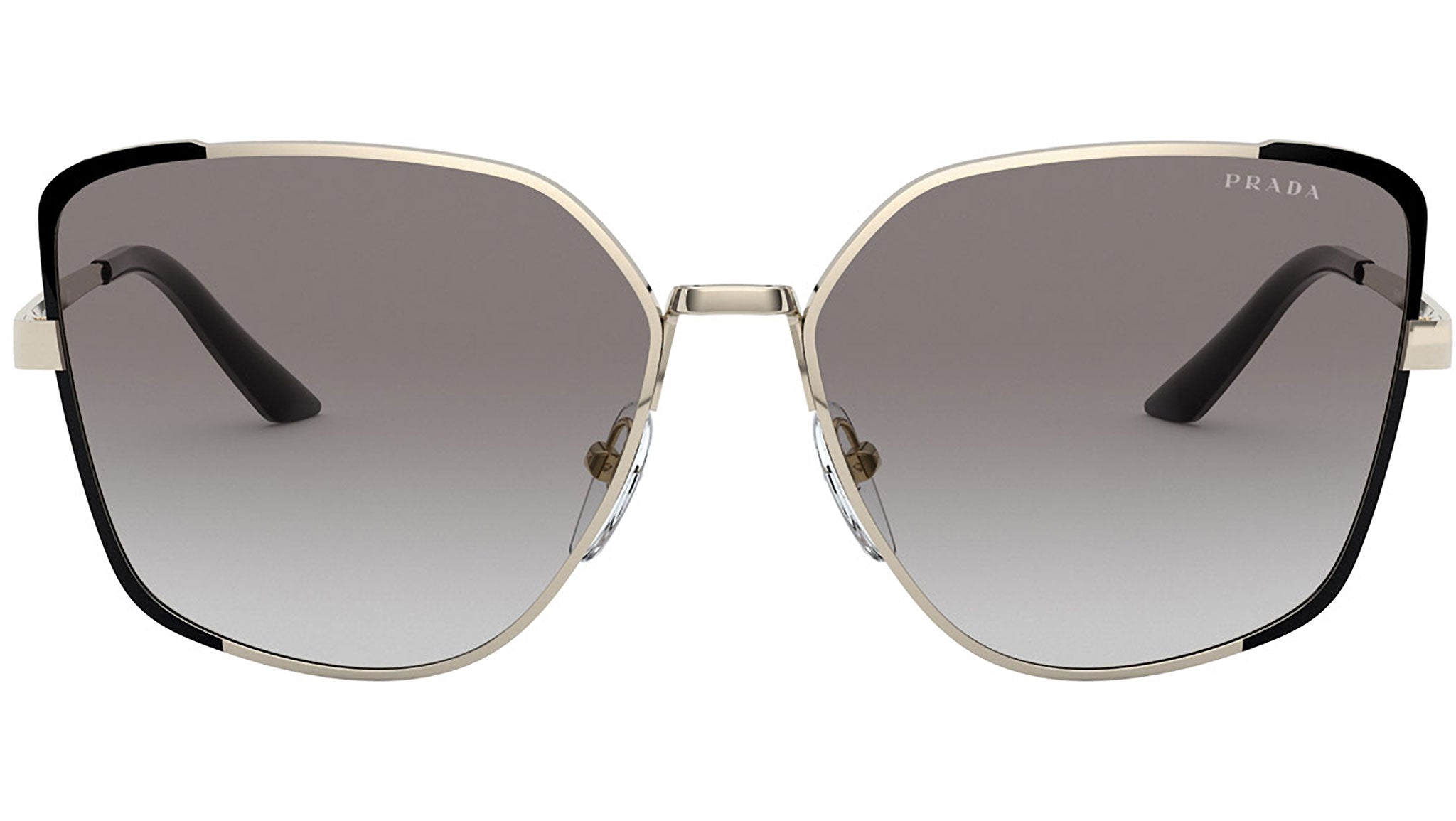 Prada sunglasses model PR 60XS, pale gold and black frame variant, color code AAV0A7 with grey gradient lens. Prada represents the best of Italian culture and tradition. It is one of the most innovative, prestigious and widely recognized brands in the fashion and luxury goods industries, with a keen attention to details and new trends.