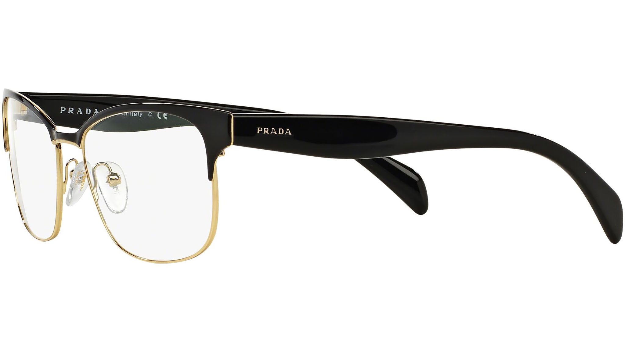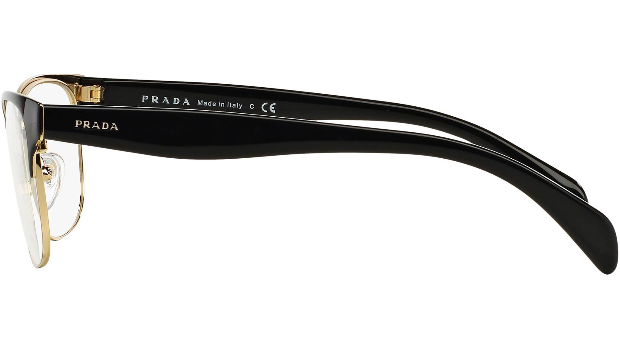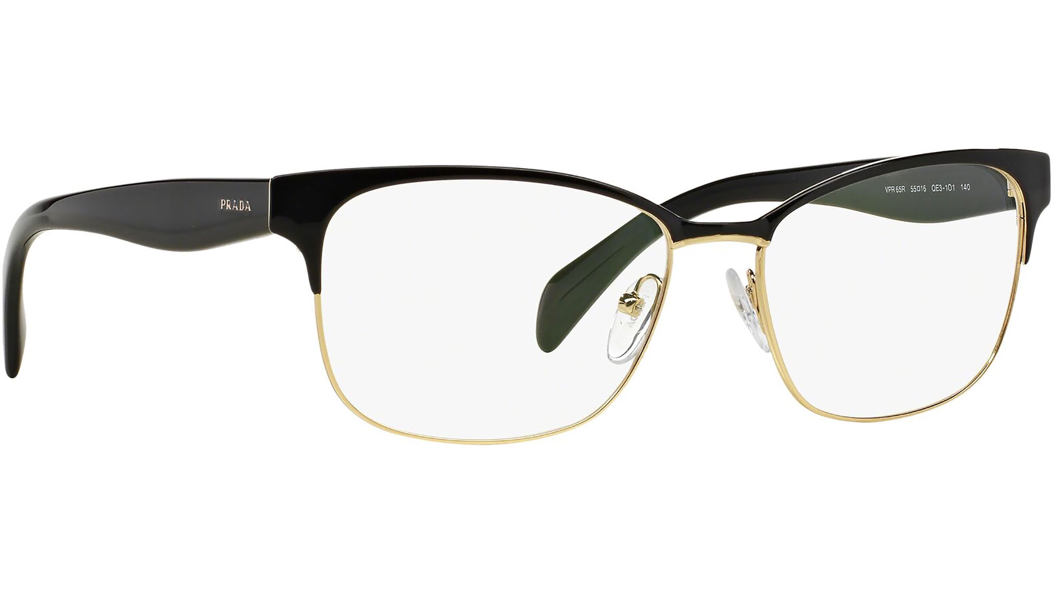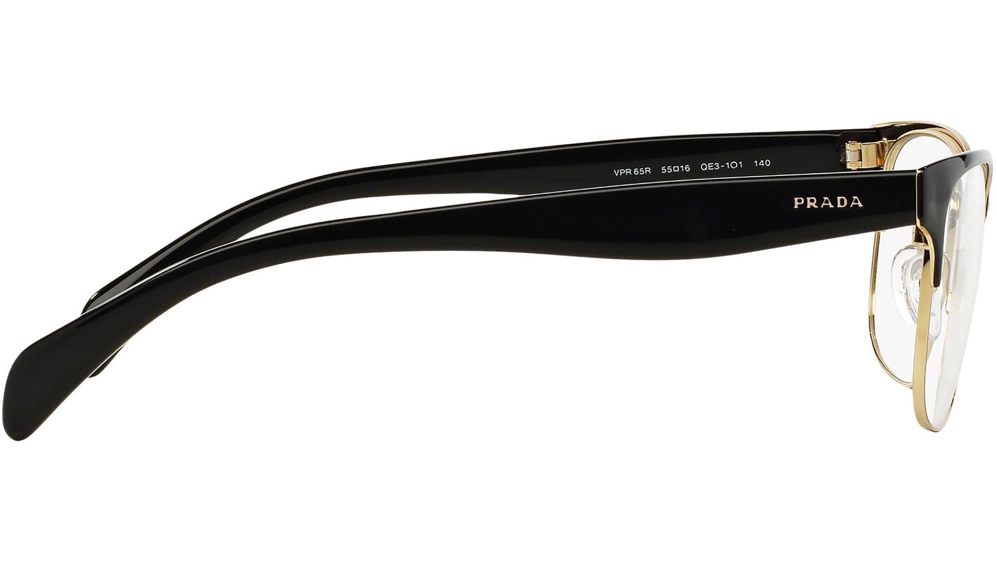 Prada Eyewear Collection model PR 65RV, black on pale gold frame variant, color code QE31O1. Prada represents the best of Italian culture and tradition. It is one of the most innovative, prestigious and widely recognized brands in the fashion and luxury goods industries, with a keen attention to details and new trends.