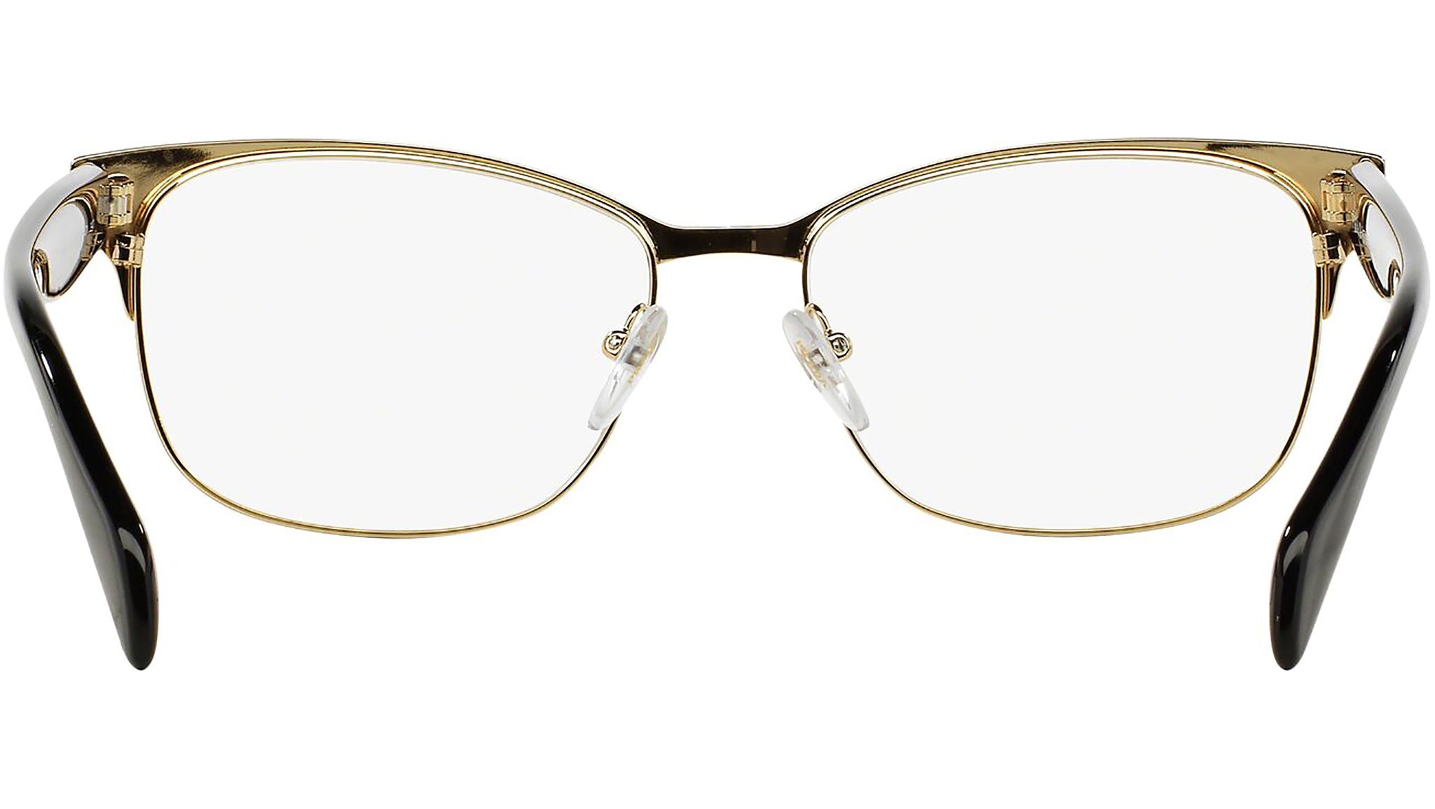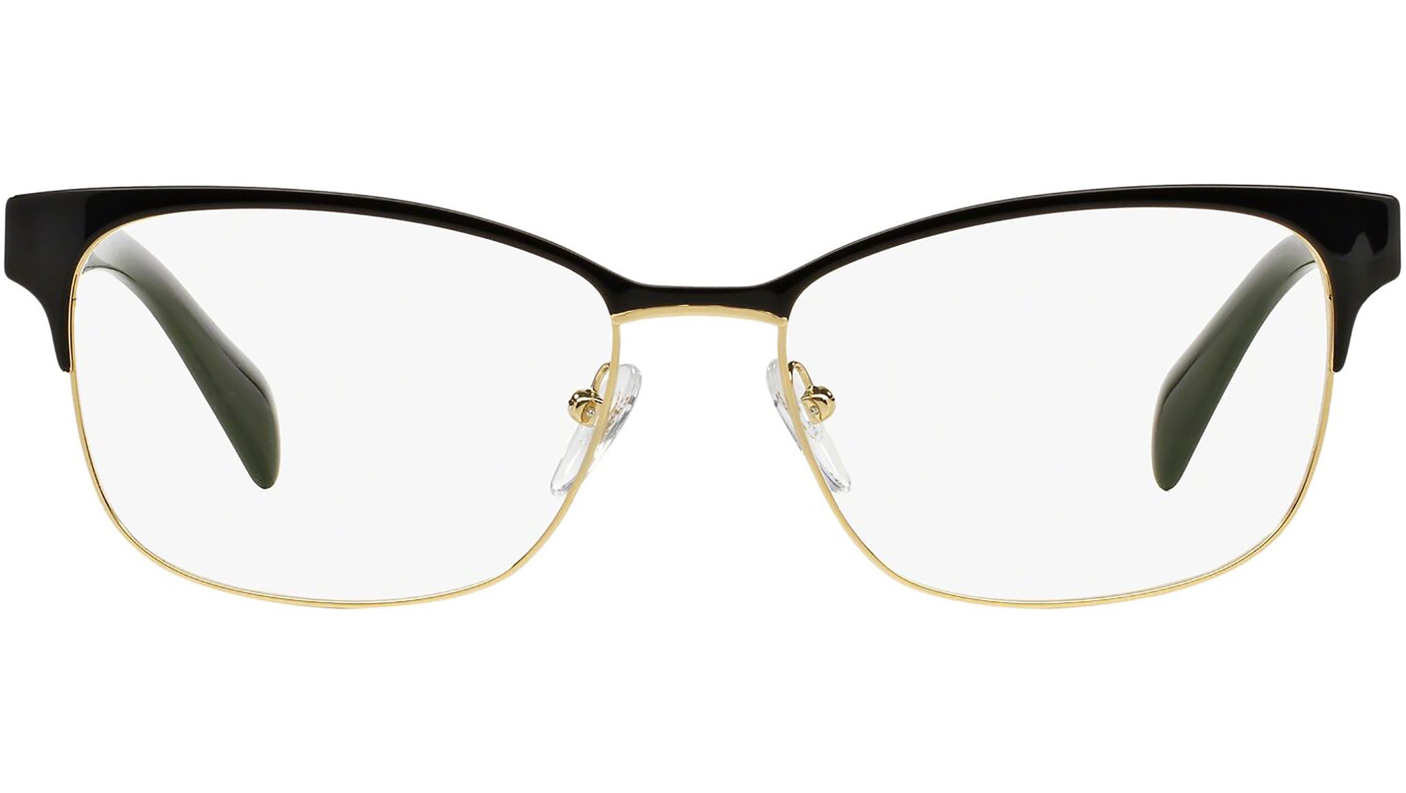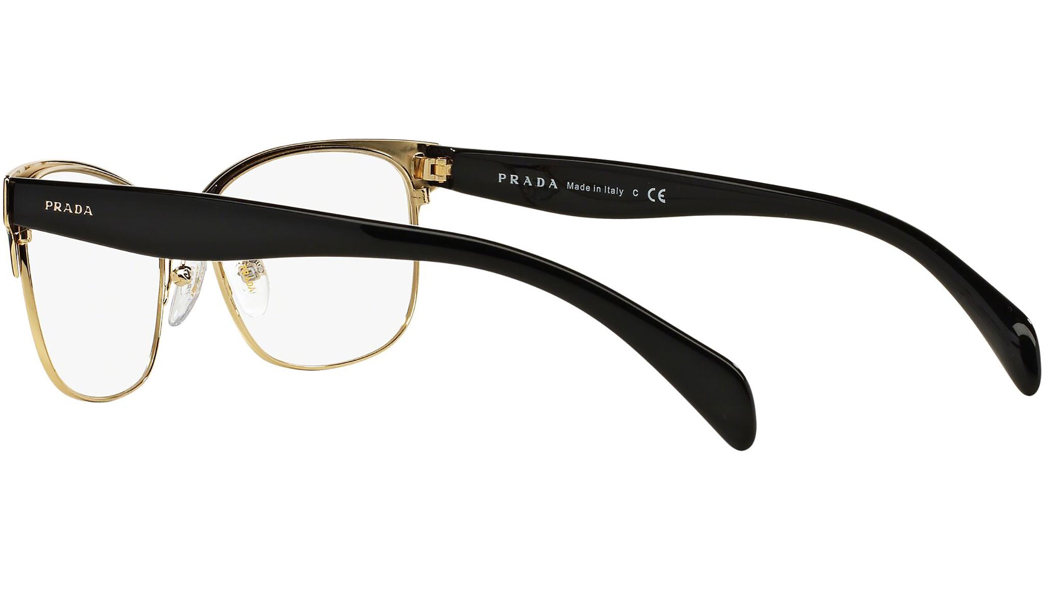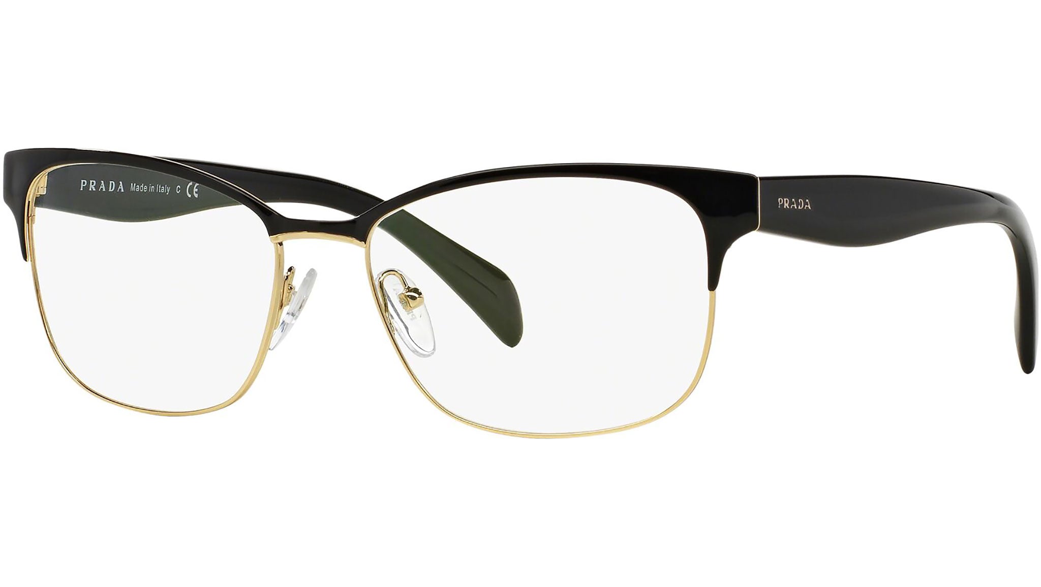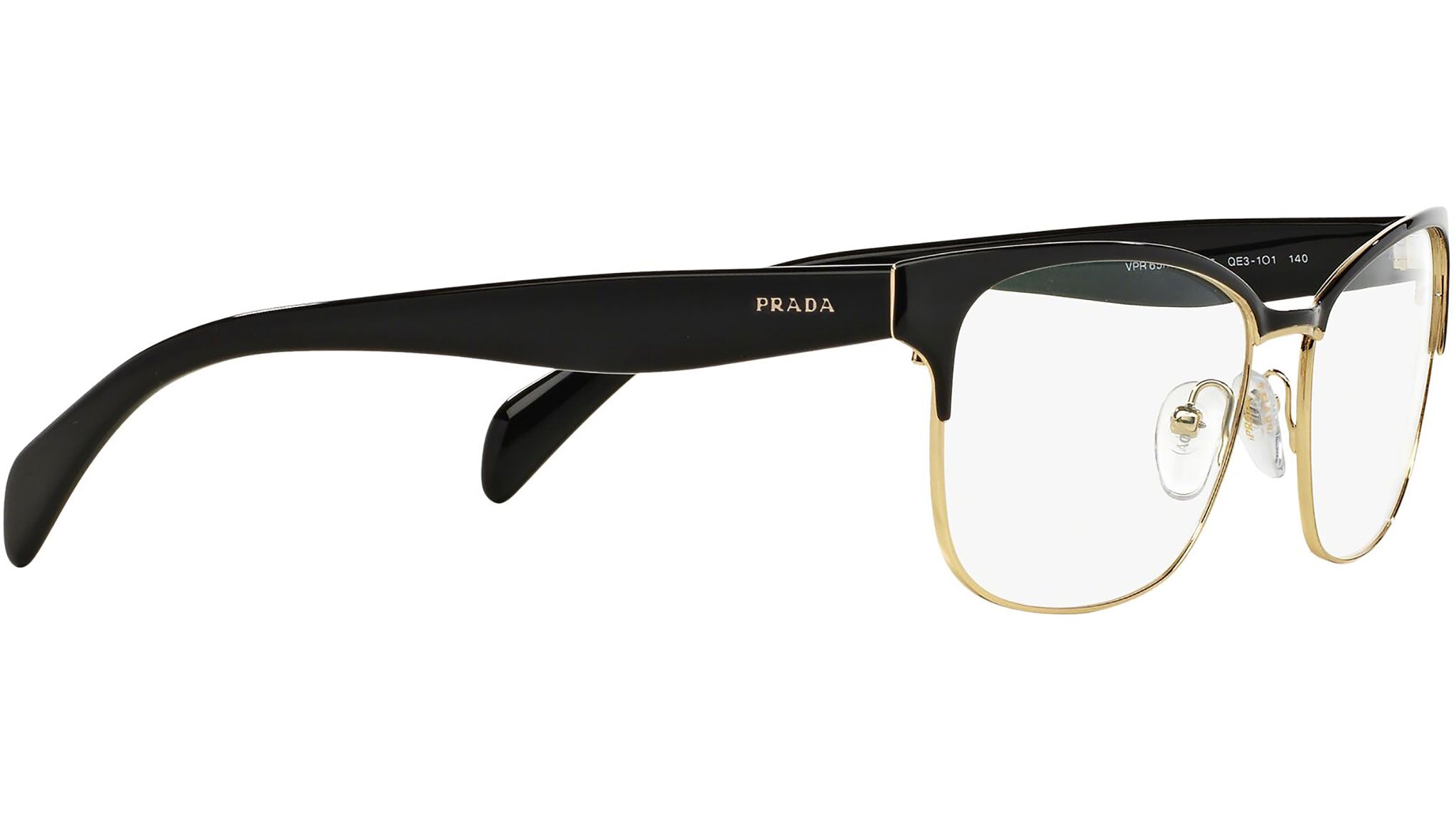 Prada Eyewear Collection model PR 65RV, black on pale gold frame variant, color code QE31O1. Prada represents the best of Italian culture and tradition. It is one of the most innovative, prestigious and widely recognized brands in the fashion and luxury goods industries, with a keen attention to details and new trends.
