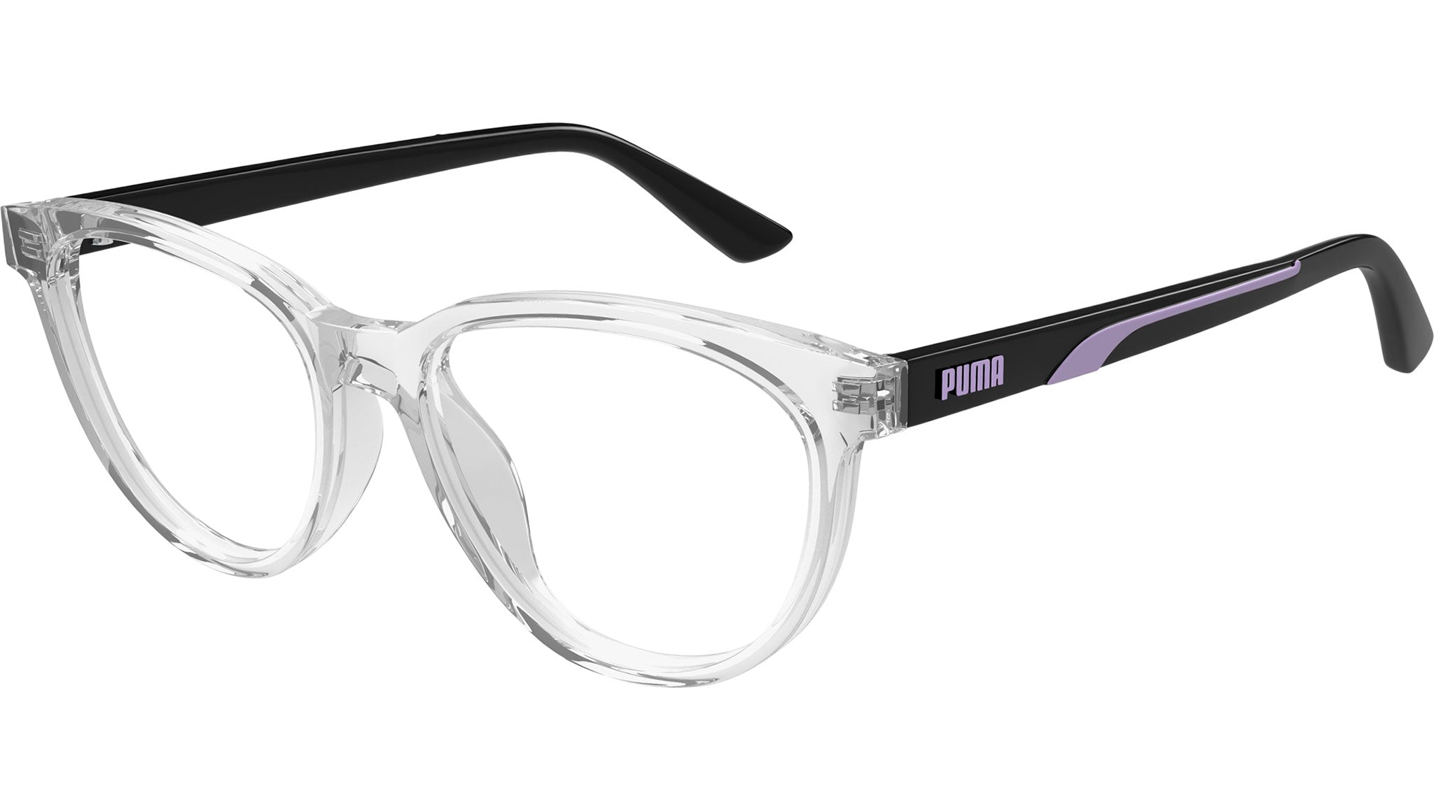 Occhiali da vista Puma Junior modello PJ0079O variante colore 003 cristallo lucido con lenti demo. Rivenditore autorizzato Puma online. Gli occhiali vengono consegnati con custodia e accessori originali e sono coperti dalla garanzia ufficiale di 12 mesi del produttore.