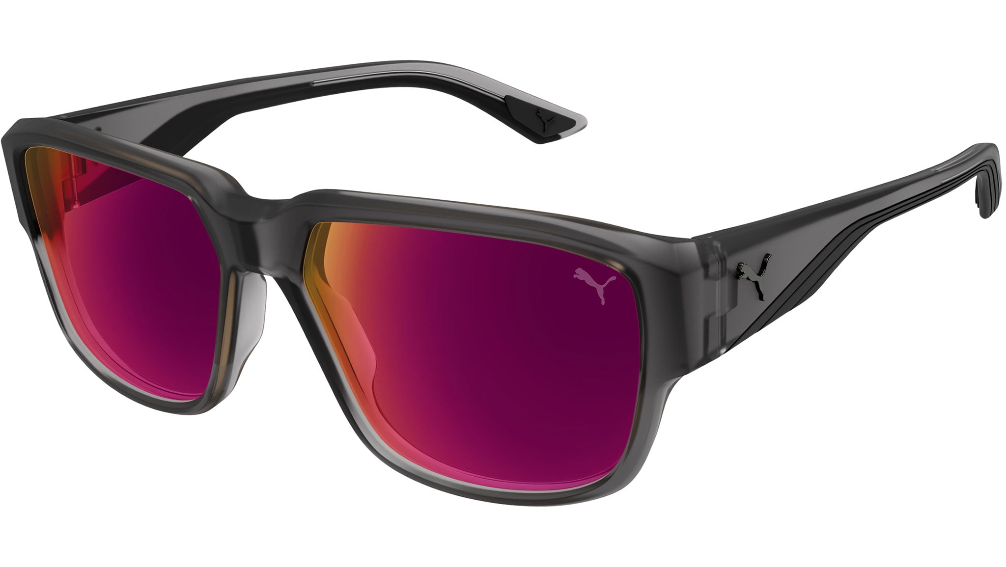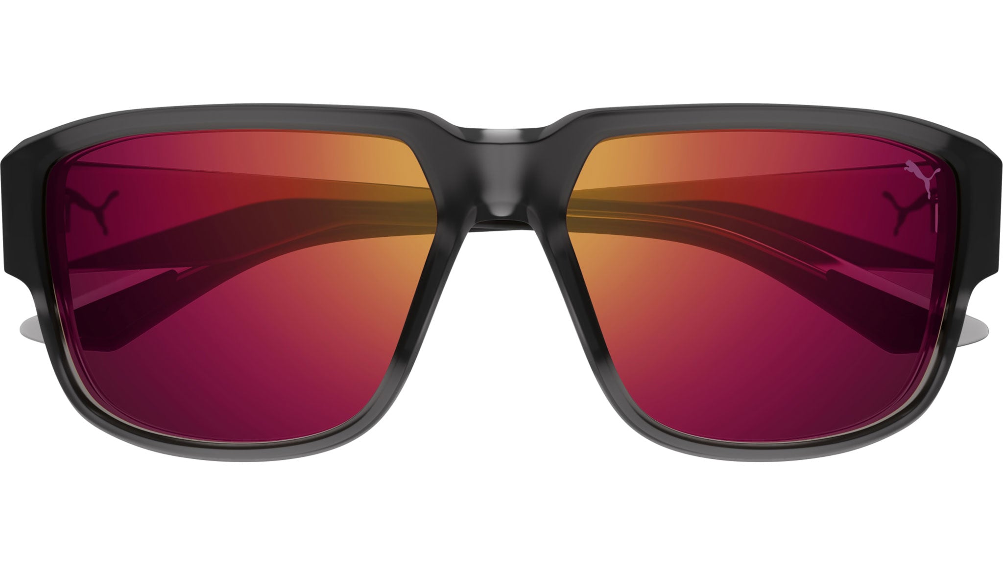 Occhiali da sole Puma Sport modello PU0445S variante colore 003 grigio scuro opaco trasparente con lenti color verde solido + ml infrarosso. Rivenditore autorizzato Puma online. Gli occhiali vengono consegnati con custodia e accessori originali e sono coperti dalla garanzia ufficiale di 12 mesi del produttore.