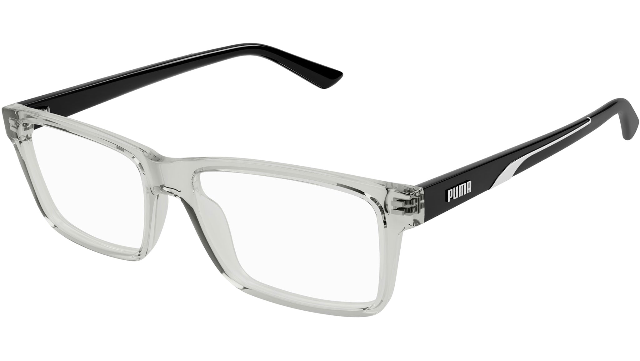 Occhiali da vista Puma Essential modello PU0471O variante colore 005 cristallo lucido con lenti demo. Rivenditore autorizzato Puma online. Gli occhiali vengono consegnati con custodia e accessori originali e sono coperti dalla garanzia ufficiale di 12 mesi del produttore.