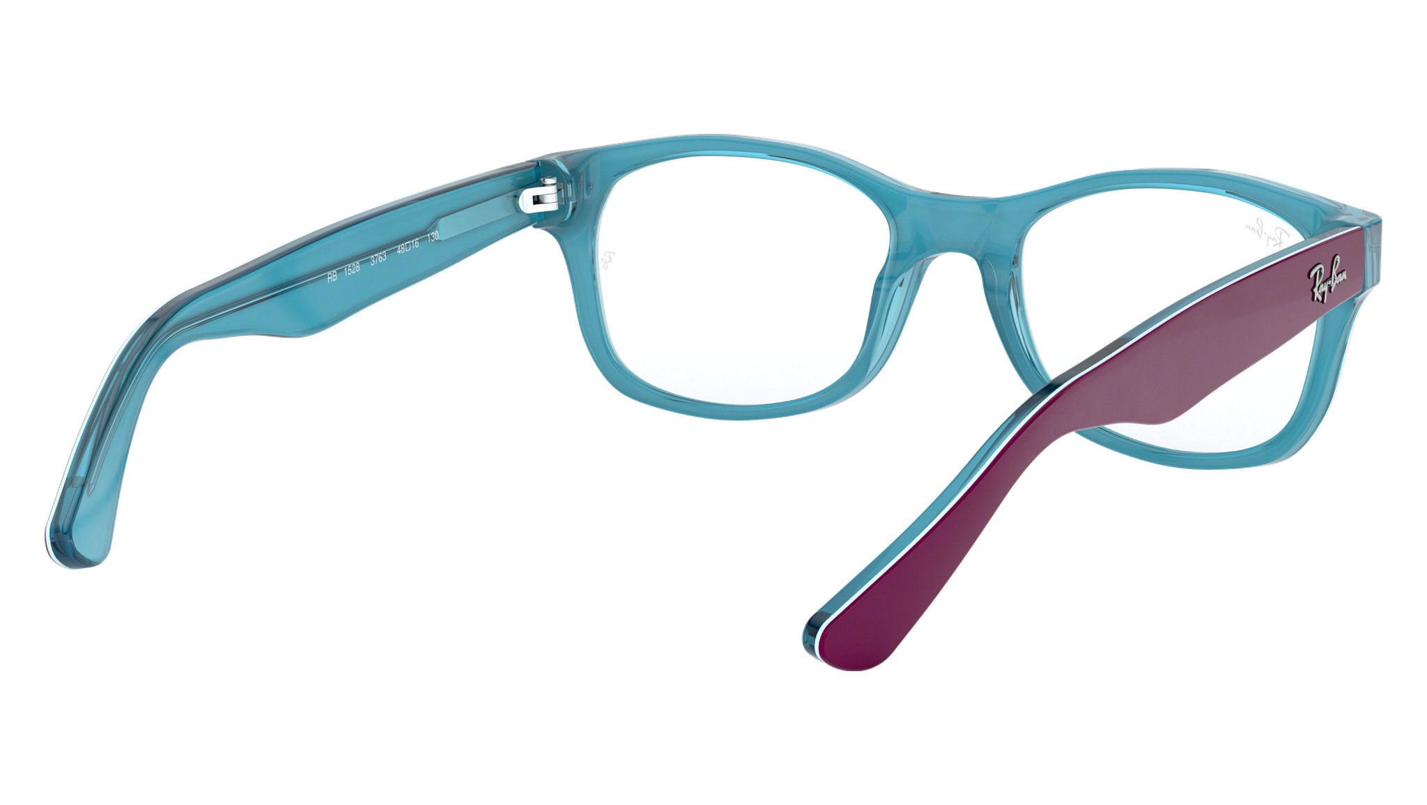 Occhiali da vista Ray-Ban Kids RY1528 color blu trasparente su fuxia in acetato codice colore 3763. Forma quadrata full rim con lenti demo. Con custodia originale e garanzia. Rivenditore autorizzato Ray-Ban.