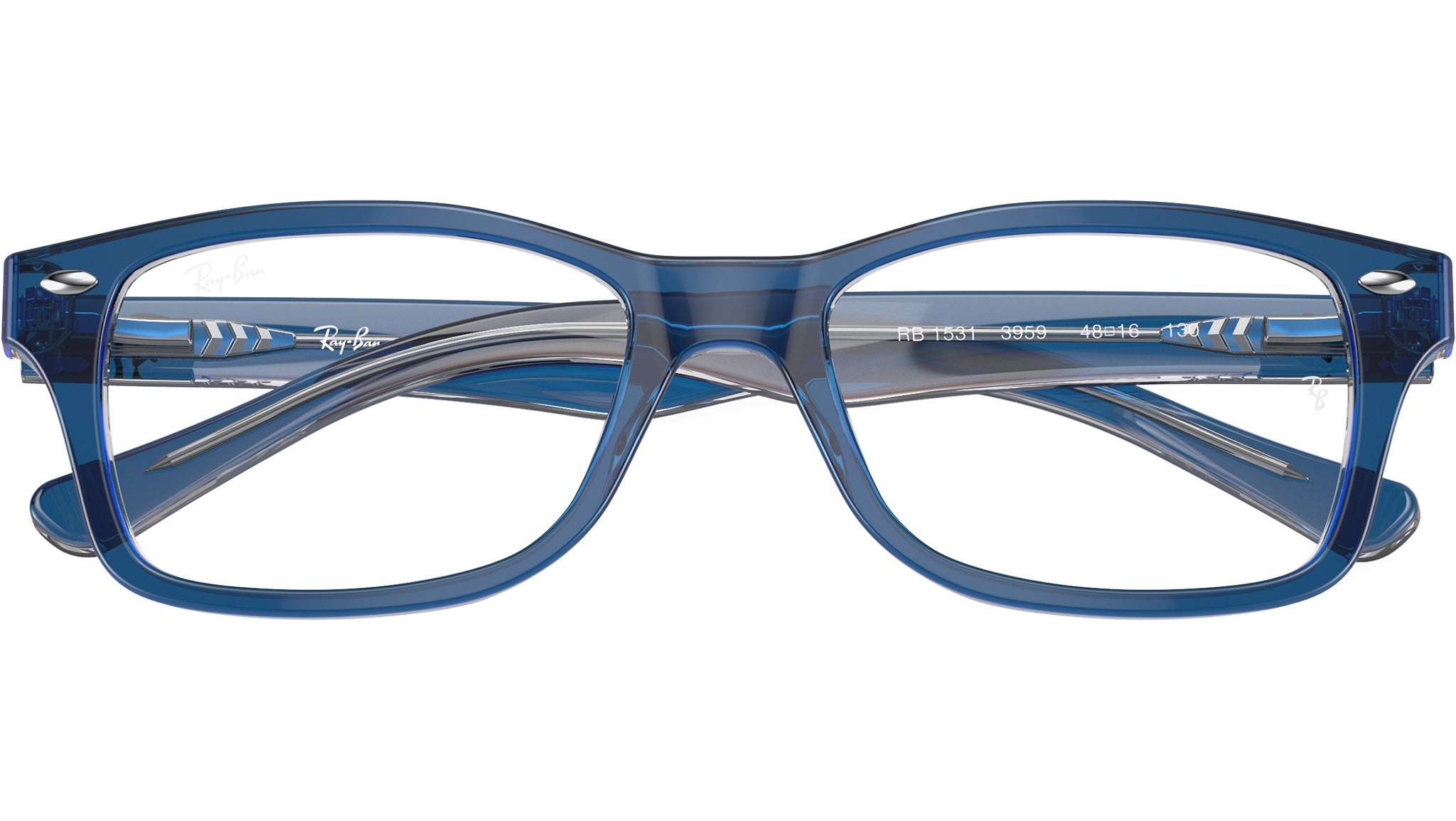 Occhiali da vista Ray-Ban Kids RY1531 color top blu scuro / marrone / grigio chiaro in acetato codice colore 3959. Forma unisex quadrata full rim con lenti demo. Con custodia originale e garanzia. Rivenditore autorizzato Ray-Ban.