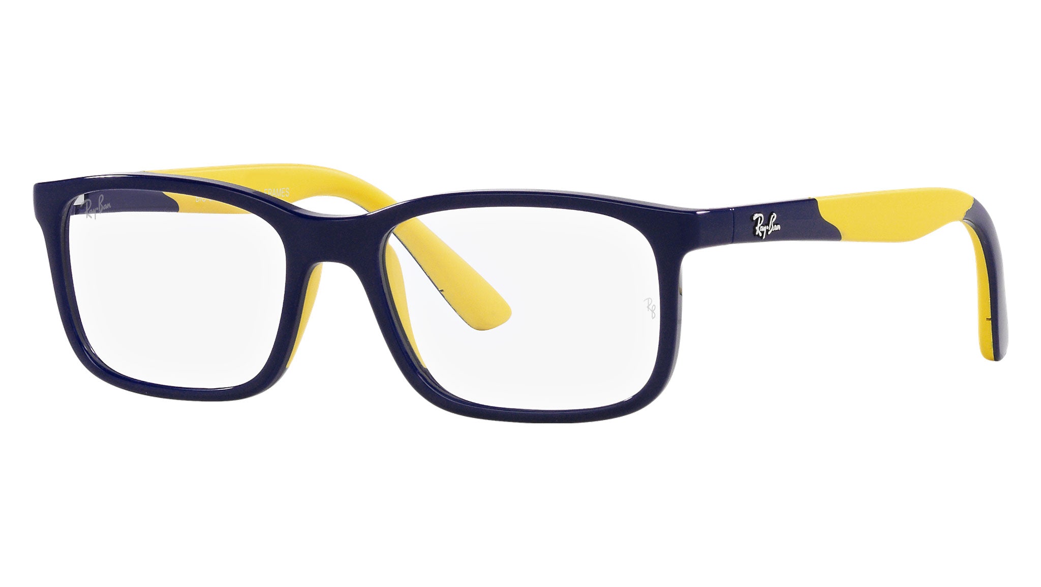 Occhiali da vista Ray-Ban Kids RY1621 color blu scuro su giallo in iniettato codice colore 3937. Forma unisex rettangolare full rim con lenti demo. Con custodia originale e garanzia. Rivenditore autorizzato Ray-Ban.