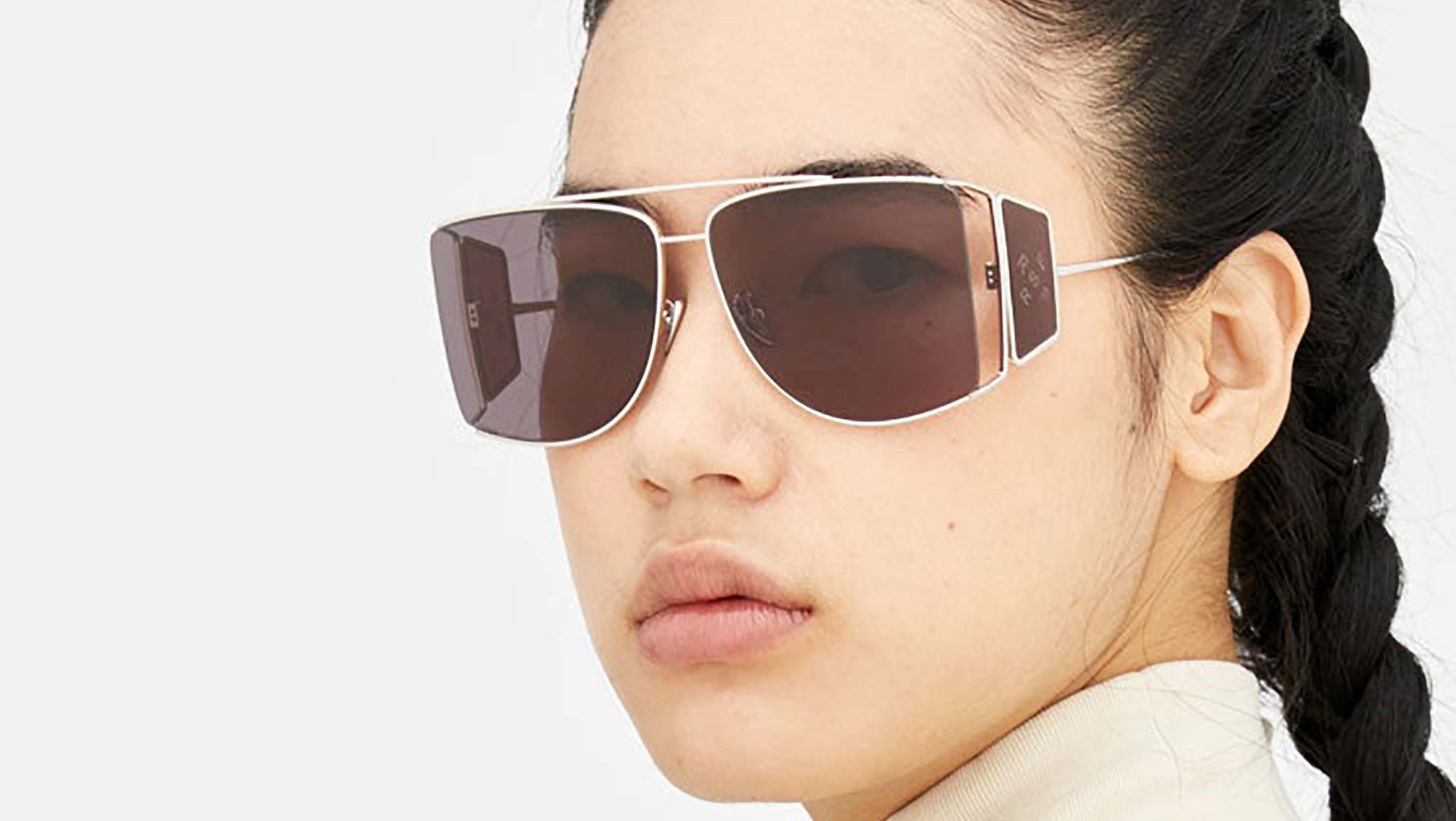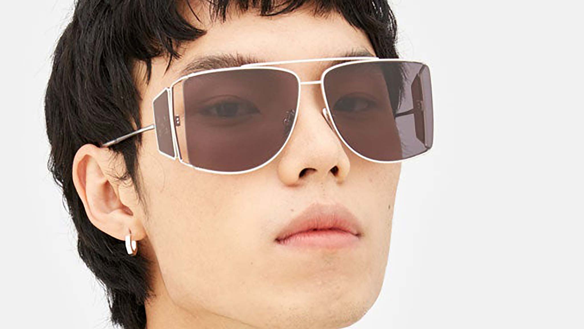 A forward-looking shape, Autore reinvents the classic design of aviator-style frames, adding a whole new dimension with an emphasis on both wearability and cutting-edge style. An all-metal frame, Autore is characterized by a double nose-bridge and light metal rims. The model features a unique lens shape, with a straight edge on the outer line. Oversized metal rims keep the lenses tightly in place, while leaving the edges exposed for a unique, edgy statement. This version features gun-metal rims and faded black lenses. Sizes: R Lens Width: 63 mm. Frame Front: 146 mm. Frame Side: 140 mm. Product Code Size R: BS5
