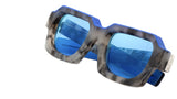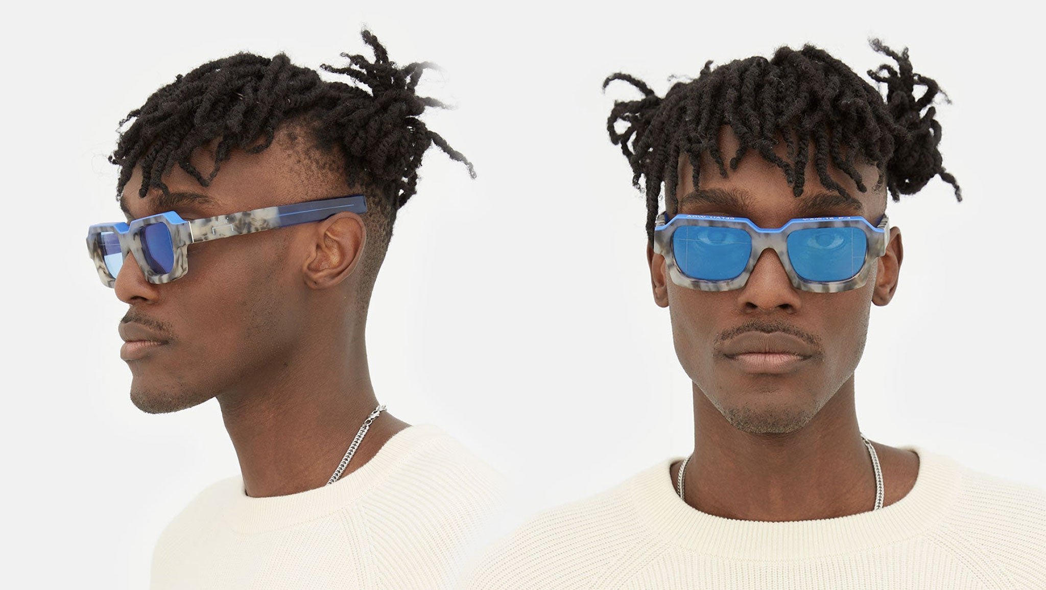 Designed for the cult British menswear brand A Cold Wall, this version of Caro is a statement piece of eyewear characterized by its ultra-thick profile and squared lenses. The model’s geometric design has been crafted from solid acetate to emphasize the materiality of the shape. This aesthetic language draws from ACW’s exploration of architectural design qualities, applying it to high-end fashion. This version features a matte grey marble finish on the frontal frame and temples, with bold electric blue detailing on the top. Matching tinted lenses and crystal temple tips complete the piece.