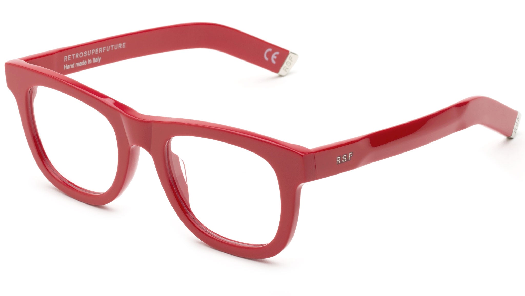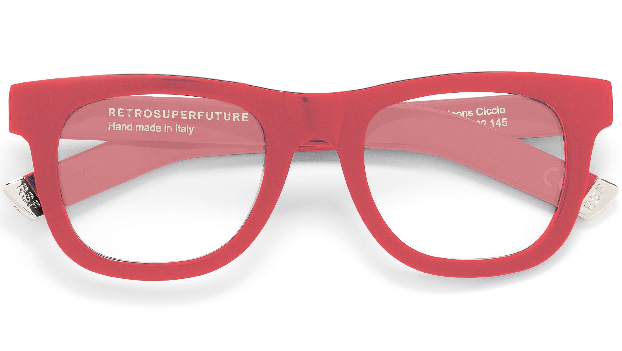 Ciccio is a thick frame characterized by wide lenses and well-rounded curves. An iconic RSF silhouette, this model has a perfect fit, adapted for an all-day everyday use with carefully moulded acetate rims. Its sturdy build and statement detailing on the temples complete this bright red model. Prescription lenses not included.The box contains a hard case and a cleaning cloth.