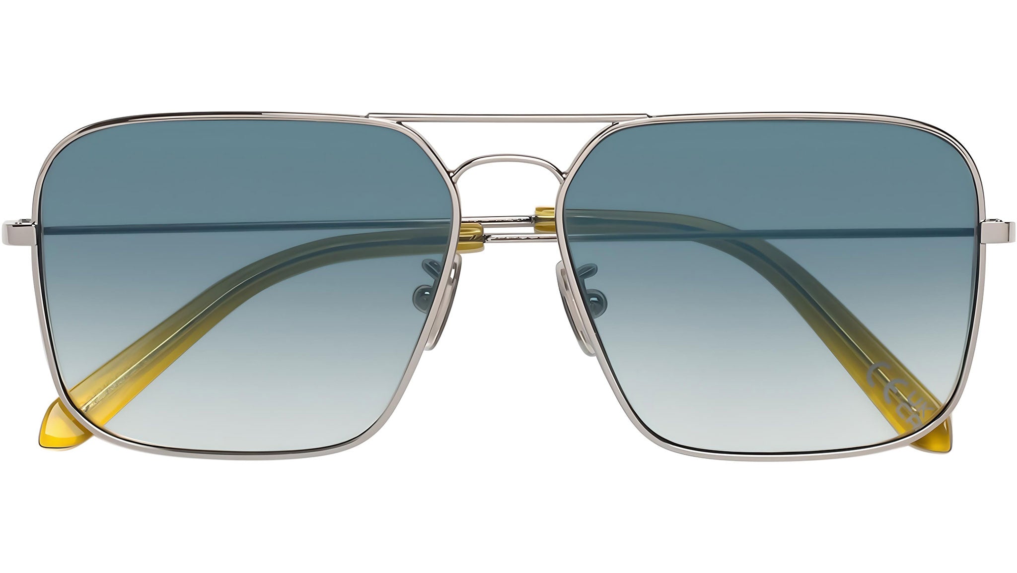 Iggy is a fresh boxy spin-off from the classic shaped aviator frames. The sturdy metal frame is characterized by a clean and essential structure, double metal bridge and wide rectangular lenses. This version of the model features elegant and classic finish with silver metal galvanic and playful blue faded lenses juxtaposed with soft crystal mustard acetate on the temple tips. Sizes: R. Lens Width: 58 mm. Frame Front: 0 mm. Frame Side: 140 mm. Product Code Size R: MD3.