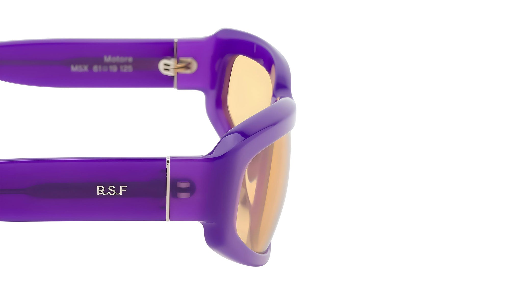 Motore came to this earth with an athletic core, but gradually matured with time and thanks to its evolution this design grew into an elegant and fashion forward piece that boasts a strong confident character. Motore’s sharp lines and low riding frame kept the eyewear’s fast character, while its meticulous acetate carving and refined details gave the piece its distinctive and sophisticated manner. This version is available in a unique purple acetate and elegant mustard lenses. Sizes: R. Lens Width: 61 mm. Frame Front: Frame Side: 125 mm. Product Code Size R: M5X.