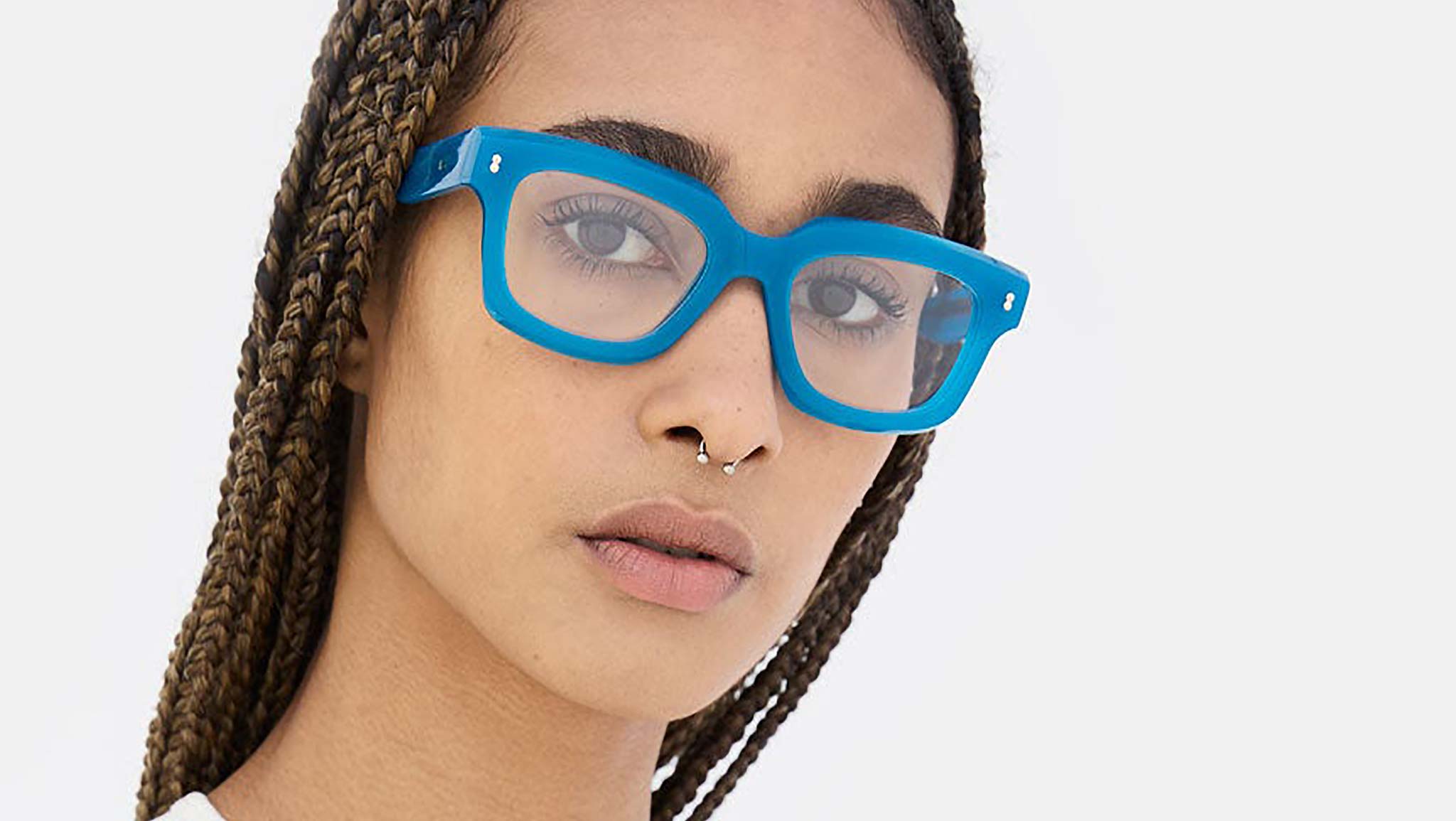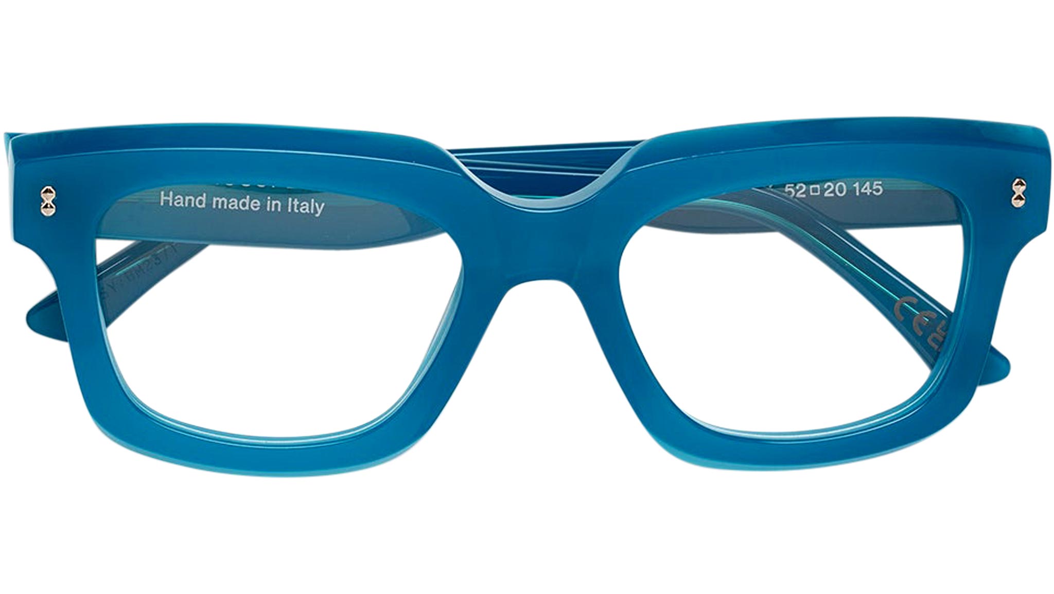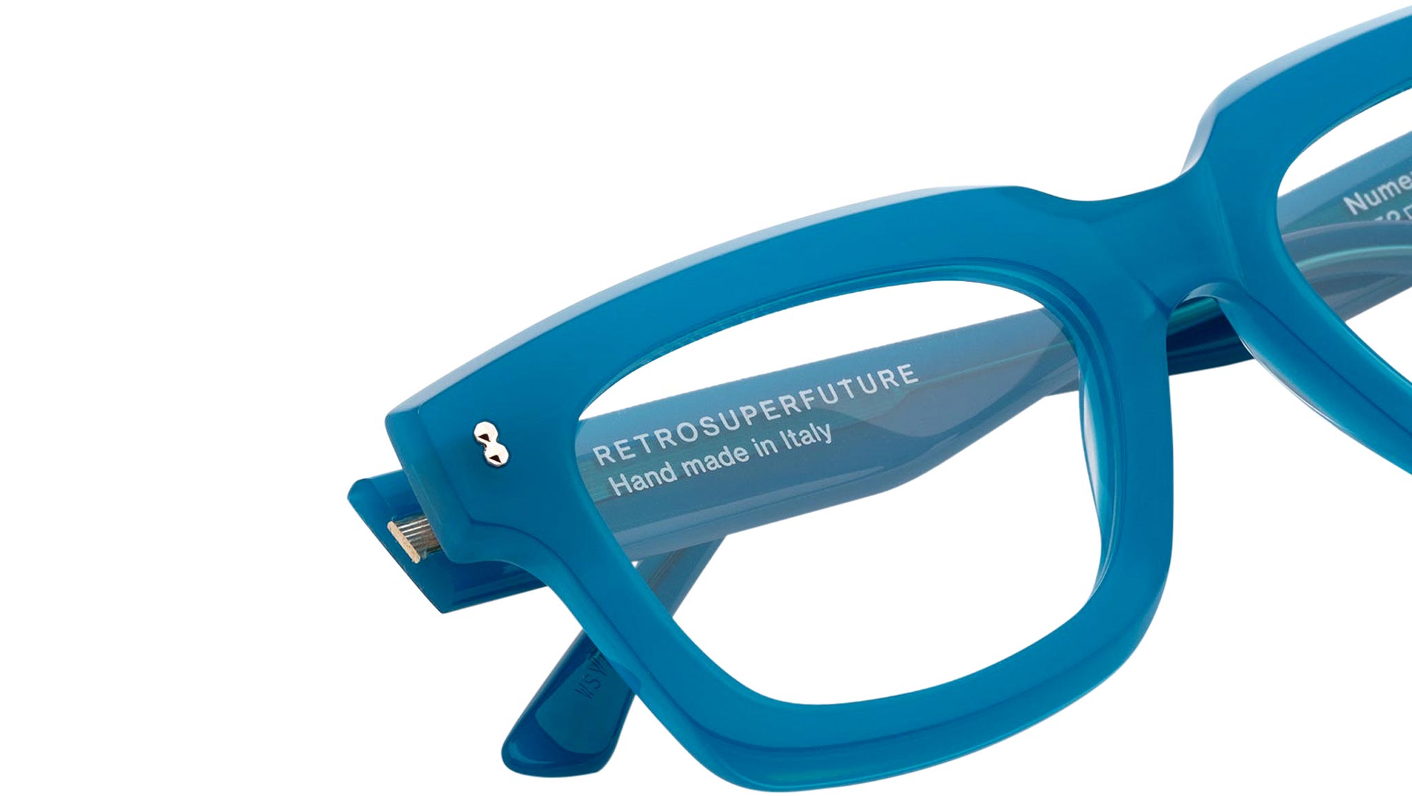 Numero 118 by Retrosuperfuture is a unique silhouette that reinterprets timeless vintage frames with a fresh, contemporary design. Characterized by thick, sturdy rims, the model features two studs on the temples and a keyhole nose-bridge, in reference to 1950s shapes. Its bold proportions and oversized lenses update this classic shape for a sharp modern aesthetics. This silhouette comes in a vibrant blue acetate with silver detailing. Sizes: R Lens Width: 52 mm. Frame Front: Frame Side: 145 mm. Product Code Size R: WSY