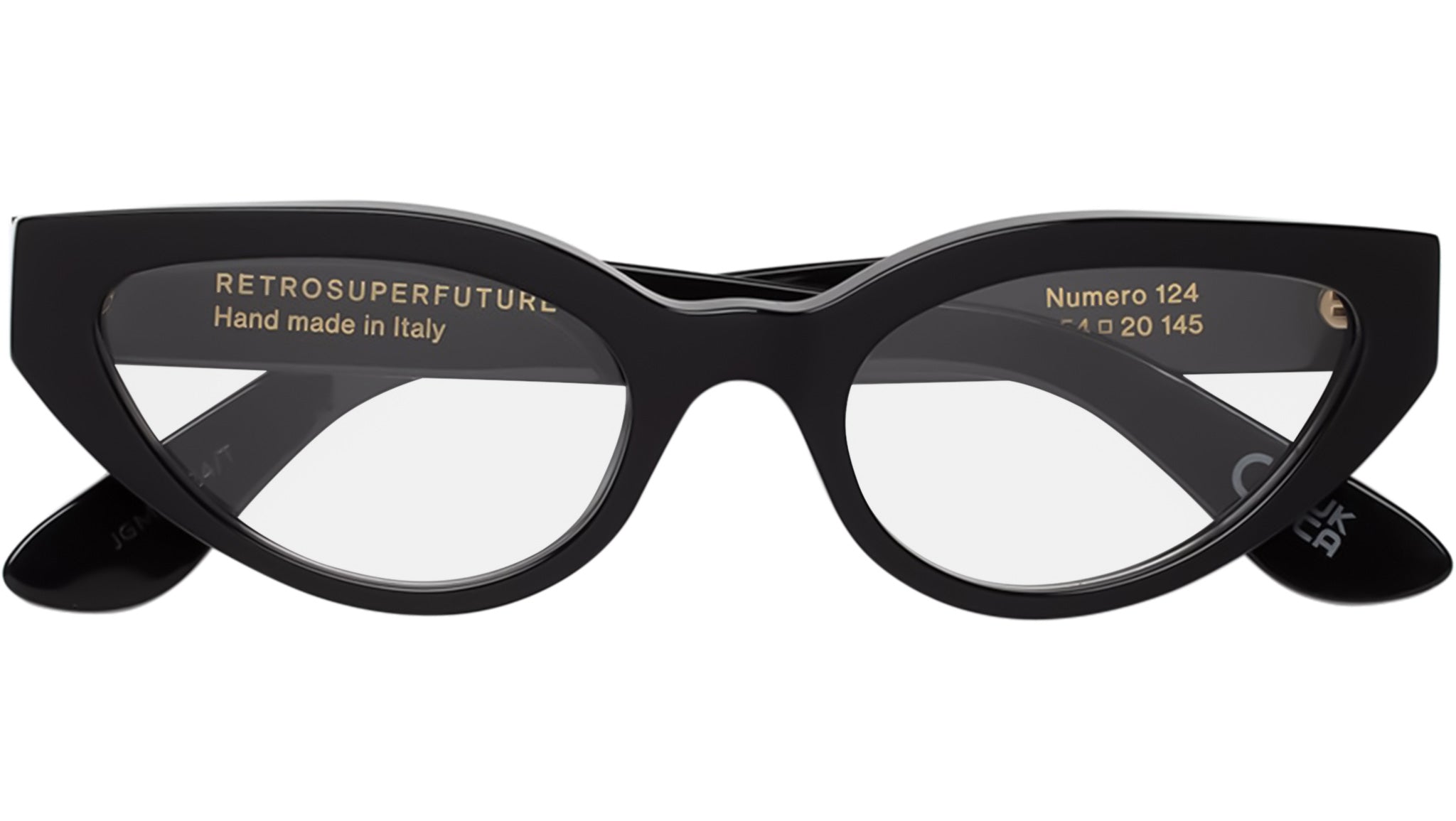 Numero 124 is a sleek yet playful cat-eye frame. Its design plays between modern essential lines and retro-inspired touches, with its clear lenses adding to that sophisticated style, this version of the N124 comes in a shiny black acetate. The sturdy construction is crafted in a functional way to maintain a lightweight frame, ensuring a comfortable wear throughout the day. Handcrafted in Italy. Sizes: Lens Width: 54 mm. Frame Front: 0 mm. Frame Side: 145 mm.
