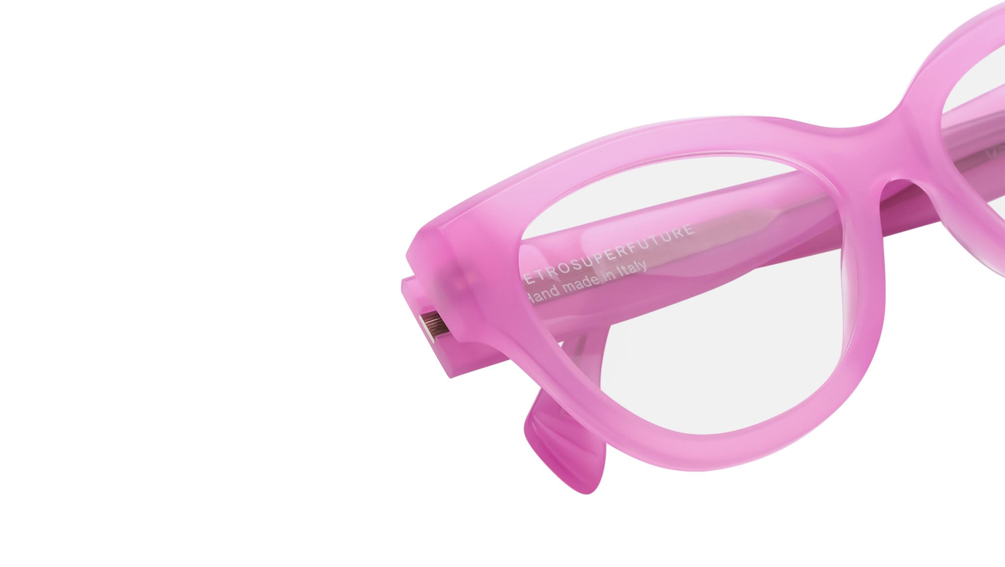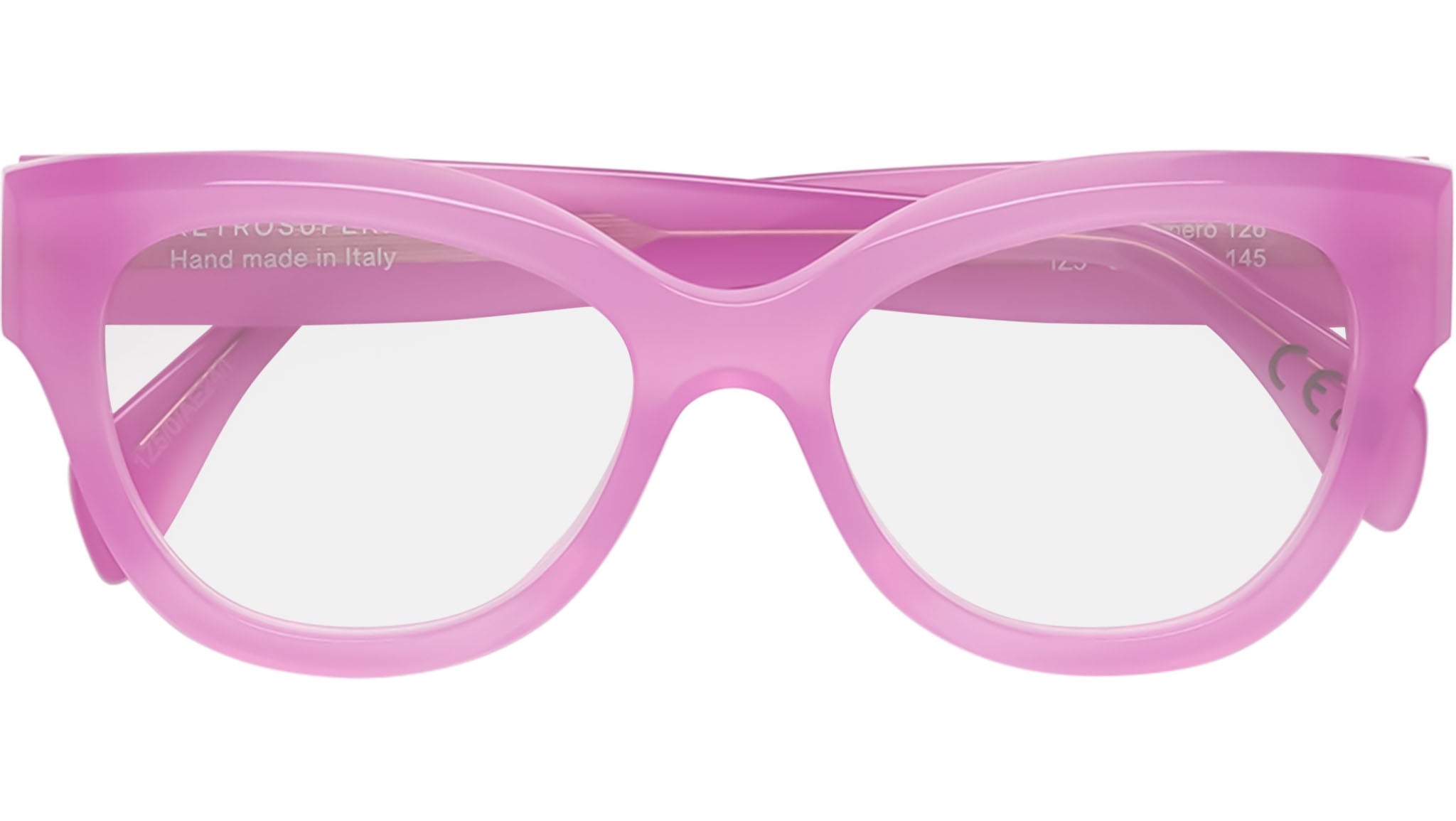 Numero 126 showcases a bold, oversized cat-eye design. The design features a distinct silhouette with rounded edges and sculpted rims, creating a playful and modern aesthetic for a versatile use. Available in a playful and unique pink acetate and clear lenses. Handcrafted in Italy. Sizes: Lens Width: 53 mm. Frame Front: 0 mm. Frame Side: 145 mm.