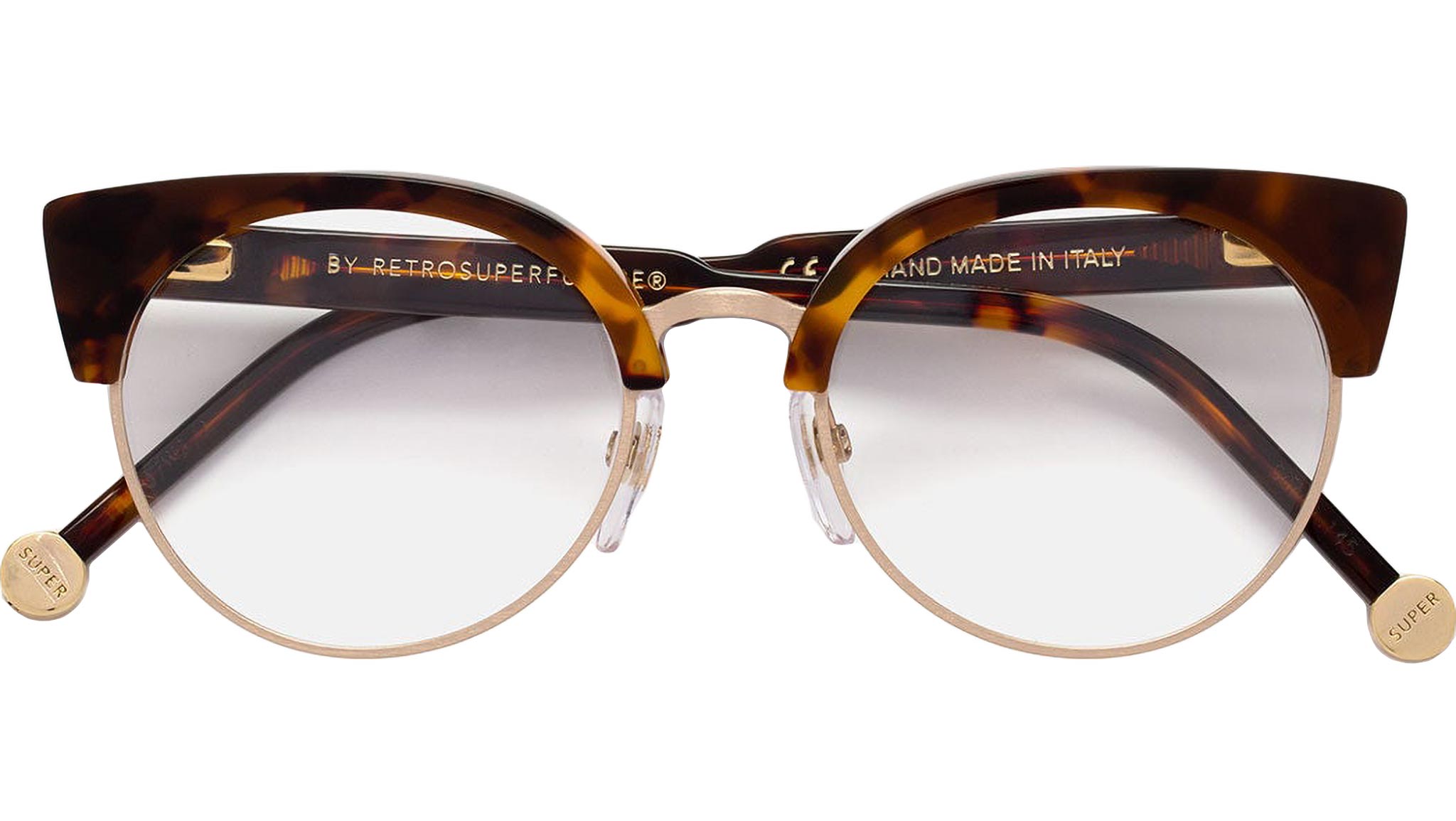 Numero 30 by Retrosuperfuture Classic Havana is an iconic piece of eyewear built from a combination of metal and acetate. The rounded lenses are wrapped in custom-made sturdy metal rings, which in turn are fixed to two sleek and smooth acetate brows. This model sports a rich Havana acetate and gold metalwork. Prescription lenses not included.