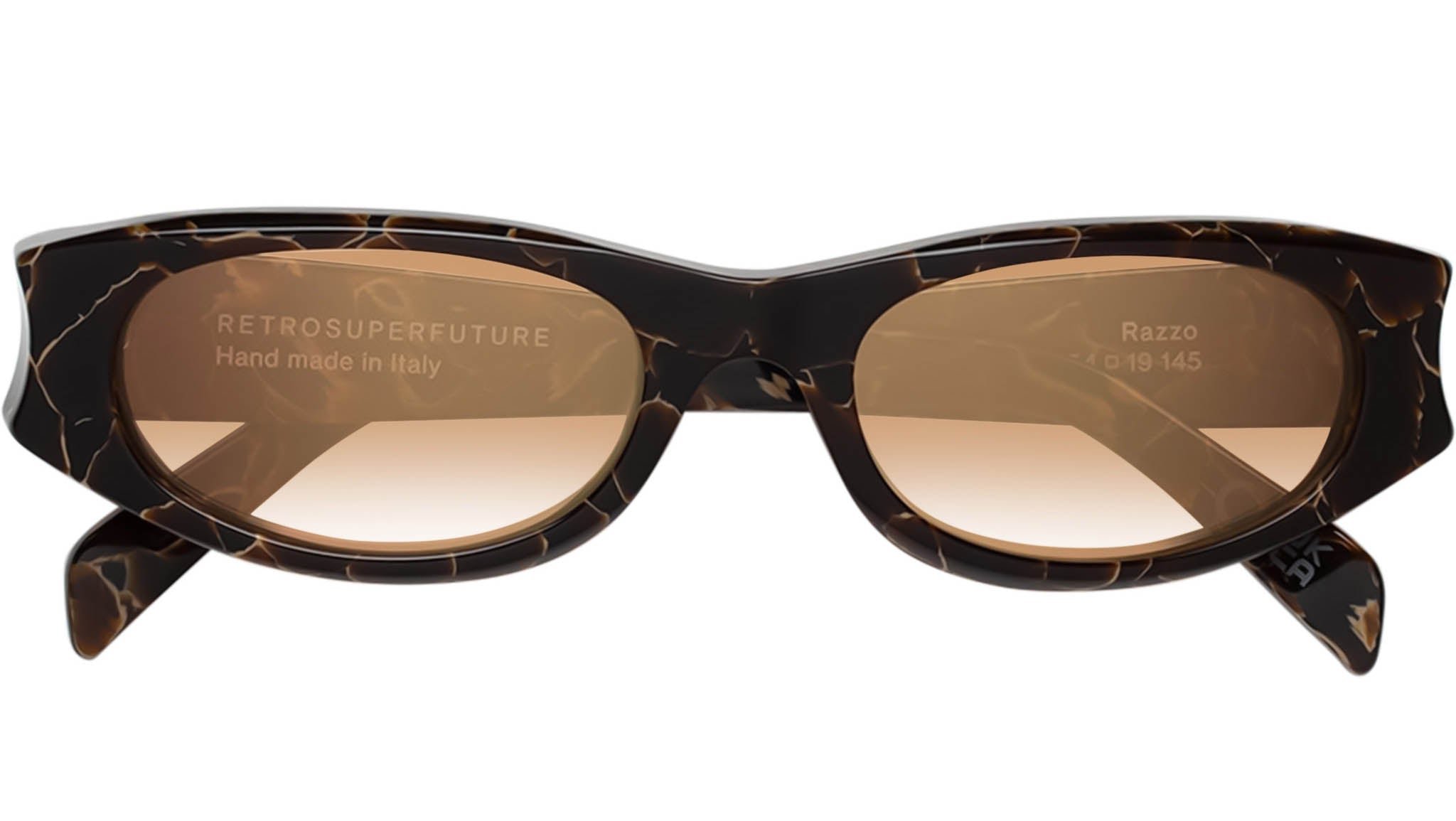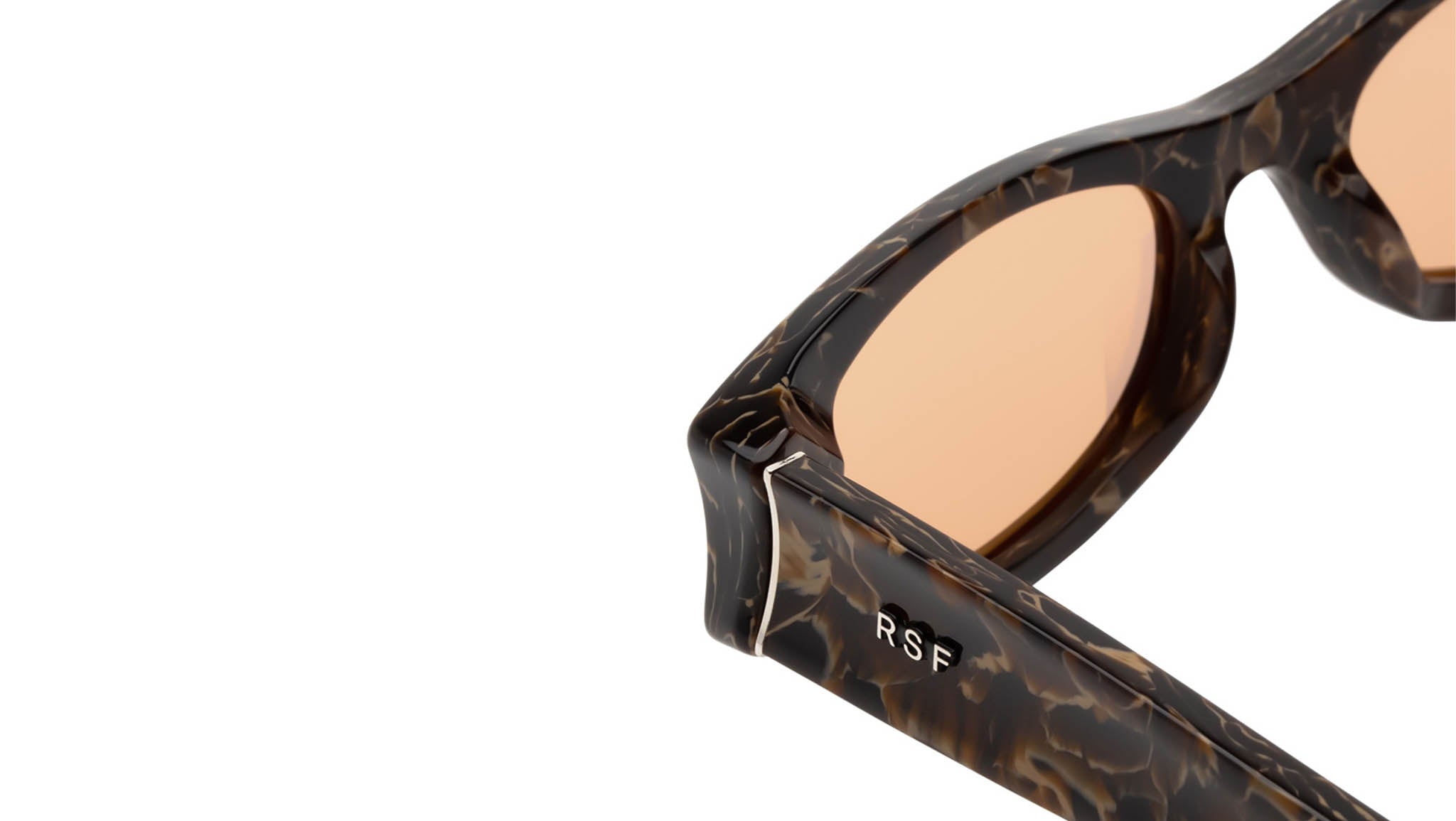 Razzo rides fast. Its unique low-set design unites the Y2K fashion aesthetics to the cross-over sports culture infused frames. Its unique temple design extends on to the sides for a one of a kind thermoformed acetate temples, underlining its craftsmanship as well as distinctive and fast paced character. For this version of the Razzo, an exceptional pattern acetate is paired with characteristic pink lenses. Handcrafted in Italy. Sizes: R. Lens Width: 54 mm. Frame Front: Frame Side: 145 mm. Product Code Size R: LS3.