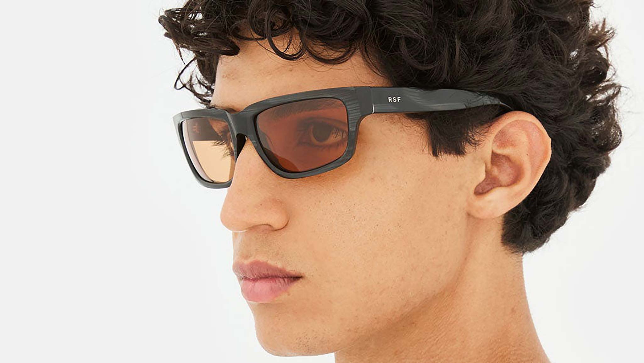 Thelonius stretches a classic acetate frame into an sports influenced semi wrap around story. With its signature RSF sturdy acetate build, this frame crosses over on multiple uses and functions with technical, classic as well as street-infused languages. This version of the Thelonius comes in a rich and unique striated black acetate paired with blazing warm lenses. Handcrafted in Italy. Sizes: R. Lens Width: 60 mm. Frame Front: Frame Side: 140 mm. Product Code Size R: MG4.
