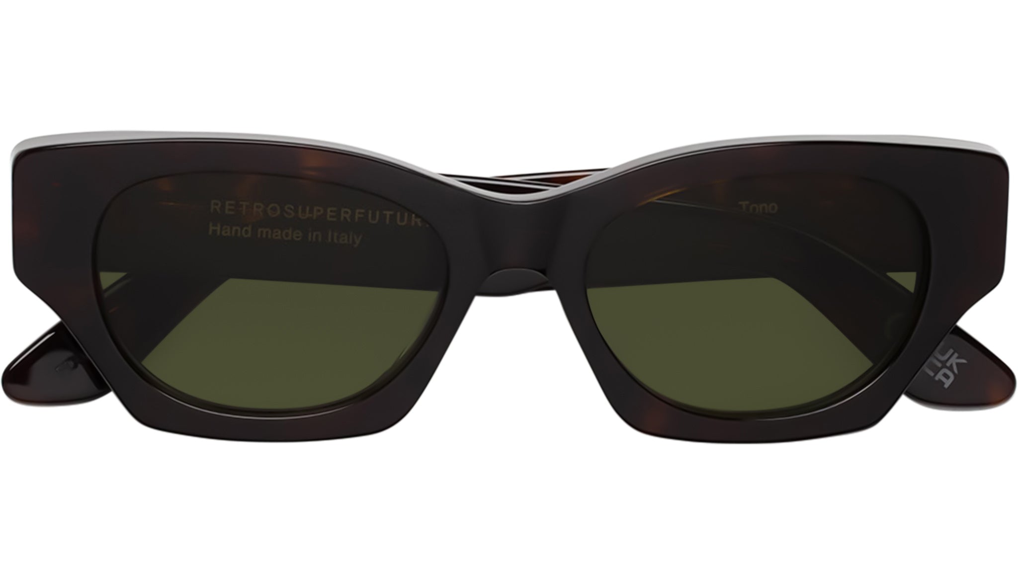 Tono definitely sets the tone, with its sturdy form which highlights its unique curves and cuts. The frame builds on strong classical foundations as it flirts with fashion, resulting in a unique and determined unisex silhouette. This version of the Tono comes in a rich and elegant dark tortoise acetate paired with classic green lenses. Handcrafted in Italy. Sizes: R. Lens Width: 52 mm. Frame Front: Frame Side: 145 mm. Product Code Size R: FD0.