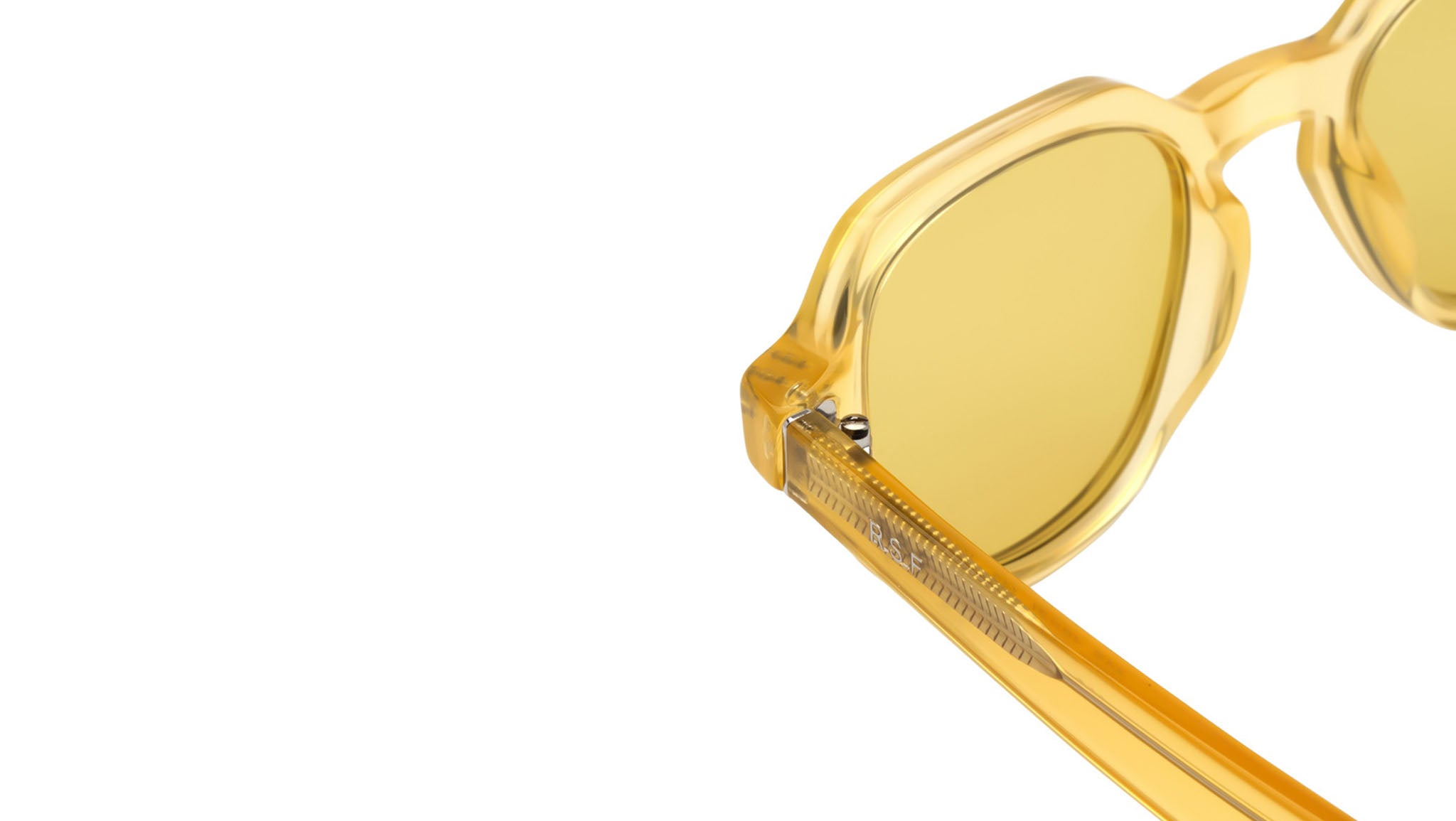 Voce features a sleek, round frame characterised by a timeless language of classic sophistication. Its essential design is topped off with two metal rivet decors on the frontal frame and slim, flexible acetate temples on the side, underlining its refined character. This version of the Voce comes in a playful crystal yellow acetate with matching mellow yellow lenses. Handcrafted in Italy. Sizes: R. Lens Width: 49 mm. Frame Front: Frame Side: 145 mm. Product Code Size R: 4AS.