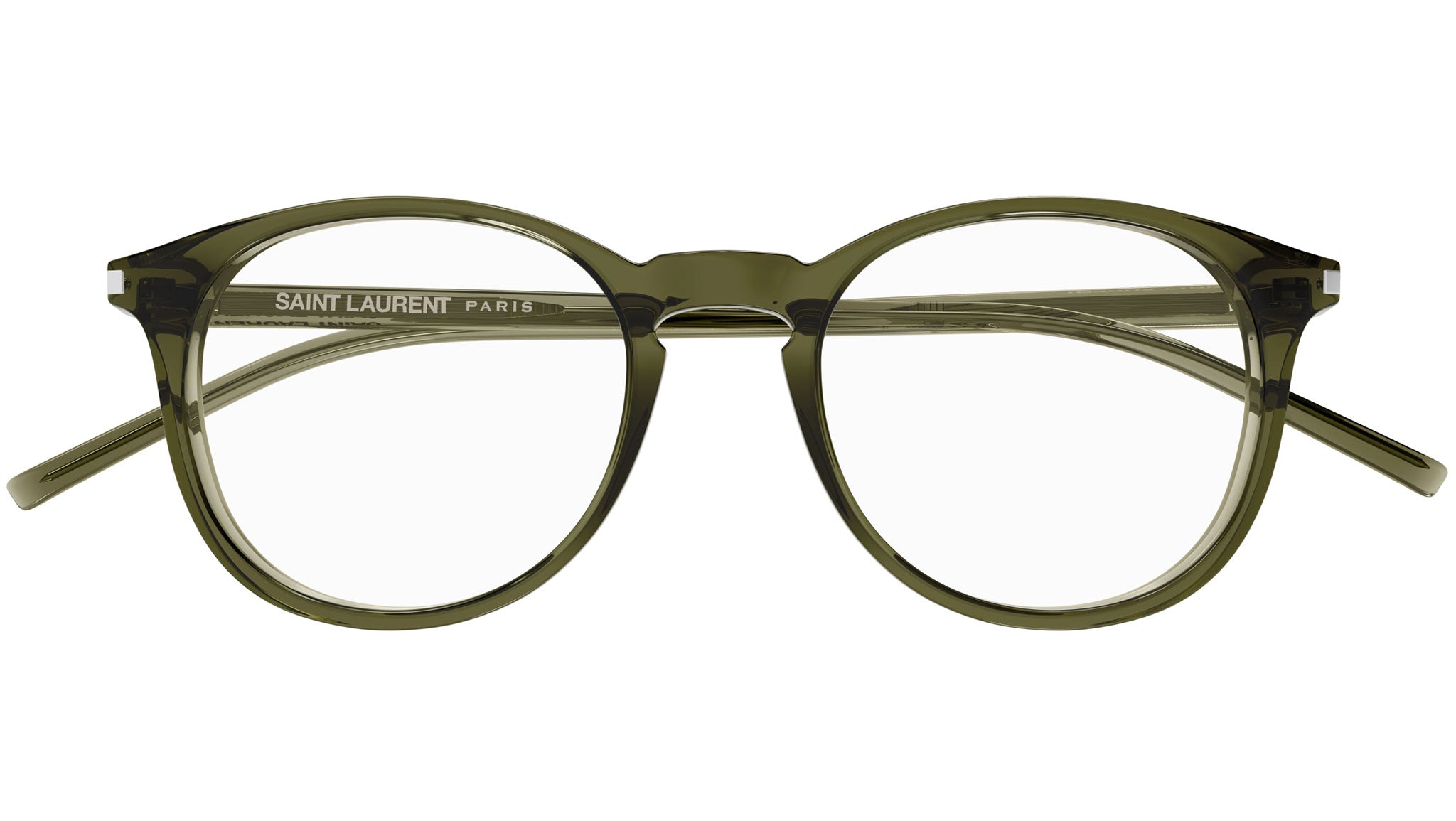 Occhiali da vista Saint Laurent modello SL 106 linea Classic codice colore 012 verde trasparente lucido in acetato forma panthos con aste color verde.