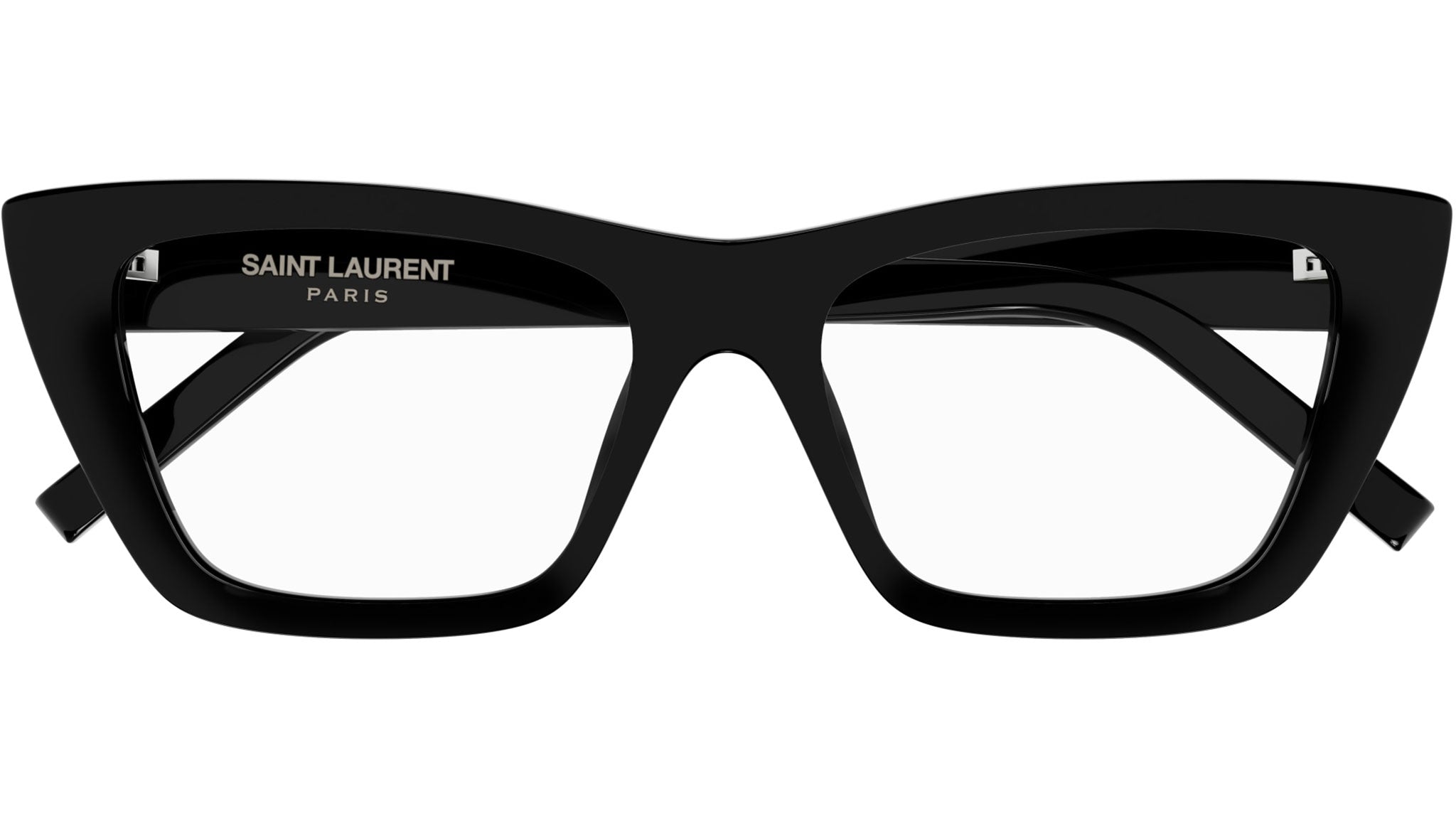 Occhiali da vista Saint Laurent modello SL 276 MICA OPT linea New Wave codice colore 001 nero lucido tinta unita in acetato riciclato forma cat eye con aste color nero.