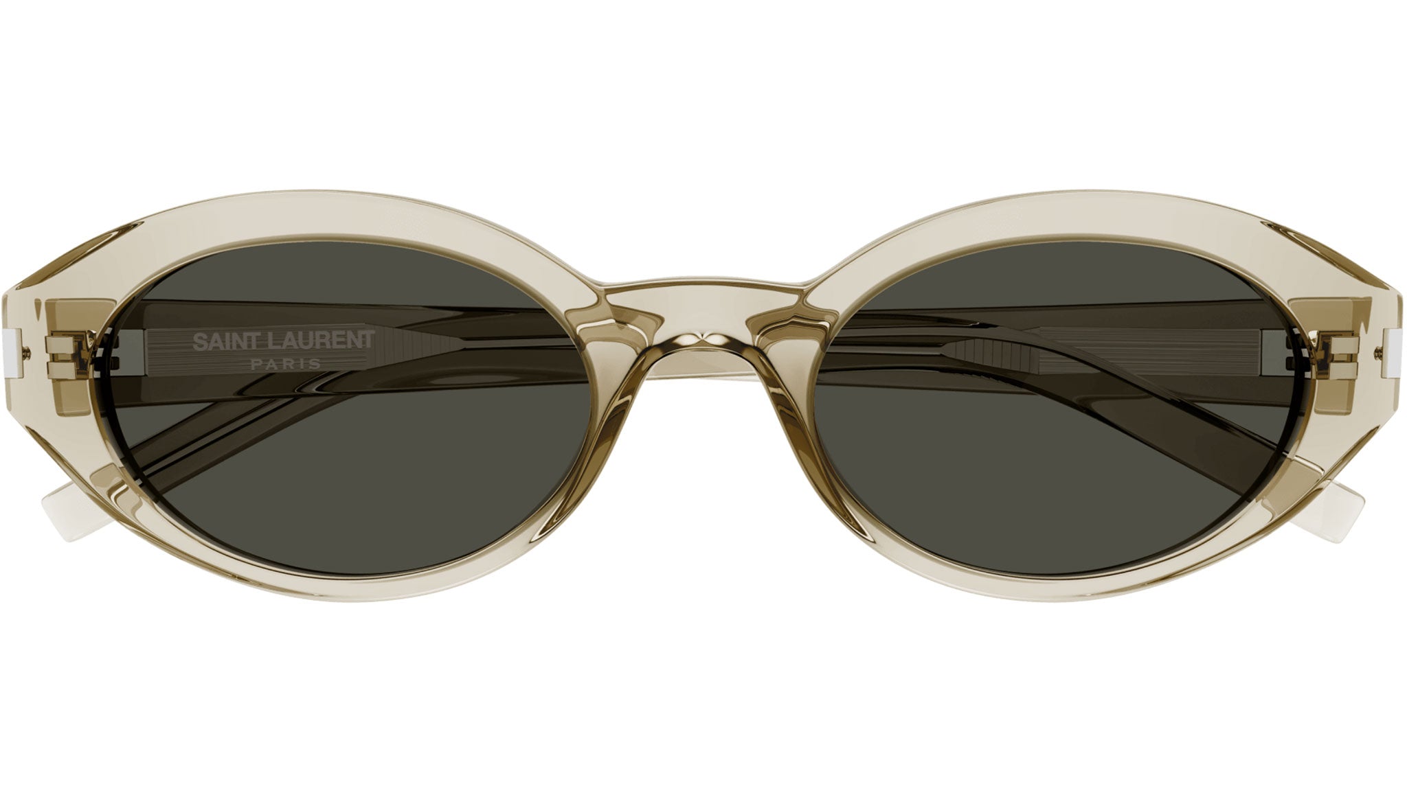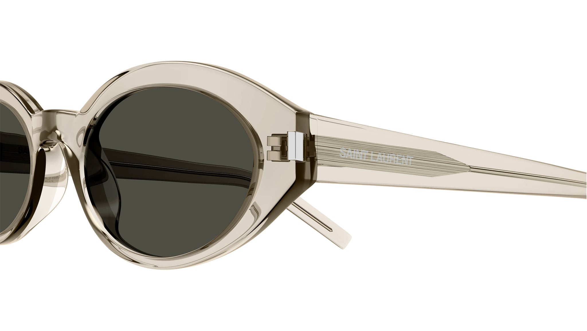 Occhiali da sole Saint Laurent linea New Wave modello SL 567 variante colore 003 crema trasparente con lenti color grigio tinta unita.